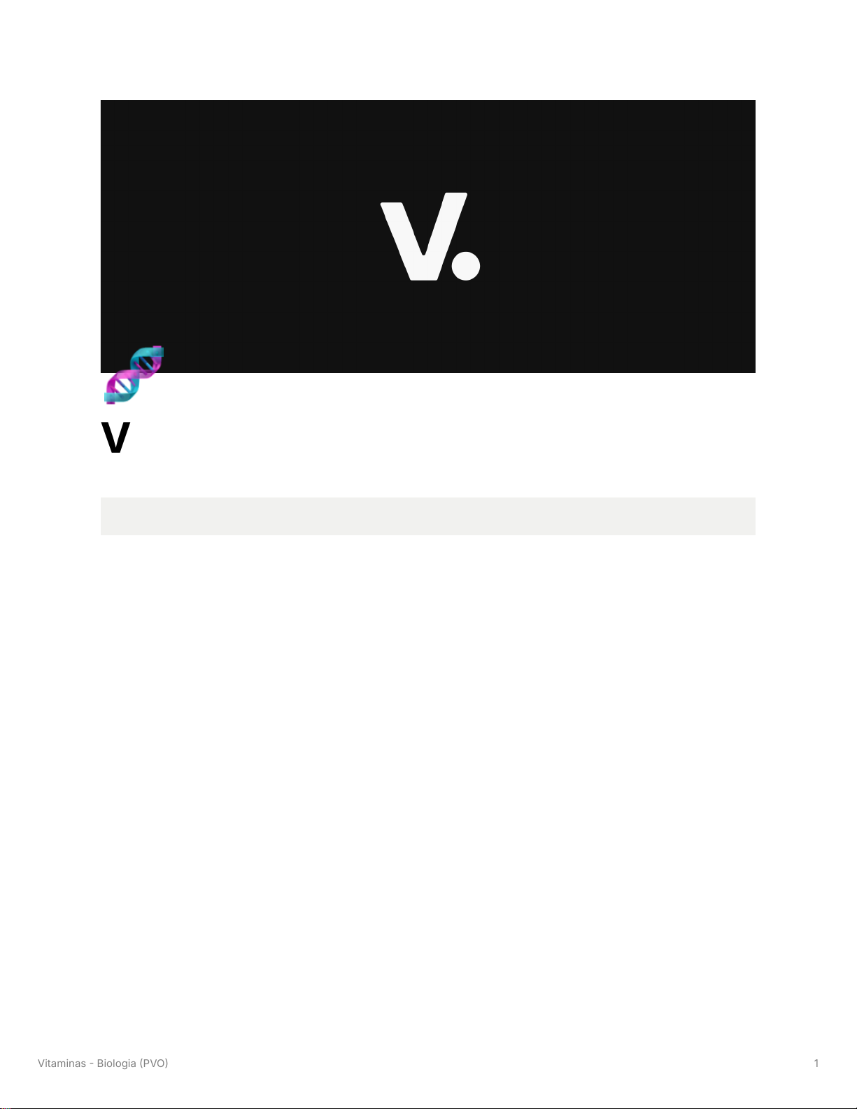 Vitaminas Biologia PVO 1 🧬 Vitaminas - Biologia (PVO) Apostila teórica � As vitaminas são micromoléculas orgânicas com algumas particularidades: a� Apresentam uma absorção direta no trato digestório do ser humano (não são digeridas); b� Agem como alimentos reguladores do metabolismo; c� Podem atacar como cofatores enzimáticos; i� Observação: alguns minerais também agem como cofatores enzimáticos; ii� Cofatores enzimáticos são componentes que se associam a enzimas para garantir a eficiência da atividade catalítica da enzima. d� Algumas vitaminas agem como antioxidantes: i� A, C e E; ii� Antioxidantes: combatem radicais livres, evitando o envelhecimento celular precoce. � A divisão das vitaminas engloba dois grandes grupos: D i s p o n i b i l i z a d o p o r M i n e r v a . B y M i n e r v a . Vitaminas Biologia PVO 2 a� Vitaminas hidrossolúveis (solúveis em água): vitaminas do complexo B e vitamina C. i� Excesso de vitaminas hidrossolúveis pode favorecer formação de cálculos renais. b� Vitaminas lipossolúveis (solúveis em lipídios): vitaminas A, D, E e K. i� Excesso de vitaminas lipossolúveis pode desencadear hepatite tóxica. � Fontes de cada vitamina, nomenclatura e consequências decorrentes da respectiva hipovitaminose: a� B1 (tiamina): obtida em frutas, cereais, fígado, ovo e leite → hipovitaminose: beribéri (neurite grave); b� B2 (riboflavina): obtida em frutas, cereais, fígado, ovo e leite → hipovitaminose: arriboflavinose (lesões na boca); c� B3 (niacina): obtida em frutas, cereais, fígado, ovo e leite → hipovitaminose: pelagra (diarreia, demência, dermatite); d� B9 (ácido fólico): obtida em frutas, cereais, fígado, ovo e leite → hipovitaminose: anemia megaloblástica; e� B12 (cobalamina): obtida em carnes e ovos (exclusiva de origem animal) → hipovitaminose: anemia perniciosa e anemia megaloblástica; f� C (ácido ascórbico): obtida em frutas cítricas, couve e espinafre → hipovitaminose: escorbuto (perda de cabelo, sangramento, unhas quebradiças); g� A (retinol): obtida em cenoura, abóbora, fígado, ovo e leite → hipovitaminose: xeroftalmia (secura ocular) e cegueira noturna; h� D (calciferol): obtida em peixe, nozes, fígado, ovo, leite e por exposição ao sol → hipovitaminose: raquitismo (criança) e osteomalácia (adulto); i� E (tocoferol): obtida em peixe, nozes, fígado, ovo e leite → hipovitaminose: esterilidade; j� K (filoquinona): obtida a partir da microbiota intestinal → hipovitaminose: hemorragias. D i s p o n i b i l i z a d o p o r M i n e r v a . B y M i n e r v a . Vitaminas Biologia PVO 3 Anotações complementares Preencha o campo abaixo com suas anotações complementares sobre a aula. Questões Questão 01 Questão 02 D i s p o n i b i l i z a d o p o r M i n e r v a . B y M i n e r v a . Vitaminas Biologia PVO 4 Questão 03 D i s p o n i b i l i z a d o p o r M i n e r v a . B y M i n e r v a . Vitaminas Biologia PVO 5 Questão 04 Questão 05 D i s p o n i b i l i z a d o p o r M i n e r v a . B y M i n e r v a . Vitaminas Biologia PVO 6 Questão 06 Questão 07 D i s p o n i b i l i z a d o p o r M i n e r v a . B y M i n e r v a . Vitaminas Biologia PVO 7 Questão 08 Questão 09 D i s p o n i b i l i z a d o p o r M i n e r v a . B y M i n e r v a . Vitaminas Biologia PVO 8 Questão 10 D i s p o n i b i l i z a d o p o r M i n e r v a . B y M i n e r v a . Gabarito e resolução da lista sobre Vitaminas Biologia PVO 1 🧬 Gabarito e resolução da lista sobre Vitaminas - Biologia (PVO) Gabarito e resolução Questão 01 D i s p o n i b i l i z a d o p o r M i n e r v a . B y M i n e r v a . Gabarito e resolução da lista sobre Vitaminas Biologia PVO 2 Gabarito: letra A. Resolução: a acerola é uma fruta cítrica e, portanto, é rica em vitamina C, sendo importante tal vitamina para que seja prevenido o escorbuto, doença ocasionada pela hipovitaminose ligada à vitamina C. Questão 02 Gabarito: letra C. Resolução: a carência de vitamina A relaciona-se com a cegueira noturna 1. O raquitismo pode surgir em função da deficiência de vitamina D 3. O escorbuto é gerado pela deficiência, no organismo, de vitamina C 2. Por fim, o beribéri é gerado em um quadro de hipovitaminose por vitamina B1 4. D i s p o n i b i l i z a d o p o r M i n e r v a . B y M i n e r v a . Gabarito e resolução da lista sobre Vitaminas Biologia PVO 3 Questão 03 Gabarito: letra B. Resolução: a primeira afirmativa é falsa, pois as vitaminas hidrossolúveis são polares e se dissolvem em água, enquanto que as vitaminas lipossolúveis são apolares e não se dissolvem em água. A segunda afirmativa é falsa, pois as vitaminas do complexo B são hidrossolúveis. A terceira afirmativa é verdadeira, pois a vitamina C, quando em quantidades adequadas no organismo, age na prevenção do escorbuto. A quarta afirmativa é falsa, pois a vitamina que possui um papel importante para o metabolismo do cálcio e do fósforo, atuando diretamente na saúde do tecido ósseo, é a vitamina D. A quinta afirmativa é verdadeira, pois a vitamina K, além de ser encontrada nos alimentos citados, age no controle de hemorragias por participar diretamente da cascata de coagulação sanguínea. Questão 04 D i s p o n i b i l i z a d o p o r M i n e r v a . B y M i n e r v a . Gabarito e resolução da lista sobre Vitaminas Biologia PVO 4 Gabarito: letra A. Resolução: a principal fonte de produção de vitamina D decorre da exposição aos raios ultravioletas do tipo B UVB. É por tal motivo que, comumente, é dada a recomendação de que o ser humano se exponha ao sol para, com isso, ter a devida síntese de vitamina D no organismo. Questão 05 Gabarito: letra C. Resolução: a letra C traz uma afirmativa incorreta, pois a vitamina K é que age diretamente na prevenção de hemorragias. A hipovitaminose ligada à vitamina A D i s p o n i b i l i z a d o p o r M i n e r v a . B y