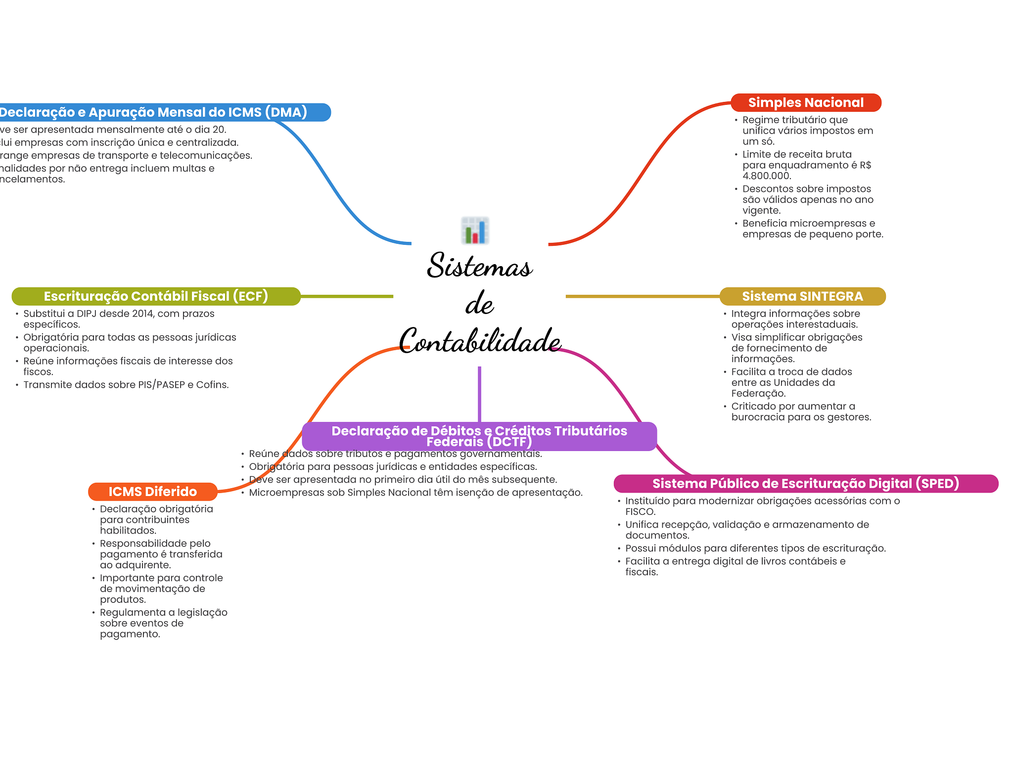 Simples Nacional Declaração e Apuração Mensal do ICMS (DMA) Regime tributário que ve ser apresentada mensalmente até dia 20. unifica vários impostos em lui empresas com inscrição única e centralizada. um só. range empresas de transporte e telecomunicações. Limite de receita bruta nalidades por não entrega incluem multas e para enquadramento é R$ ncelamentos. 4.800.000. Descontos sobre impostos são válidos apenas no ano vigente. Beneficia microempresas e empresas de pequeno porte. Sistemas Escrituração Contábil Fiscal (ECF) de Sistema SINTEGRA Substitui a DIPJ desde 2014, com prazos Integra informações sobre específicos. operações interestaduais. Obrigatória para todas as pessoas jurídicas Contabilidade Visa simplificar obrigações operacionais. de fornecimento de Reúne informações fiscais de interesse dos informações. fiscos. Facilita a troca de dados Transmite dados sobre PIS/PASEP e Cofins. entre as Unidades da Federação. Criticado por aumentar a burocracia para OS gestores. Declaração de Débitos e Créditos Tributários Federais (DCTF) Reúne dados sobre tributos e pagamentos governamentais. Obrigatória para pessoas jurídicas e entidades específicas. Deve ser apresentada no primeiro dia útil do mês subsequente. ICMS Diferido Sistema Público de Escrituração Digital (SPED) Microempresas sob Simples Nacional têm isenção de apresentação. Instituído para modernizar obrigações acessórias com O Declaração obrigatória FISCO. para contribuintes habilitados. Unifica recepção, validação e armazenamento de documentos. Responsabilidade pelo pagamento é transferida Possui módulos para diferentes tipos de escrituração. ao adquirente. Facilita a entrega digital de livros contábeis e fiscais. Importante para controle de movimentação de produtos. Regulamenta a legislação sobre eventos de pagamento.