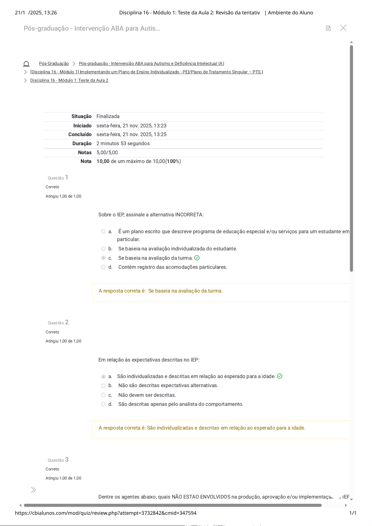 Pós-Graduação Pós-graduação - Intervenção ABA para Autismo e Deficiência Intelectual (A) [Disciplina 16 - Módulo 1] Implementando um Plano de Ensino Individualizado - PEI/Plano de Tratamento Singular – PTS I Disciplina 16 - Módulo 1: Teste da Aula 2 Questão 1 Correto Atingiu 1,00 de 1,00 Questão 2 Correto Atingiu 1,00 de 1,00 Questão 3 Correto Atingiu 1,00 de 1,00 Sobre o IEP, assinale a alternativa INCORRETA: a. É um plano escrito que descreve programa de educação especial e/ou serviços para um estudante em particular. b. Se baseia na avaliação individualizada do estudante. c. Se baseia na avaliação da turma. d. Contém registro das acomodações particulares. A resposta correta é: Se baseia na avaliação da turma. Em relação às expectativas descritas no IEP: a. São individualizadas e descritas em relação ao esperado para a idade. b. Não são descritas expectativas alternativas. c. Não devem ser descritas. d. São descritas apenas pelo analista do comportamento. A resposta correta é: São individualizadas e descritas em relação ao esperado para a idade. Dentre os agentes abaixo, quais NÃO ESTAO ENVOLVIDOS na produção, aprovação e/ou implementação do IEP Situação Finalizada Iniciado sexta-feira, 21 nov. 2025, 13:23 Concluído sexta-feira, 21 nov. 2025, 13:25 Duração 2 minutos 53 segundos Notas 5,00/5,00 Nota 10,00 de um máximo de 10,00(100%) Pós-graduação - Intervenção ABA para Autis… 21/11/2025, 13:26 Disciplina 16 - Módulo 1: Teste da Aula 2: Revisão da tentativa | Ambiente do Aluno https://cbialunos.com/mod/quiz/review.php?attempt=3732842&cmid=347594 1/1 https://cbialunos.com/course/index.php?categoryid=7 https://cbialunos.com/course/view.php?id=349 https://cbialunos.com/course/section.php?id=13261 https://cbialunos.com/mod/quiz/view.php?id=347594 https://cbialunos.com/my/courses.php https://cbialunos.com/course/view.php?id=349 https://cbialunos.com/course/view.php?id=349&mb2sct=60