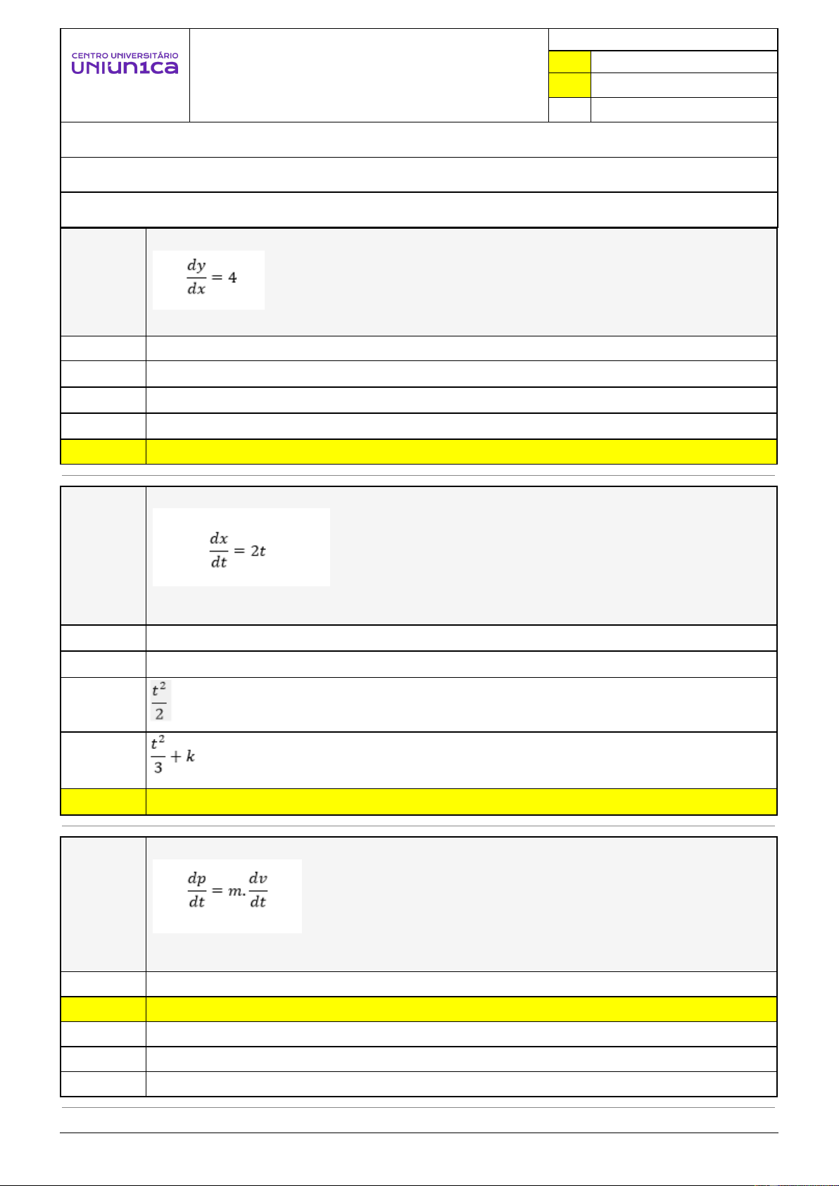 Pincel Atômico - 16/10/2025 21:24:17 1/3 DOUGLAS BUENO TEXIEIRA Avaliação Online (SALA EAD) - Capitulos/Referencias 4,5,6 Atividade finalizada em 06/10/2025 21:25:20 (5128752 / 1) LEGENDA Resposta correta na questão # Resposta correta - Questão Anulada X Resposta selecionada pelo Aluno Disciplina: CÁLCULO III [1002115] - Avaliação com 5 questões, com o peso total de 15,00 pontos [capítulos - 4,5,6] Turma: Graduação: Engenharia Ambiental e Sanitária - Grupo: MARÇO/2024 - EAS/MARÇ24 [110105] Aluno(a): 91573373 - DOUGLAS BUENO TEXIEIRA - Respondeu 5 questões corretas, obtendo um total de 15,00 pontos como nota [360815_169740] Questão 001 Analise a expressão abaixo: A solução geral para a equação é 4x+1 x2-4 x2+4x x2+4 X 4x+k [360815_169739] Questão 002 Analise a expressão abaixo: A solução para a equação do primeiro grau dada é t2-3k t2 X t2+k [360815_169738] Questão 003 Analise a expressão abaixo: A expressão acima representa uma equação diferencial transcendental. X uma equação diferencial de primeiro grau. Uma equação diferencial de segundo grau. uma equação diferencial de ordem n. uma equação diferencial com duas raízes. Pincel Atômico - 16/10/2025 21:24:17 2/3 [360816_169761] Questão 004 Analise a equação abaixo: A solução geral para e equação é X [360817_169775] Questão 005 Analise a imagem abaixo: Fonte: SILVA, C. B. C; FAGUNDES, B. B; RIBEIRO, J. D.; TONEL, A. P. Forças no sistema de referência acelerado de um pêndulo: estudo teórico e resultados experimentais. Rev. Bras. Ensino Fís. vol.42 São Paulo 2020 Epub Nov 25, 2019. https://doi.org/10.1590/1806-9126-rbef-2019-0085. De acordo com interpretação da imagem, avalie as afirmativas abaixo: I. O movimento realizado pelo balanço e o menino pode ser representado por uma equação diferencial. II. As variáveis que podem ser utilizadas para modelar o movimento do balanço estão restritas unicamente a este. III. Todo movimento igual ao do balanço pode ser expresso por uma equação diferencial de ordem n. É correto o que se afirma em: X I, apenas. Pincel Atômico - 16/10/2025 21:24:17 3/3 II, apenas. I, II e III. II e III, apenas. III, apenas.