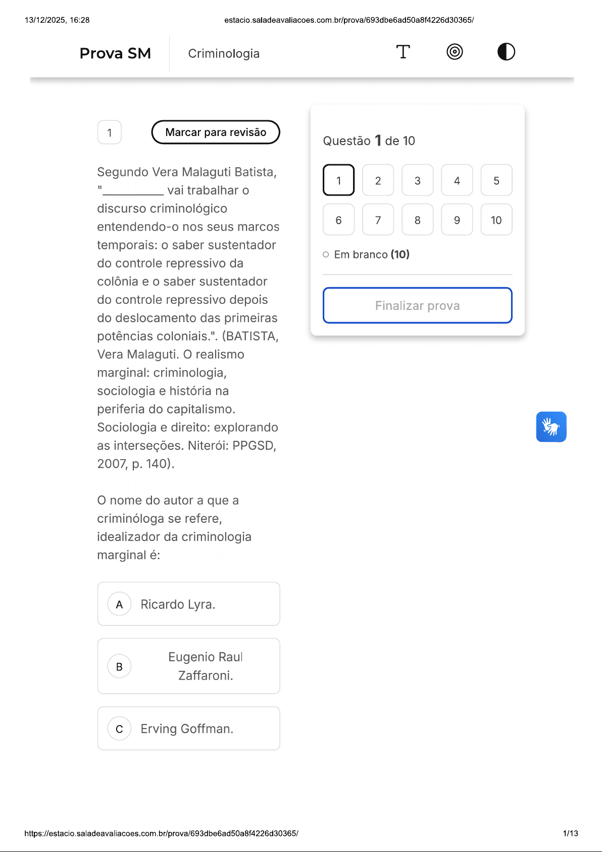 13/12/2025, 16:28 estacio.saladeavaliacoes.com.br/prova/693dbe6ad50a8f4226d30365/ Prova SM Criminologia T 1 Marcar para revisão Questão 1 de 10 Segundo Vera Malaguti Batista, 1 2 3 4 5 vai trabalhar discurso criminológico 6 7 8 9 10 entendendo-o nos seus marcos temporais: saber sustentador Em branco (10) do controle repressivo da colônia e saber sustentador do controle repressivo depois Finalizar prova do deslocamento das primeiras potências coloniais.". (BATISTA, Vera Malaguti. realismo marginal: criminologia, sociologia e história na periferia do capitalismo. Sociologia e direito: explorando as interseções. Niterói: PPGSD, 2007, p. 140). nome do autor a que a criminóloga se refere, idealizador da criminologia marginal é: A Ricardo Lyra. Eugenio Raul Zaffaroni. c Erving Goffman. 1/1313/12/2025, 16:28 estacio.saladeavaliacoes.com.br/prova/693dbe6ad50a8f4226d30365/ Juarez Cirino dos D Santos. E Nina Rodrigues. 2 Marcar para revisão Com assentamento do campo da Criminologia e, sobretudo, do debate que foi instalado na América Latina e no Brasil a partir do entrelaçamento do giro da reação social com os aportes marxistas, tradição que já era a/o das/os criminólogas/os que ocuparam esse processo, algumas arestas pendentes às análises da crítica criminológica passaram a ser apontadas. Desta maneira, levando em consideração os realismos marginais e crítica criminológica latino-americana, analise os itens abaixo e, em seguida, assinale a alternativa correta. I. No panorama do "realismo marginal", inaugurou-se um campo de estudos que parte do diagnóstico de que sistema penal foi historicamente e ainda é formulado pelo racismo estrutural. II. Perceber que é racismo que, no Brasil, enviesa essas ideologias, é fundamental para 2/1313/12/2025, 16:28 estacio.saladeavaliacoes.com.br/prova/693dbe6ad50a8f4226d30365/ classificá-lo como um instrumento do projeto e das táticas de subjugação raciais que se materializam através dos discursos criminológicos e do sistema penal. III. No crescente campo da "Criminologia Feminista", reivindica-se que epistemologias feministas possam, não só amparar analiticamente, como também produzir transformações práticas, especialmente, nos casos em que somos vítimas ou autoras de atos em conflito com a lei. IV. Os "estudos queer" são um campo na grande área dos "estudos de gênero", que reflete sobre como a experiência do sexo/gênero em nossa sociedade também é atravessada pelas relações de poder, tendo surgido e se consolidado no Brasil nos anos 1980. Estão corretos os itens: A I, e IV, apenas. e III, apenas. c I e IV, apenas. 3/1313/12/2025, 16:28 D I, e III, apenas. E I, II, III e IV. 3 Marcar para revisão "Na história recente, primeiro momento de interesse da esquerda pela repressão à criminalidade é marcado por reivindicações de extensão da reação punitiva a condutas tradicionalmente imunes à intervenção do sistema penal, surgindo fundamentalmente com a atuação de movimentos populares, portadores de aspirações de grupos sociais específicos, como os movimentos feministas, que, notadamente a partir dos anos 1970, incluíram em suas plataformas de luta a busca de punições exemplares para autores de atos violentos contra mulheres, febre repressora que logo se estendendo aos movimentos ecológicos, igualmente reivindicantes da intervenção do sistema penal no combate aos atentados ao meio ambiente, acaba por atingir os mais amplos setores da esquerda". KARAM, Maria Lucia. A esquerda punitiva. BLOG DA BOITEMPO, 2015. Disponível 4/1313/12/2025, 16:28 estacio.saladeavaliacoes.com.br/prova/693dbe6ad50a8f4226d30365/ em: Acesso em 04/05/2022KARAM, 2015). A raiz do pensamento da doutrina retratada pelo trecho acima é chamada de: Criminalização da A pobreza. Esquerda punitiva. Direito penal do c inimigo. D Criminologia crítica. Encarceramento em E massa. 4 Marcar para revisão Considere a seguinte citação: "Desse modo, fui sentindo que também na dogmática jurídica havia algo que não encaixava. Não demorei muito para advertir que a chave estava na política criminológica e em sua estreita dependência da política geral, em perceber que a dogmática jurídico-penal é um imenso esforço de racionalização de uma programação irrealizável e que a criminologia tradicional ou etiológica é um discurso de 5/1313/12/2025, 16:28 estacio.saladeavaliacoes.com.br/prova/693dbe6ad50a8f4226d30365/ poder de origem racista e sempre colonialista". (ZAFFARONI, Eugenio Raúl. Criminología: aproximación desde un margen. Bogotá: Temis, 1988, p. 11) É possível dizer que trecho integra a base da seguinte teoria criminológica: A Criminologia marginal. Criminologia crítica. c Criminologia queer. D Criminologia punitiva. E Criminologia marxista. 5 Marcar para revisão (2021 PC-PA - Delegado de Polícia Civil - ADAPTADA) Assinale a alternativa que engloba um objeto de estudo criminológico. A A nacionalidade. B objeto do crime. 6/1313/12/2025, 16:28 estacio.saladeavaliacoes.com.br/prova/693dbe6ad50a8f4226d30365/ c dever-ser. D Movimentos artísticos. Controle social do E crime. 6 Marcar para revisão (2021 - PC-MS - Delegado de Polícia - ADAPTADA) Considerando os conceitos doutrinários de Direito Penal, de Criminologia e de Política Criminal, assinale a alternativa CORRETA. https://estacio.saladeavaliacoes.com.br/prova/693dbe6ad50a8f4226d30365/ 7/1313/12/2025, 16:28 estacio.saladeavaliacoes.com.br/prova/693dbe6ad50a8f4226d30365/ O Direito Penal é conjunto de normas jurídicas que preveem os crimes e lhes cominam sanções, bem como disciplinam a incidência e a validade de tais A normas, a estrutura geral do crime e a aplicação e a execução das sanções cominadas, sendo necessariamente uma ciência empírica. A Criminologia é uma disciplina de caráter preponderantemente dogmático e representa a atividade intelectual que estuda os processos de criação das normas penais e das normas sociais que est