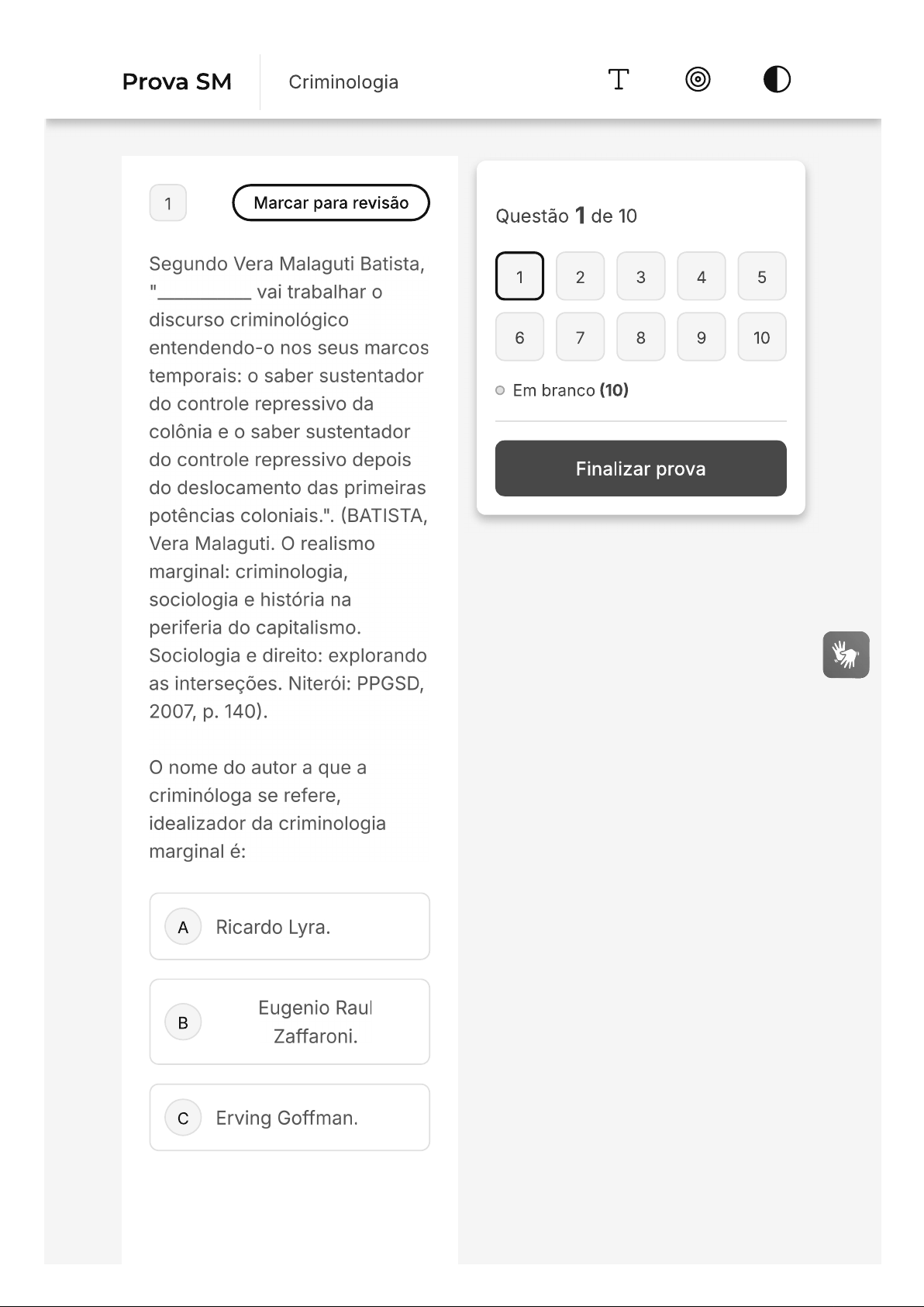 Prova SM Criminologia T 1 Marcar para revisão Questão 1 de 10 Segundo Vera Malaguti Batista, 1 2 3 4 5 vai trabalhar o discurso criminológico 6 7 8 9 10 entendendo-o nos seus marcos temporais: saber sustentador Em branco (10) do controle repressivo da colônia e saber sustentador do controle repressivo depois Finalizar prova do deslocamento das primeiras potências coloniais.". (BATISTA, Vera Malaguti. realismo marginal: criminologia, sociologia e história na periferia do capitalismo. Sociologia e direito: explorando as interseções. Niterói: PPGSD, 2007, p. 140). nome do autor a que a criminóloga se refere, idealizador da criminologia marginal é: A Ricardo Lyra. Eugenio Raul Zaffaroni. c Erving Goffman.Juarez Cirino dos D Santos. E Nina Rodrigues. 2 Marcar para revisão Com assentamento do campo da Criminologia e, sobretudo, do debate que foi instalado na América Latina e no Brasil a partir do entrelaçamento do giro da reação social com os aportes marxistas, tradição que já era a/o das/os criminólogas/os que ocuparam esse processo, algumas arestas pendentes às análises da crítica criminológica passaram a ser apontadas. Desta maneira, levando em consideração os realismos marginais e crítica criminológica latino-americana, analise os itens abaixo e, em seguida, assinale a alternativa correta. I. No panorama do "realismo marginal", inaugurou-se um campo de estudos que parte do diagnóstico de que o sistema penal foi historicamente e ainda é formulado pelo racismo estrutural. II. Perceber que é racismo que, no Brasil, enviesa essas ideologias, é fundamental paraclassificá-lo como um instrumento do projeto e das táticas de subjugação raciais que se materializam através dos discursos criminológicos e do sistema penal. III. No crescente campo da "Criminologia Feminista", reivindica-se que epistemologias feministas possam, não só amparar analiticamente, como também produzir transformações práticas, especialmente, nos casos em que somos vítimas ou autoras de atos em conflito com a lei. IV. Os "estudos queer" são um campo na grande área dos "estudos de gênero", que reflete sobre como a experiência do sexo/gênero em nossa sociedade também é atravessada pelas relações de poder, tendo surgido e se consolidado no Brasil nos anos 1980. Estão corretos os itens: A I, e IV, apenas. e III, apenas. c e IV, apenas.D I, e III, apenas. E I, II, III e IV. 3 Marcar para revisão "Na história recente, o primeiro momento de interesse da esquerda pela repressão à criminalidade é marcado por reivindicações de extensão da reação punitiva a condutas tradicionalmente imunes à intervenção do sistema penal, surgindo com a atuação de movimentos populares, portadores de aspirações de grupos sociais específicos, como os movimentos feministas, que, notadamente a partir dos anos 1970, incluíram em suas plataformas de luta a busca de punições exemplares para autores de atos violentos contra mulheres, febre repressora que logo se estendendo aos movimentos ecológicos, igualmente reivindicantes da intervenção do sistema penal no combate aos atentados ao meio ambiente, acaba por atingir os mais amplos setores da esquerda". KARAM, Maria Lucia. A esquerda punitiva. BLOG DA BOITEMPO, 2015. Disponívelem: Acesso em 04/05/2022KARAM, 2015). A raiz do pensamento da doutrina retratada pelo trecho acima é chamada de: Criminalização da A pobreza. Esquerda punitiva. Direito penal do c inimigo. D Criminologia crítica. Encarceramento em E massa. 4 Marcar para revisão Considere a seguinte citação: "Desse modo, fui sentindo que também na dogmática jurídica havia algo que não encaixava. Não demorei muito para advertir que a chave estava na política criminológica e em sua estreita dependência da política geral, em perceber que a dogmática jurídico-penal é um imenso esforço de racionalização de uma programação irrealizável e que a criminologia tradicional ou etiológica é um discurso depoder de origem racista e sempre colonialista". (ZAFFARONI, Eugenio Raúl. Criminología: aproximación desde un margen. Bogotá: Temis, 1988, p. 11) É possível dizer que trecho integra a base da seguinte teoria criminológica: A Criminologia marginal. Criminologia crítica. c Criminologia queer. D Criminologia punitiva. E Criminologia marxista. 5 Marcar para revisão (2021 PC-PA - Delegado de Polícia Civil - ADAPTADA) Assinale a alternativa que engloba um objeto de estudo criminológico. A A nacionalidade. objeto do crime.dever-ser. D Movimentos artísticos. Controle social do E crime. 6 Marcar para revisão (2021 - PC-MS - Delegado de Polícia - ADAPTADA) Considerando os conceitos doutrinários de Direito Penal, de Criminologia e de Política Criminal, assinale a alternativa CORRETA.O Direito Penal é conjunto de normas jurídicas que preveem os crimes e lhes cominam sanções, bem como disciplinam a incidência e a validade de tais A normas, a estrutura geral do crime e a aplicação e a execução das sanções cominadas, sendo necessariamente uma ciência empírica. A Criminologia é uma disciplina de caráter preponderantemente dogmático e representa a atividade intelectual que estuda os processos de criação das normas penais e das normas sociais que estão relacionadas com comportamento desviante, os processos de infração e de desvio destas normas e a reação social.Na Criminologia reúne-se pesquisas sobre a questão criminal, com base na c metodologia empírica de análise e de observação da realidade. São necessariamente idênticos os objetos D de estudo do Direito Penal, Criminologia e Política Criminal. Diferentemente do Direito Penal, a Política Criminal pretende conhecer a realidade para explicá-la, enquanto E aquela ciência valora, ordena e orienta a realidade, com apoio de uma série de critérios transdisciplinares. 7 Marcar para revisão Chama-se neutralização da vítima:abandono da vítima A na relação jurídico- processual penal.