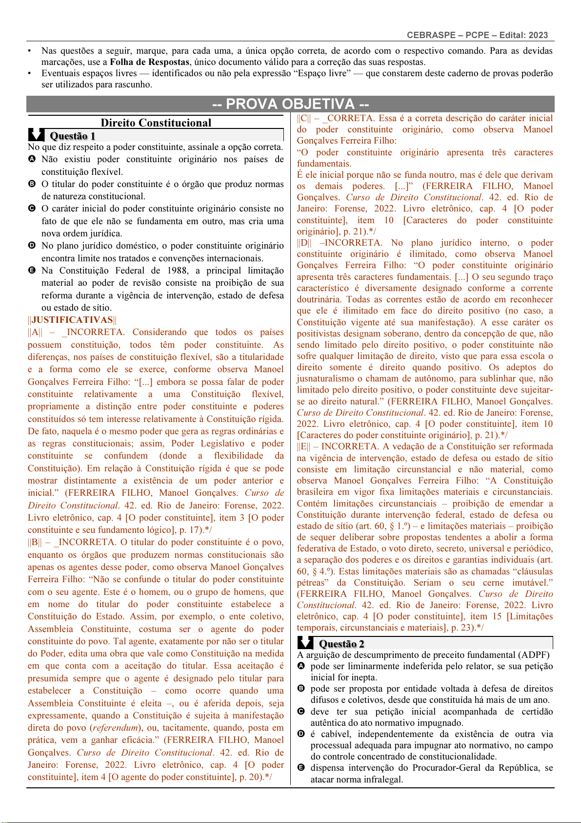 pcimarkpci MjgwNDo1NmQ4OjAwMjA6MDE5YzozZDQ0OjJjMGY6NmNkOTo3NzMz:U3VuLCAxNCBEZWMgMjAyNSAxMDoxNToxNyAtMDMwMA== www.pciconcursos.com.br CEBRASPE – PCPE – Edital: 2023 • Nas questões a seguir, marque, para cada uma, a única opção correta, de acordo com o respectivo comando. Para as devidas marcações, use a Folha de Respostas, único documento válido para a correção das suas respostas. • Eventuais espaços livres — identificados ou não pela expressão “Espaço livre” — que constarem deste caderno de provas poderão ser utilizados para rascunho. -- PROVA OBJETIVA -- Direito Constitucional Questão 1 No que diz respeito a poder constituinte, assinale a opção correta. A Não existiu poder constituinte originário nos países de constituição flexível. B O titular do poder constituinte é o órgão que produz normas de natureza constitucional. C O caráter inicial do poder constituinte originário consiste no fato de que ele não se fundamenta em outro, mas cria uma nova ordem jurídica. D No plano jurídico doméstico, o poder constituinte originário encontra limite nos tratados e convenções internacionais. E Na Constituição Federal de 1988, a principal limitação material ao poder de revisão consiste na proibição de sua reforma durante a vigência de intervenção, estado de defesa ou estado de sítio. ||JUSTIFICATIVAS|| ||A|| – _INCORRETA. Considerando que todos os países possuem constituição, todos têm poder constituinte. As diferenças, nos países de constituição flexível, são a titularidade e a forma como ele se exerce, conforme observa Manoel Gonçalves Ferreira Filho: “[...] embora se possa falar de poder constituinte relativamente a uma Constituição flexível, propriamente a distinção entre poder constituinte e poderes constituídos só tem interesse relativamente à Constituição rígida. De fato, naquela é o mesmo poder que gera as regras ordinárias e as regras constitucionais; assim, Poder Legislativo e poder constituinte se confundem (donde a flexibilidade da Constituição). Em relação à Constituição rígida é que se pode mostrar distintamente a existência de um poder anterior e inicial.” (FERREIRA FILHO, Manoel Gonçalves. Curso de Direito Constitucional. 42. ed. Rio de Janeiro: Forense, 2022. Livro eletrônico, cap. 4 [O poder constituinte], item 3 [O poder constituinte e seu fundamento lógico], p. 17).*/ ||B|| – _INCORRETA. O titular do poder constituinte é o povo, enquanto os órgãos que produzem normas constitucionais são apenas os agentes desse poder, como observa Manoel Gonçalves Ferreira Filho: “Não se confunde o titular do poder constituinte com o seu agente. Este é o homem, ou o grupo de homens, que em nome do titular do poder constituinte estabelece a Constituição do Estado. Assim, por exemplo, o ente coletivo, Assembleia Constituinte, costuma ser o agente do poder constituinte do povo. Tal agente, exatamente por não ser o titular do Poder, edita uma obra que vale como Constituição na medida em que conta com a aceitação do titular. Essa aceitação é presumida sempre que o agente é designado pelo titular para estabelecer a Constituição – como ocorre quando uma Assembleia Constituinte é eleita –, ou é aferida depois, seja expressamente, quando a Constituição é sujeita à manifestação direta do povo (referendum), ou, tacitamente, quando, posta em prática, vem a ganhar eficácia.” (FERREIRA FILHO, Manoel Gonçalves. Curso de Direito Constitucional. 42. ed. Rio de Janeiro: Forense, 2022. Livro eletrônico, cap. 4 [O poder constituinte], item 4 [O agente do poder constituinte], p. 20).*/ ||C|| – _CORRETA. Essa é a correta descrição do caráter inicial do poder constituinte originário, como observa Manoel Gonçalves Ferreira Filho: “O poder constituinte originário apresenta três caracteres fundamentais. É ele inicial porque não se funda noutro, mas é dele que derivam os demais poderes. [...]” (FERREIRA FILHO, Manoel Gonçalves. Curso de Direito Constitucional. 42. ed. Rio de Janeiro: Forense, 2022. Livro eletrônico, cap. 4 [O poder constituinte], item 10 [Caracteres do poder constituinte originário], p. 21).*/ ||D|| –INCORRETA. No plano jurídico interno, o poder constituinte originário é ilimitado, como observa Manoel Gonçalves Ferreira Filho: “O poder constituinte originário apresenta três caracteres fundamentais. [...] O seu segundo traço característico é diversamente designado conforme a corrente doutrinária. Todas as correntes estão de acordo em reconhecer que ele é ilimitado em face do direito positivo (no caso, a Constituição vigente até sua manifestação). A esse caráter os positivistas designam soberano, dentro da concepção de que, não sendo limitado pelo direito positivo, o poder constituinte não sofre qualquer limitação de direito, visto que para essa escola o direito somente é direito quando positivo. Os adeptos do jusnaturalismo o chamam de autônomo, para sublinhar que, não limitado pelo direito positivo, o poder constituinte deve sujeitar- se ao direito natural.” (FERREIRA FILHO, Manoel Gonçalves. Curso de Direito Constitucional. 42. ed. Rio de Janeiro: Forense, 2022. Livro eletrônico, cap. 4 [O poder constituinte], item 10 [Caracteres do poder constituinte originário], p. 21).*/ ||E|| – INCORRETA. A vedação de a Constituição ser reformada na vigência de intervenção, estado de defesa ou estado de sítio consiste em limitação circunstancial e não material, como observa Manoel Gonçalves Ferreira Filho: “A Constituição brasileira em vigor fixa limitações materiais e circunstanciais. Contém limitações circunstanciais – proibição de emendar a Constituição durante intervenção federal, estado de defesa ou estado de sítio (art. 60, § 1.º) – e limitações materiais – proibição de sequer deliberar sobre propostas tendentes a abolir a forma federativa de Estado, o voto direto, secret