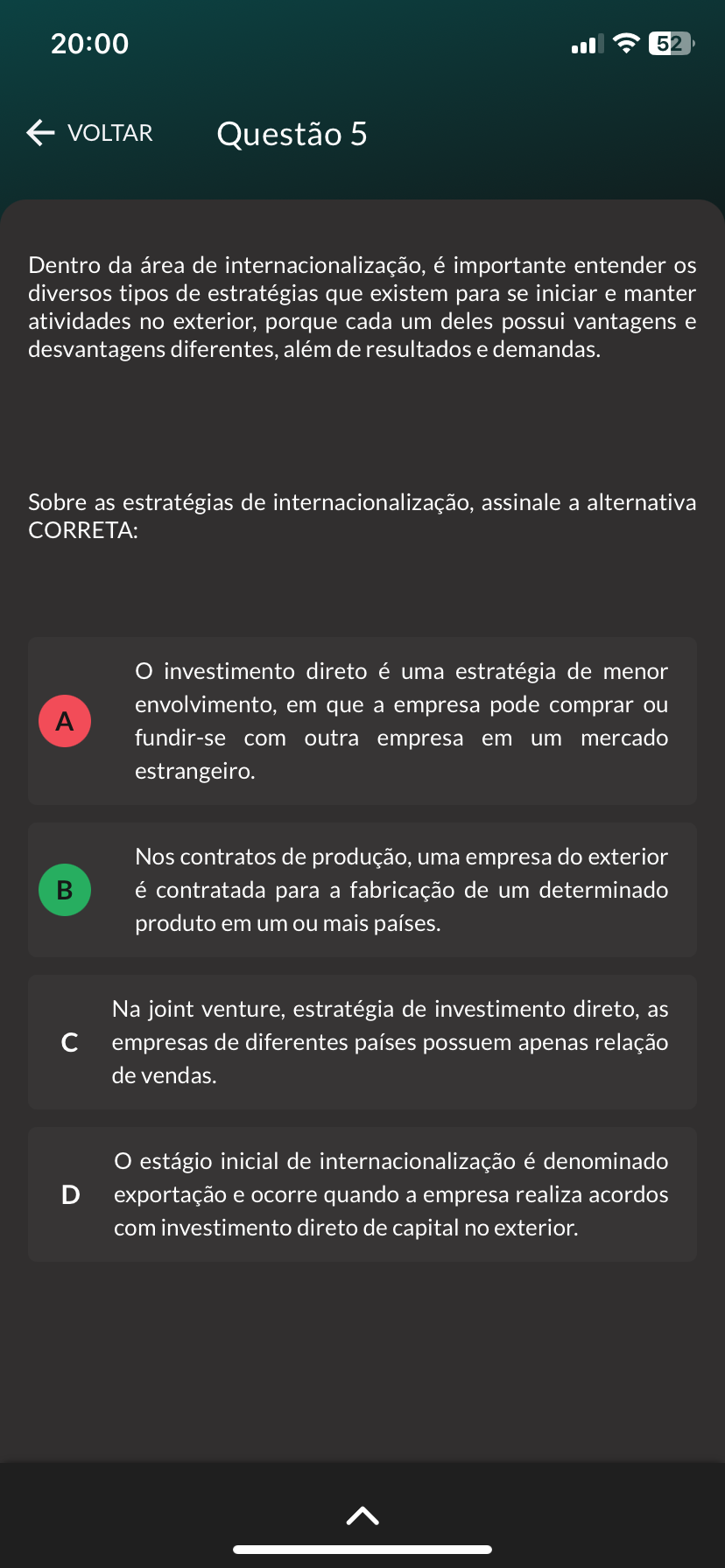 20:00 52 VOLTAR Questão 5 Dentro da área de internacionalização, é importante entender os diversos tipos de estratégias que existem para se iniciar e manter atividades no exterior, porque cada um deles possui vantagens e desvantagens diferentes, além de resultados e demandas. Sobre as estratégias de internacionalização, assinale a alternativa CORRETA: investimento direto é uma estratégia de menor envolvimento, em que a empresa pode comprar ou A fundir-se com outra empresa em um mercado estrangeiro. Nos contratos de produção, uma empresa do exterior é contratada para a fabricação de um determinado produto em um ou mais países. Na joint venture, estratégia de investimento direto, as c empresas de diferentes países possuem apenas relação de vendas. estágio inicial de internacionalização é denominado D exportação e ocorre quando a empresa realiza acordos com investimento direto de capital no exterior.