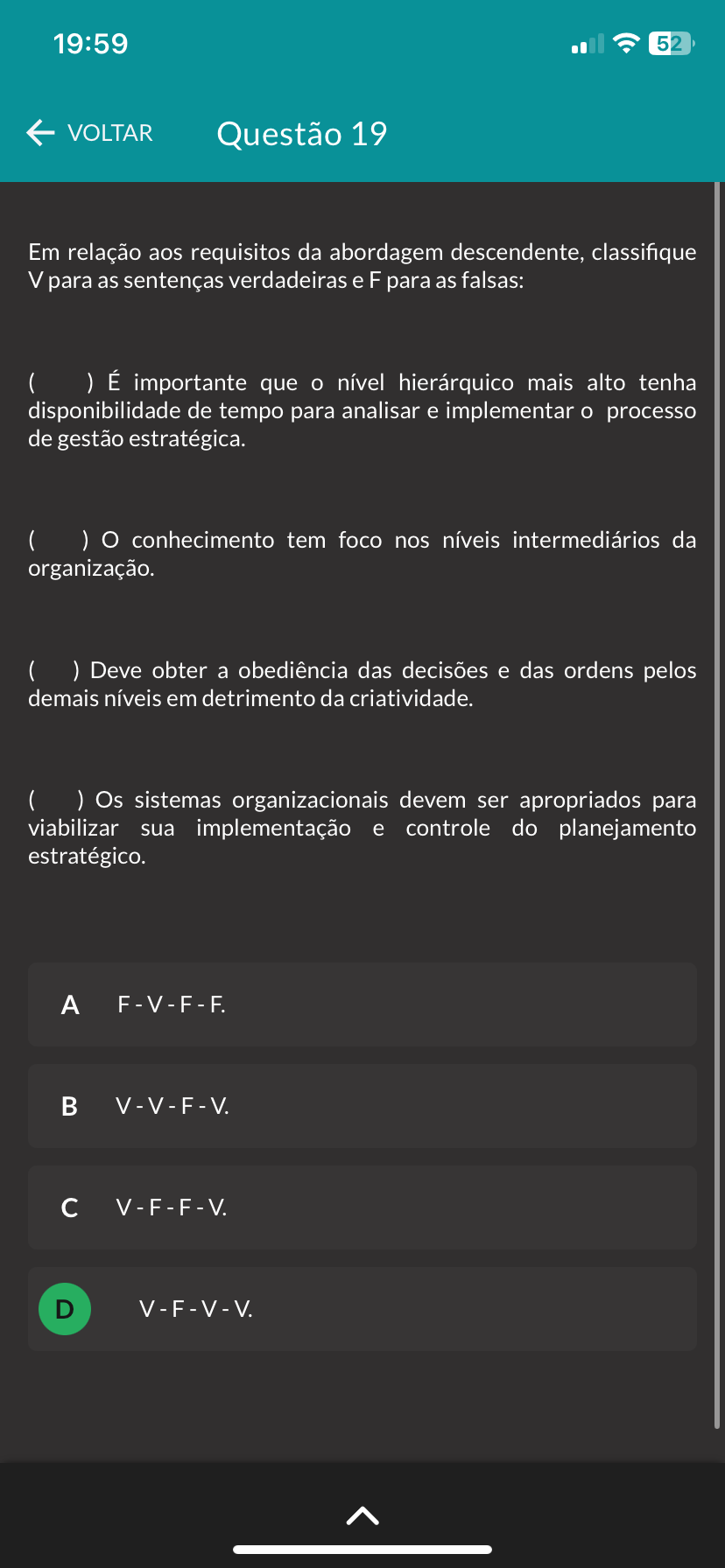 19:59 52 VOLTAR Questão 19 Em relação aos requisitos da abordagem descendente, classifique V para as sentenças verdadeiras e F para as falsas: ( ) É importante que o nível hierárquico mais alto tenha disponibilidade de tempo para analisar e implementar processo de gestão estratégica. ( ) conhecimento tem foco nos níveis intermediários da organização. ( ) Deve obter a obediência das decisões e das ordens pelos demais níveis em detrimento da criatividade. ( ) Os sistemas organizacionais devem ser apropriados para viabilizar sua implementação e controle do planejamento estratégico. A F-V-F-F. V-V-F-V. c V-F-F-V. D V-F-V-V.