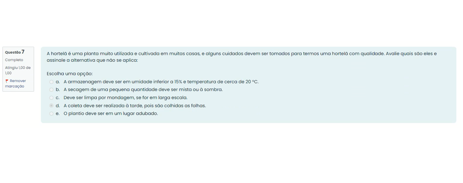Questão 7 A é uma planta muito utilizada e cultivada em muitas casas, e alguns cuidados devem ser tomados para termos uma com qualidade. Avalie quais são eles e Completo assinale a alternativa que não se aplica: Atingiu 1,00 de 1,00 Escolha uma opção: Remover a. A armazenagem deve ser em umidade inferior a 15% e temperatura de cerca de 20 °C. marcação b. A secagem de uma pequena quantidade deve ser mista ou à sombra. C. Deve ser limpa por mondagem, se for em larga escala. d. A coleta deve ser realizada à tarde, pois são colhidas as folhas. e. O plantio deve ser em um lugar adubado.