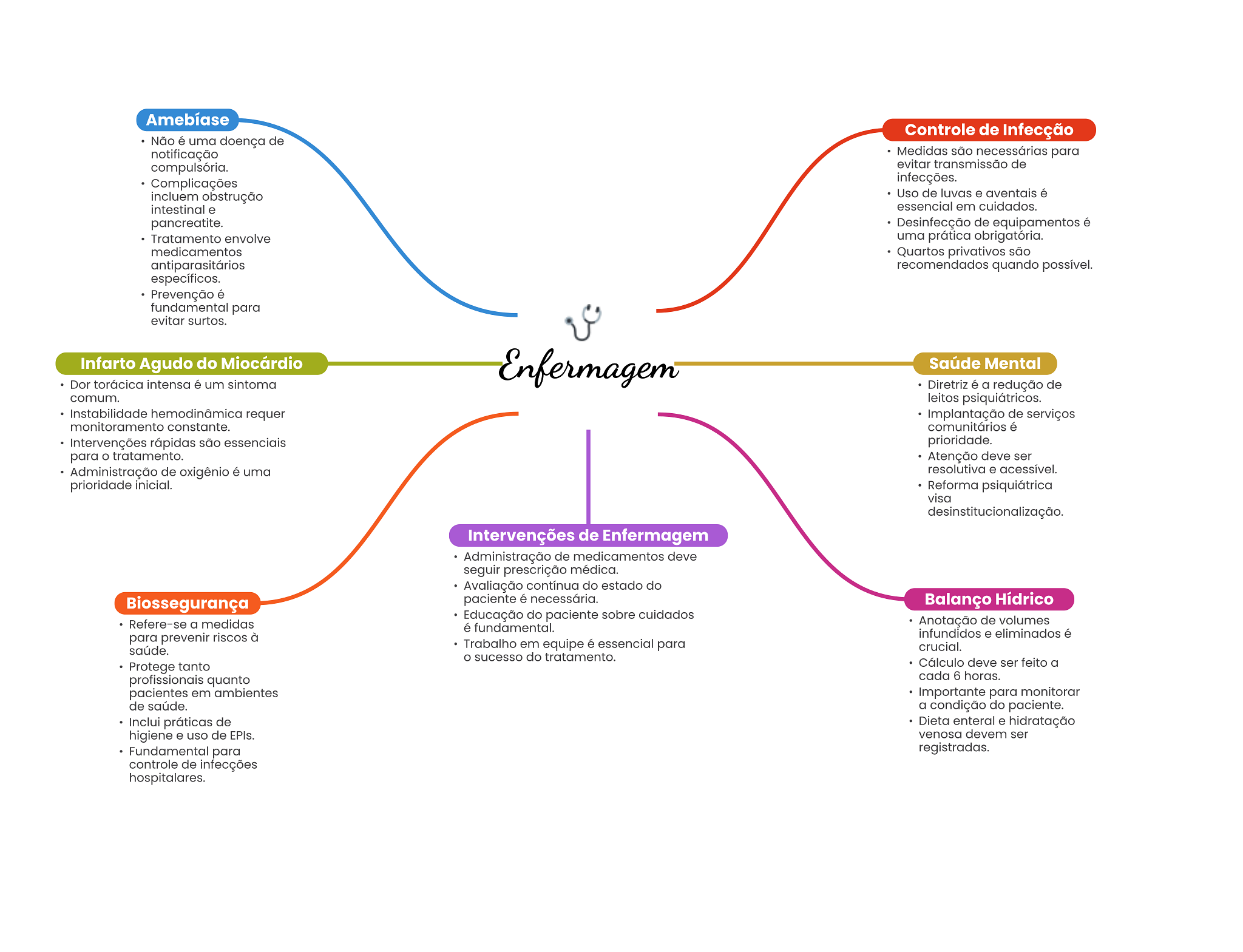 Amebíase Controle de Infecção Não é uma doença de notificação Medidas são necessárias para compulsória. evitar transmissão de Complicações infecções. incluem obstrução Uso de luvas e aventais é intestinal e essencial em cuidados. pancreatite. Desinfecção de equipamentos é Tratamento envolve uma prática obrigatória. medicamentos Quartos privativos são antiparasitários recomendados quando possível. específicos. Prevenção é fundamental para evitar surtos. Infarto Agudo do Miocárdio Enfermagem Saúde Mental Dor torácica intensa é um sintoma Diretriz é a redução de comum. leitos psiquiátricos. Instabilidade hemodinâmica requer Implantação de serviços monitoramento constante. comunitários é Intervenções rápidas são essenciais prioridade. para tratamento. Atenção deve ser Administração de oxigênio é uma resolutiva e acessível. prioridade inicial. Reforma psiquiátrica visa Intervenções de Enfermagem Administração de medicamentos deve seguir prescrição médica. Avaliação contínua do estado do Biossegurança paciente é necessária. Balanço Hídrico Educação do paciente sobre cuidados Refere-se a medidas Anotação de volumes é fundamental. para prevenir riscos à infundidos e eliminados é saúde. Trabalho em equipe é essencial para crucial. sucesso do tratamento. Protege tanto Cálculo deve ser feito a profissionais quanto cada 6 horas. pacientes em ambientes Importante para monitorar de saúde. a condição do paciente. Inclui práticas de Dieta enteral e hidratação higiene e uso de EPIs. venosa devem ser Fundamental para registradas. controle de infecções hospitalares.