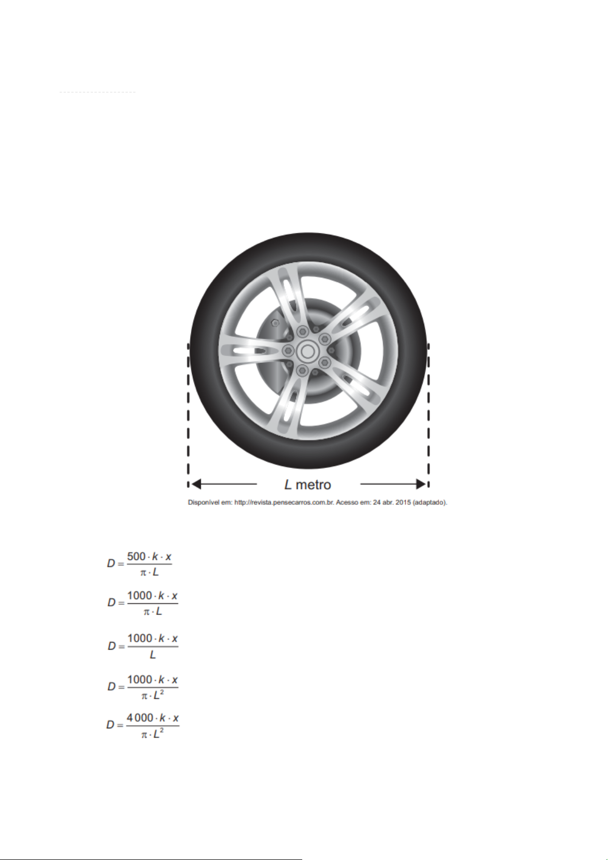 Q826570 Os pneus estão entre os itens mais importantes para a segurança de um carro. Segundo revendedores especializados, o desgaste do pneu em um trajeto é diretamente proporcional ao número de voltas que ele efetua em contato com o solo, sem derrapar, durante esse trajeto, sendo que a constante de proporcionalidade k depende do material empregado na sua fabricação. O proprietário de um carro, cujo diâmetro do pneu mede L m, conforme indicado na imagem, pretende obter uma expressão que forneça uma estimativa para a medida do desgaste D desse pneu ao longo de uma viagem de x km. Para efeito dos cálculos, considerou o diâmetro do pneu como sendo L, independentemente da extensão do trajeto. O valor de D é dado pela expressão a) b) c) d) e) 14/12/2025, 20:02 Questão INEP - 2022 - ENEM - Exame Nacional do Ensino Médio - PPL - Reaplicação - 1° e 2° Dia https://www.aprovaconcursos.com.br/questoes-de-concurso/questao/826570-inep-2022-enem-exame-nacional-do-ensino-medio-ppl-reaplicacao-… 1/2 https://www.aprovaconcursos.com.br/questoes-de-concurso/questao/826570-inep-2022-enem-exame-nacional-do-ensino-medio-ppl-reaplicacao-1deg-e-2deg-dia 14/12/2025, 20:02 Questão INEP - 2022 - ENEM - Exame Nacional do Ensino Médio - PPL - Reaplicação - 1° e 2° Dia https://www.aprovaconcursos.com.br/questoes-de-concurso/questao/826570-inep-2022-enem-exame-nacional-do-ensino-medio-ppl-reaplicacao-… 2/2