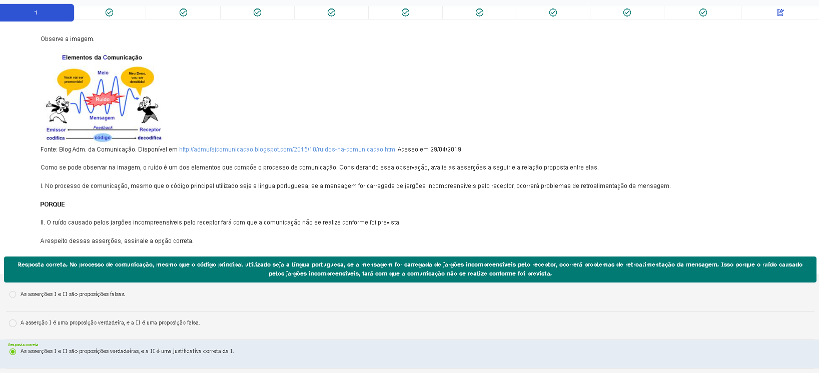 1 Observe a imagem. Elementos da Comunicação Meio Meu Você ser you ser promovido! Ruido Mensagem Emissor Feedback Receptor codifica decodifica Fonte: da Comunicação. Disponível em Acesso em Como se pode observar na imagem, 0 ruído é um dos elementos que 0 processo de comunicação. Considerando essa observação, avalie as asserções a seguir e a relação proposta entre elas. I. No processo de comunicação, mesmo que 0 código principal utilizado seja a portuguesa, se a mensagem for carregada de jargões pelo receptor, problemas de retroalimentação da mensagem. PORQUE II. ruído causado pelos incompreensíveis pelo receptor com que a comunicação não se realize conforme foi prevista. Arespeito dessas asserções, assinale a opção correta. Resposta correta. No processo de comunicação, mesmo que principal utilizado seja a portuguesa, se a mensagem for carregada de jargões pelo receptor, ocorrera problemas de retroalimentação da mensagem. Isso porque causado pelos jargões incompreensiveis, fará com que a comunicação não se realize conforme foi prevista. As asserções I e II são proposições falsas. A asserção uma proposição verdadeira, e a II é uma proposição falsa. As asserções II são proposições verdadeiras, e a II é uma justificativa correta da I.