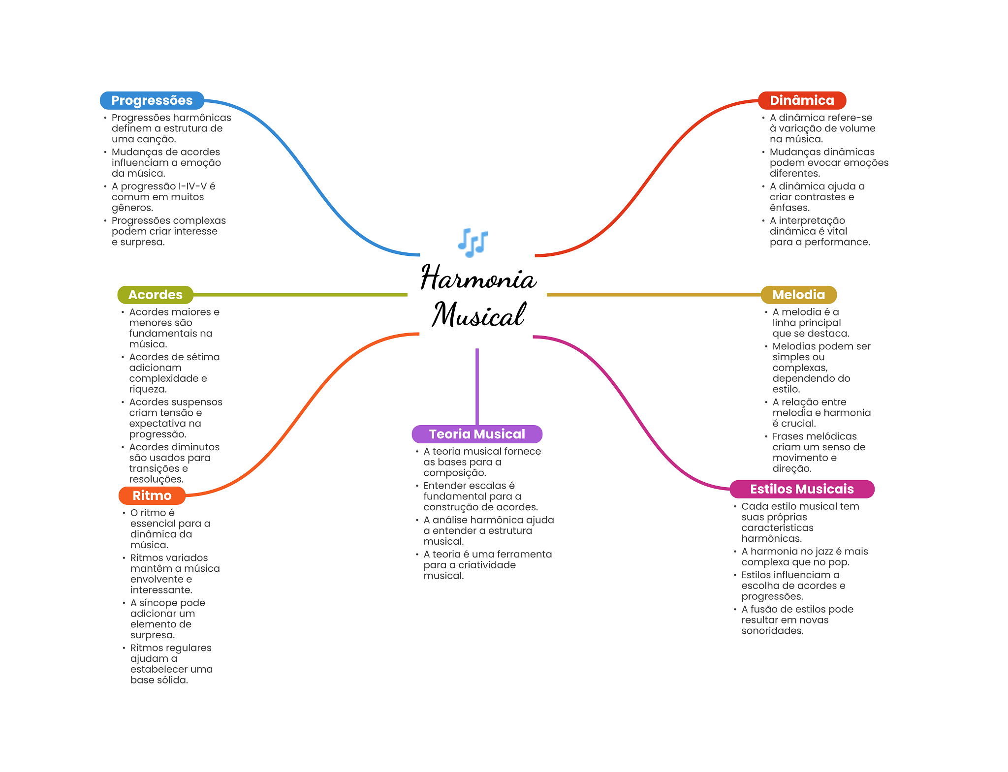 Progressões Dinâmica Progressões harmônicas A dinâmica refere-se definem a estrutura de à variação de volume uma canção. na música. Mudanças de acordes Mudanças dinâmicas influenciam a emoção podem evocar emoções da música. diferentes. A progressão I-IV-V é A dinâmica ajuda a comum em muitos criar contrastes e gêneros. ênfases. Progressões complexas A interpretação podem criar interesse dinâmica é vital e surpresa. para a performance. Harmonia Acordes Melodia Acordes maiores e menores são Musical A melodia é a linha principal fundamentais na que se destaca. música. Melodias podem ser Acordes de sétima simples ou adicionam complexas, complexidade e dependendo do riqueza. estilo. Acordes suspensos A relação entre criam tensão e melodia e harmonia expectativa na é crucial. progressão. Teoria Musical Frases melódicas Acordes diminutos A teoria musical fornece criam um senso de são usados para as bases para a movimento e transições e composição. direção. resoluções. Entender escalas é Ritmo Estilos Musicais fundamental para a ritmo é construção de acordes. Cada estilo musical tem essencial para a A análise harmônica ajuda suas próprias a entender a estrutura características dinâmica da musical. harmônicas. música. Ritmos variados A teoria é uma ferramenta A harmonia no jazz é mais mantêm a música para a criatividade complexa que no pop. envolvente e musical. Estilos influenciam a interessante. escolha de acordes e progressões. A síncope pode adicionar um A fusão de estilos pode elemento de resultar em novas sonoridades. surpresa. Ritmos regulares ajudam a estabelecer uma base sólida.