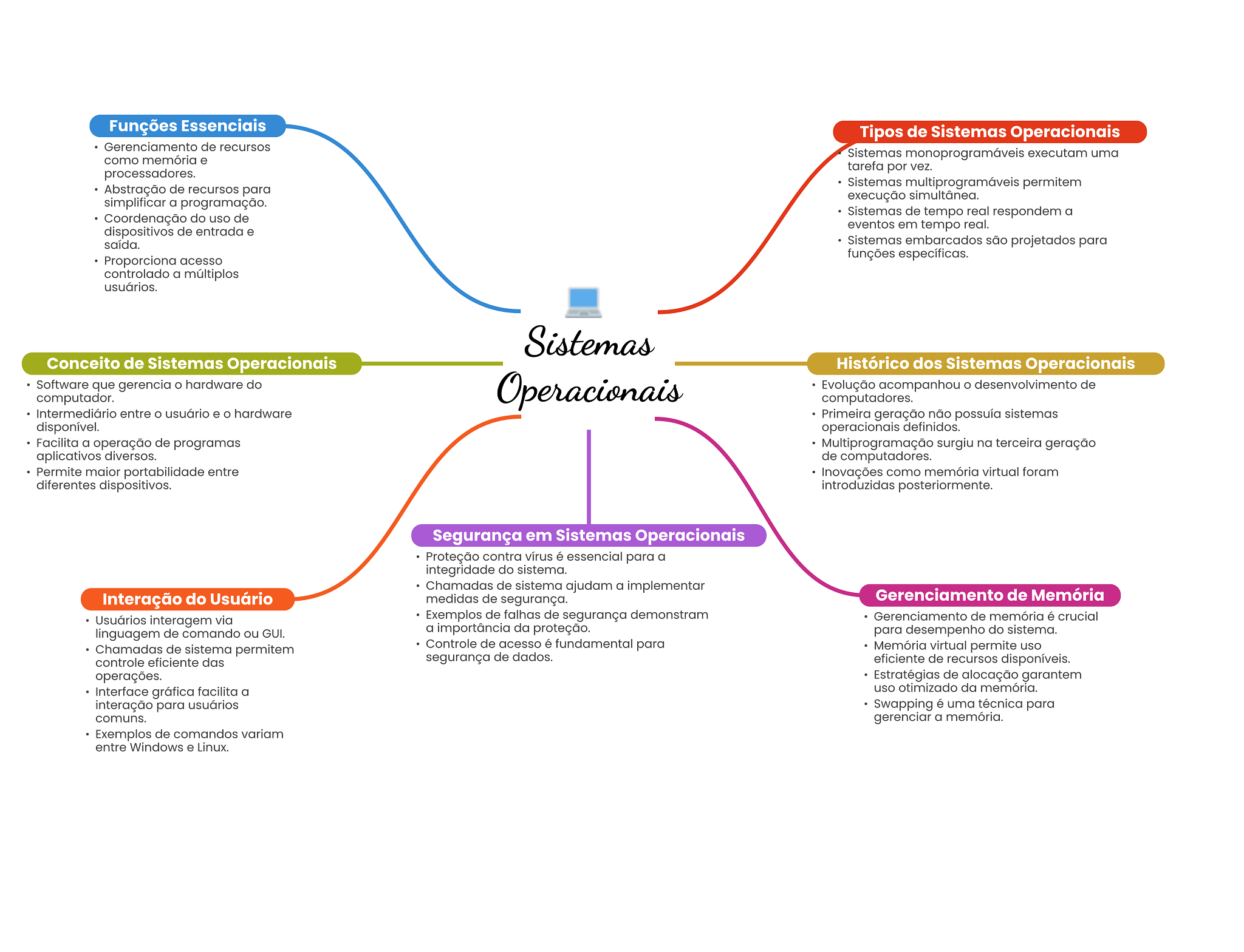 Funções Essenciais Tipos de Sistemas Operacionais Gerenciamento de recursos como memória e Sistemas monoprogramáveis executam uma tarefa por vez. processadores. Sistemas multiprogramáveis permitem Abstração de recursos para execução simultânea. simplificar a programação. Sistemas de tempo real respondem a Coordenação do uso de dispositivos de entrada e eventos em tempo real. saída. Sistemas embarcados são projetados para funções específicas. Proporciona acesso controlado a múltiplos usuários. Sistemas Conceito de Sistemas Operacionais Histórico dos Sistemas Operacionais Software que gerencia O hardware do Operacionais Evolução acompanhou desenvolvimento de computador. computadores. Intermediário entre O usuário e O hardware Primeira geração não possuía sistemas disponível. operacionais definidos. Facilita a operação de programas Multiprogramação surgiu na terceira geração aplicativos diversos. de computadores. Permite maior portabilidade entre Inovações como memória virtual foram diferentes dispositivos. introduzidas posteriormente. Segurança em Sistemas Operacionais Proteção contra vírus é essencial para a integridade do sistema. Chamadas de sistema ajudam a implementar Interação do Usuário medidas de segurança. Gerenciamento de Memória Usuários interagem via Exemplos de falhas de segurança demonstram Gerenciamento de memória é crucial linguagem de comando ou GUI. a importância da proteção. para desempenho do sistema. Chamadas de sistema permitem Controle de acesso é fundamental para Memória virtual permite uso controle eficiente das segurança de dados. eficiente de recursos disponíveis. operações. Estratégias de alocação garantem Interface gráfica facilita a uso otimizado da memória. interação para usuários Swapping é uma técnica para comuns. gerenciar a memória. Exemplos de comandos variam entre Windows e Linux.
