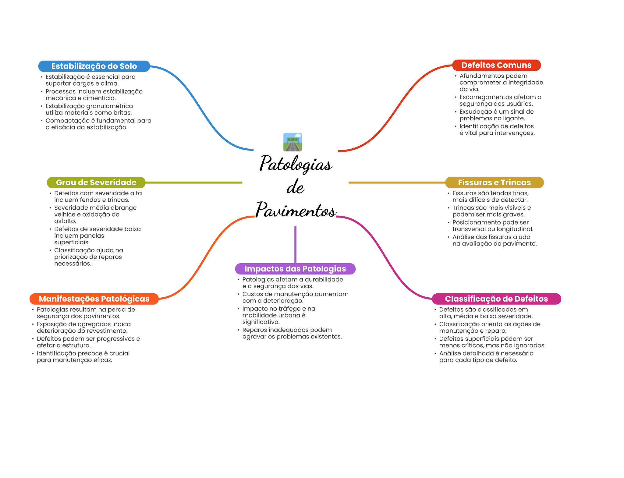 Estabilização do Solo Defeitos Comuns Estabilização é essencial para Afundamentos podem suportar cargas e clima. comprometer a integridade Processos incluem estabilização da via. mecânica e cimentícia. Escorregamentos afetam a Estabilização granulométrica segurança dos usuários. utiliza materiais como britas. Exsudação é um sinal de Compactação é fundamental para problemas no ligante. a eficácia da estabilização. Identificação de defeitos é vital para intervenções. Patologias Grau de Severidade de Fissuras e Trincas Defeitos com severidade alta Fissuras são fendas finas, incluem fendas e trincas. mais difíceis de detectar. Severidade média abrange Pavimentos Trincas são mais visíveis e velhice e oxidação do podem ser mais graves. asfalto. Posicionamento pode ser Defeitos de severidade baixa transversal ou longitudinal. incluem panelas Análise das fissuras ajuda superficiais. na avaliação do pavimento. Classificação ajuda na priorização de reparos necessários. Impactos das Patologias Patologias afetam a durabilidade e a segurança das vias. Custos de manutenção aumentam Manifestações Patológicas com a deterioração. Classificação de Defeitos Patologias resultam na perda de Impacto no tráfego e na Defeitos são classificados em segurança dos pavimentos. mobilidade urbana é alta, média e baixa severidade. Exposição de agregados indica significativo. Classificação orienta as ações de deterioração do revestimento. Reparos inadequados podem manutenção e reparo. Defeitos podem ser progressivos e agravar OS problemas existentes. Defeitos superficiais podem ser afetar a estrutura. menos críticos, mas não ignorados. Identificação precoce é crucial Análise detalhada é necessária para manutenção eficaz. para cada tipo de defeito.