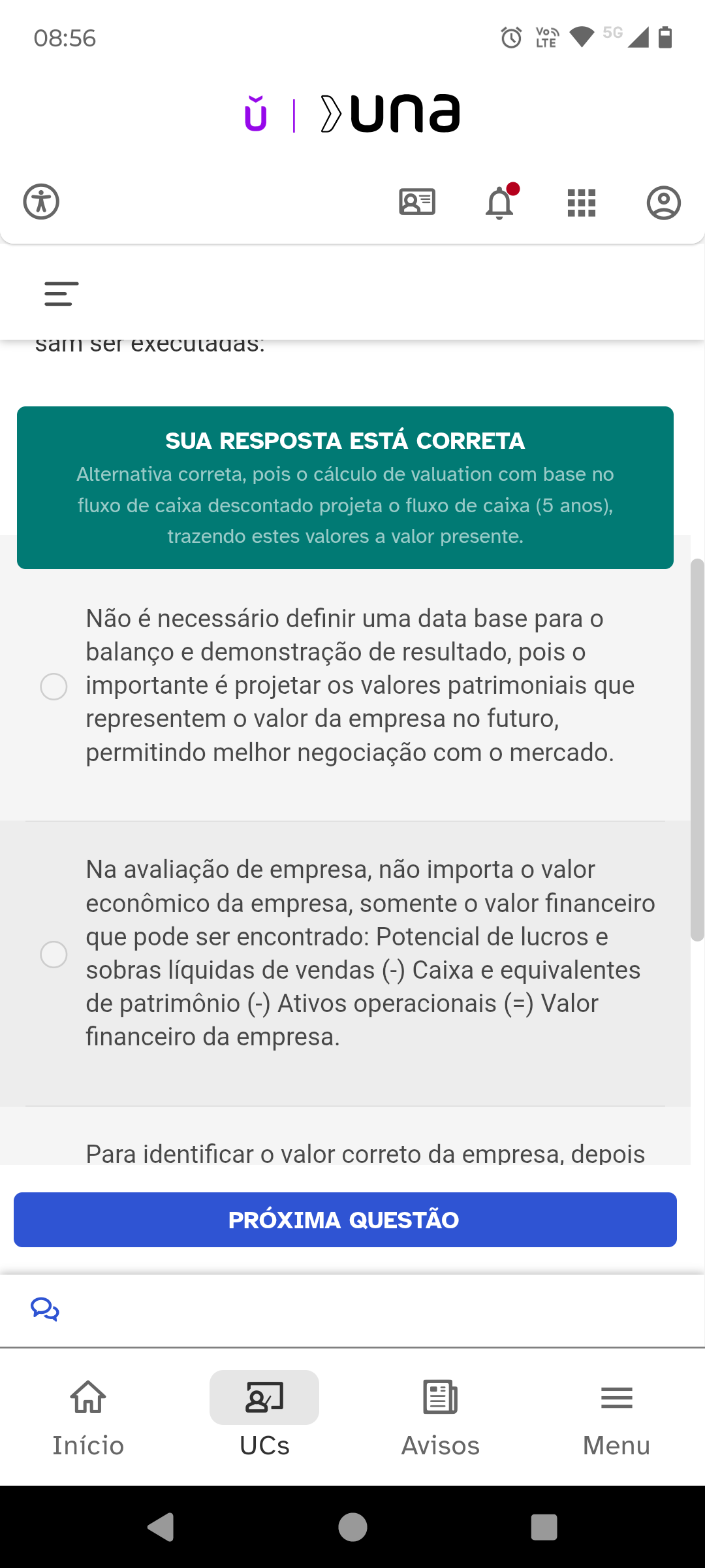 08:56 5G LTE una sam ser executadas: SUA RESPOSTA ESTÁ CORRETA Alternativa correta, pois cálculo de valuation com base no fluxo de caixa descontado projeta fluxo de caixa (5 anos), trazendo estes valores a valor presente. Não é necessário definir uma data base para o balanço e demonstração de resultado, pois o importante é projetar os valores patrimoniais que representem o valor da empresa no futuro, permitindo melhor negociação com o mercado. Na avaliação de empresa, não importa o valor econômico da empresa, somente o valor financeiro que pode ser encontrado: Potencial de lucros e sobras líquidas de vendas (-) Caixa e equivalentes de patrimônio (-) Ativos operacionais (=) Valor financeiro da empresa. Para identificar o valor correto da empresa, depois PRÓXIMA QUESTÃO Início UCs Avisos Menu