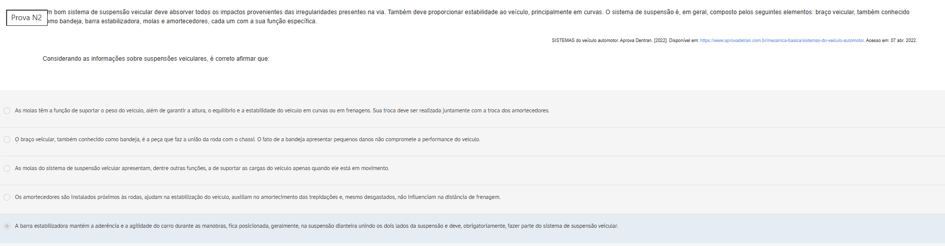 m bom sistema de suspensão veicular deve absorver todos impactos provenientes das irregularidades presentes na via. Também deve proporcionar estabilidade ao veículo, principalmente em curvas. sistema de suspensão é, em geral, composto pelos seguintes elementos: braço veicular, também conhecido Prova N2 bandeja, barra estabilizadora, molas e amortecedores, cada um com a sua função SISTEMAS do veículo Aprova Dentran [2022] Disponível em: https aprovadetran com Acesso em: 07 abr. 2022. Considerando as informações sobre suspensões veiculares, é correto afirmar que: As molas a função de suportar 0 peso do além de garantir a altura, 0 equilibrio e a estabilidade do veiculo em curvas ou em frenagens. Sua troca deve ser realizada juntamente com a troca dos amortecedores. 0 braço veicular, também conhecido como bandeja, a peça que faz a união da roda com 0 chassi. fato de a bandeja apresentar pequenos danos não compromete a performance do veículo. As molas do sistema de suspensão veicular apresentam, dentre outras funções, a de suportar as cargas do veículo apenas quando ele está em movimento. Os amortecedores são instalados proximos rodas, ajudam na estabilização do veiculo, auxiliam no amortecimento das trepidações e, mesmo desgastados, não influenciam na distância de frenagem. A barra estabilizadora mantém a e a agilidade do carro durante as manobras, fica posicionada, geralmente, na suspensão dianteira unindo os dois lados da suspensão e deve, obrigatoriamente, fazer parte do sistema de suspensão veicular.