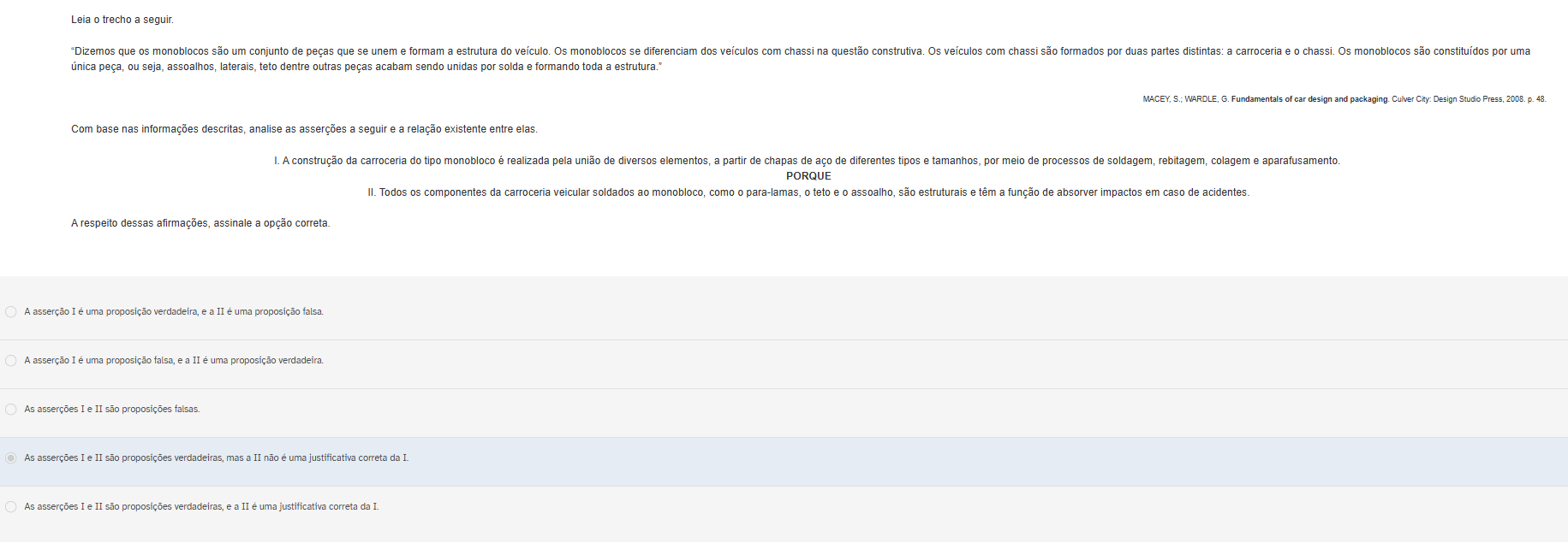 Leia 0 trecho a seguir. "Dizemos que os monoblocos são um conjunto de peças que se unem e formam a estrutura do veículo. Os monoblocos se diferenciam dos veículos com chassi na questão construtiva. Os veículos com chassi são formados por duas partes distintas: a carroceria e 0 chassi. Os monoblocos são constituídos por uma única peça, ou seja, assoalhos, laterais, teto dentre outras peças acabam sendo unidas por solda e formando toda a estrutura." G Fundamentals of car design and Culver City: Design Studio Press, 2008. 48. Com base nas informações descritas, analise as asserções a seguir e a relação existente entre elas. A construção da carroceria do tipo monobloco é realizada pela união de diversos elementos, a partir de chapas de aço de diferentes tipos e tamanhos, por meio de processos de soldagem, rebitagem, colagem e aparafusamento. PORQUE II. Todos componentes da carroceria veicular soldados ao monobloco, como 0 para-lamas, 0 teto e 0 assoalho, são estruturais e têm a função de absorver impactos em caso de acidentes. A respeito dessas afirmações, assinale a opção correta. A asserção uma proposição verdadeira, e a II é uma proposição A asserção uma proposição falsa, e a II é uma proposição As asserções I e II são proposições As asserções Ie II são proposições verdadeiras, mas a II não é uma justificativa correta da As asserções Ie II são proposições verdadeiras, e a II uma justificativa correta da