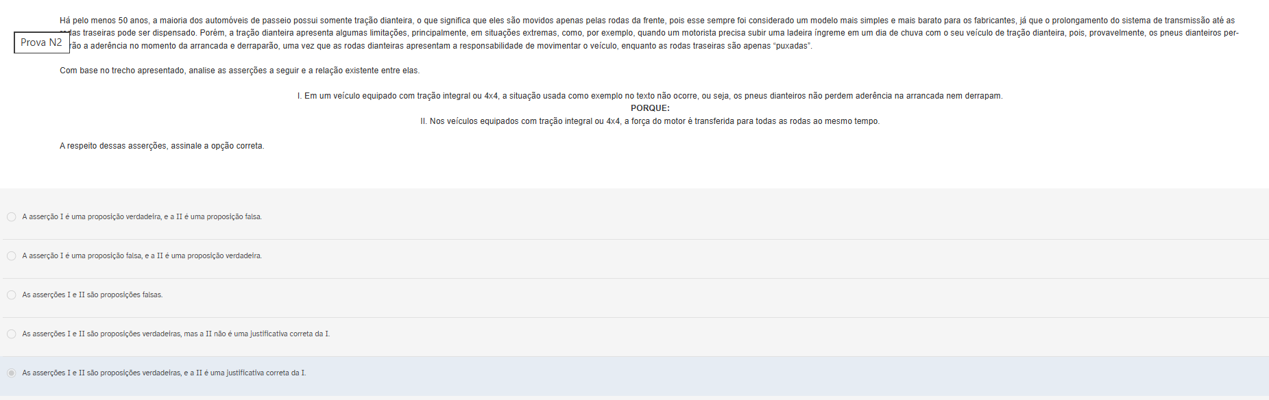 Há pelo menos 50 anos, a maioria dos automóveis de passeio possui somente tração dianteira, 0 que significa que eles são movidos apenas pelas rodas da frente, pois esse sempre foi considerado um modelo mais simples e mais barato para os fabricantes, já que 0 prolongamento do sistema de transmissão até as as traseiras pode ser dispensado. a tração dianteira apresenta algumas limitações, principalmente, em situações extremas, como, por exemplo, quando um motorista precisa subir uma ladeira ingreme em um dia de chuva com 0 seu veículo de tração dianteira, pois, provavelmente, os pneus dianteiros per- Prova N2 a aderência no momento da arrancada e derraparão, uma vez que as rodas dianteiras apresentam a responsabilidade de movimentar 0 veículo, enquanto as rodas traseiras são apenas "puxadas". Com base no trecho apresentado, analise as asserções a seguir e a relação existente entre elas. I. Em um veículo equipado com tração integral ou 4x4, a situação usada como exemplo no texto não ocorre, ou seja, pneus dianteiros não perdem aderência na arrancada nem derrapam. PORQUE: II. Nos veículos equipados com tração integral ou 4x4, a força do motor é transferida para todas as rodas ao mesmo tempo. A respeito dessas asserções, assinale a opção correta. A asserção I é uma proposição verdadeira, e a II uma proposição A asserção I uma proposição falsa, e a II uma proposição As asserções e II são proposições falsas. As asserções Ie II são proposições verdadeiras, mas a II não uma justificativa correta da I. As asserções I e II são proposições verdadeiras, e a II é uma justificativa correta da