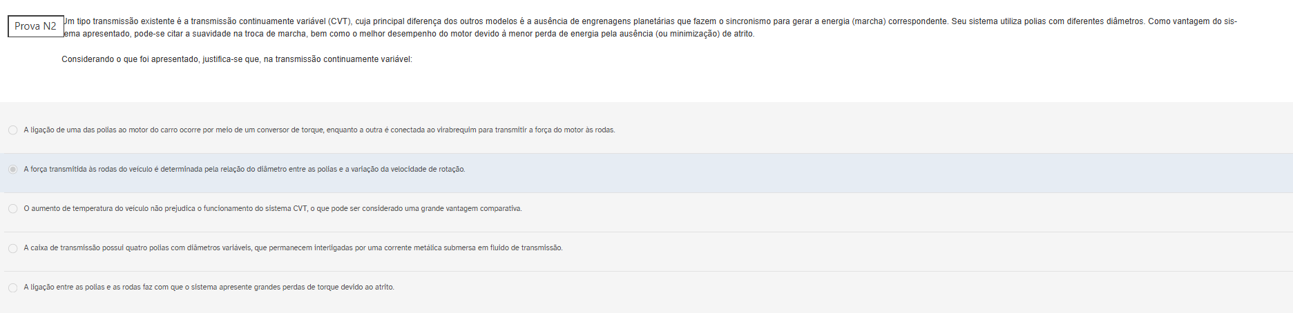 Prova N2 Jm tipo transmissão existente é a transmissão continuamente variável (CVT), cuja principal diferença dos outros modelos é a de engrenagens planetárias que fazem 0 sincronismo para gerar a energia (marcha) correspondente. Seu sistema utiliza polias com diferentes diâmetros. Como vantagem do sis- ema apresentado, pode-se citar a suavidade na troca de marcha, bem como 0 melhor desempenho do motor devido à menor perda de energia pela ausência (ou minimização) de atrito. Considerando 0 que foi apresentado, justifica-se que, na transmissão continuamente variável: A ligação de uma das polias ao motor do carro ocorre por meio de um conversor de torque, enquanto a outra conectada ao virabrequim para transmitir a força do motor às rodas. A força transmitida às rodas do veículo é determinada pela relação do entre as polias e a variação da velocidade de rotação. O aumento de temperatura do não prejudica funcionamento do sistema CVT, que pode ser considerado uma grande vantagem A caixa de transmissão possui quatro polias com diametros variáveis, que permanecem por uma corrente submersa em fluido de A ligação entre as polias e as rodas faz com que sistema apresente grandes perdas de torque devido ao atrito.