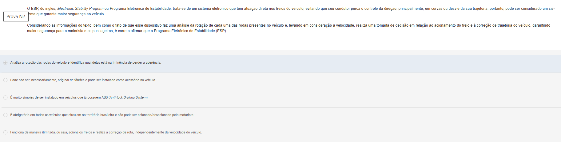 ESP, do inglês, Electronic Stability Program ou Programa Eletrônico de Estabilidade, trata-se de um sistema eletrônico que tem atuação direta nos freios do veículo, evitando que seu condutor perca 0 controle da direção, principalmente, em curvas ou desvie da sua trajetória, portanto, pode ser considerado um sis- Prova N2 ema que garante maior segurança ao veículo. Considerando as informações do texto, bem como 0 fato de que esse dispositivo faz uma da rotação de cada uma das rodas presentes no veículo e, levando em consideração a velocidade, realiza uma tomada de decisão em relação ao acionamento do freio e à correção de trajetória do veículo, garantindo maior segurança para 0 motorista e passageiros, é correto afirmar que 0 Programa Eletrônico de Estabilidade (ESP): Analisa a rotação das rodas do e identifica qual delas está na de perder a Pode não ser, necessariamente, original de e pode ser instalado como no E muito simples de ser instalado em veiculos que ja possuem ABS (Anti-lock Braking System). E obrigatório em todos que circulam no território brasileiro e não pode ser acionado/desacionado pelo motorista. Funciona de maneira ilimitada, ou seja, aciona freios e realiza a correção de rota, independentemente da velocidade do