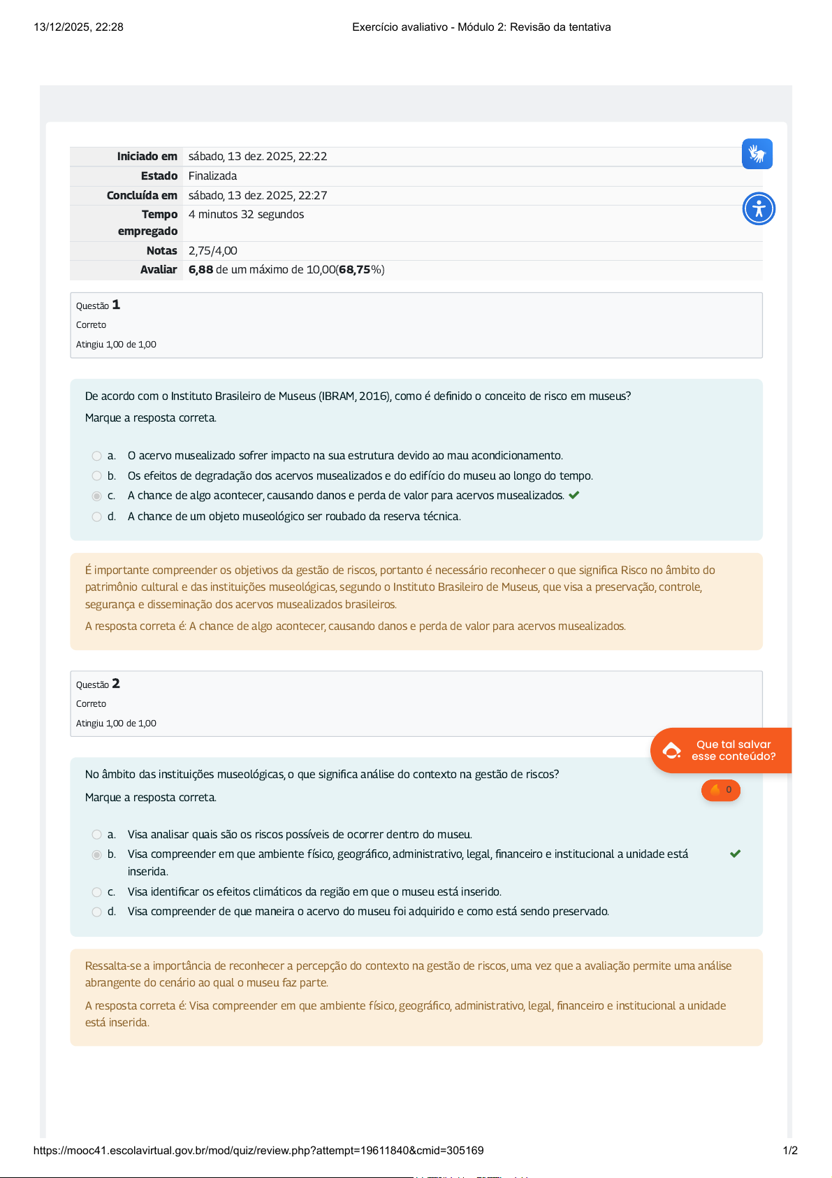 Iniciado em sábado, 13 dez. 2025, 22:22 Estado Finalizada Concluída em sábado, 13 dez. 2025, 22:27 Tempo empregado 4 minutos 32 segundos Notas 2,75/4,00 Avaliar 6,88 de um máximo de 10,00(68,75%) Questão 1 Correto Atingiu 1,00 de 1,00 Questão 2 Correto Atingiu 1,00 de 1,00 De acordo com o Instituto Brasileiro de Museus (IBRAM, 2016), como é definido o conceito de risco em museus? Marque a resposta correta. a. O acervo musealizado sofrer impacto na sua estrutura devido ao mau acondicionamento. b. Os efeitos de degradação dos acervos musealizados e do edifício do museu ao longo do tempo. c. A chance de algo acontecer, causando danos e perda de valor para acervos musealizados. d. A chance de um objeto museológico ser roubado da reserva técnica. É importante compreender os objetivos da gestão de riscos, portanto é necessário reconhecer o que significa Risco no âmbito do patrimônio cultural e das instituições museológicas, segundo o Instituto Brasileiro de Museus, que visa a preservação, controle, segurança e disseminação dos acervos musealizados brasileiros. A resposta correta é: A chance de algo acontecer, causando danos e perda de valor para acervos musealizados. No âmbito das instituições museológicas, o que significa análise do contexto na gestão de riscos? Marque a resposta correta. a. Visa analisar quais são os riscos possíveis de ocorrer dentro do museu. b. Visa compreender em que ambiente físico, geográfico, administrativo, legal, financeiro e institucional a unidade está inserida. c. Visa identificar os efeitos climáticos da região em que o museu está inserido. d. Visa compreender de que maneira o acervo do museu foi adquirido e como está sendo preservado. Ressalta-se a importância de reconhecer a percepção do contexto na gestão de riscos, uma vez que a avaliação permite uma análise abrangente do cenário ao qual o museu faz parte. A resposta correta é: Visa compreender em que ambiente físico, geográfico, administrativo, legal, financeiro e institucional a unidade está inserida. Que tal salvar esse conteúdo? 0 13/12/2025, 22:28 Exercício avaliativo - Módulo 2: Revisão da tentativa https://mooc41.escolavirtual.gov.br/mod/quiz/review.php?attempt=19611840&cmid=305169 1/2 Questão 3 Incorreto Atingiu 0,00 de 1,00 Questão 4 Parcialmente correto Atingiu 0,75 de 1,00 Quais são os aspectos que devem ser considerados para a caracterização da instituição para fins de elaboração do plano de gestão de riscos? Marque a resposta correta. a. Organograma e levantamento da equipe, planejamento orçamentário e mapeamento de atores. b. Identificação do acervo, da equipe e do edifício. c. Organograma, equipamentos e vínculo administrativo. d. Identificação das despesas com o edifício, com a equipe e com o acervo. Para um plano de gestão de riscos eficiente, no que diz respeito a caracterização institucional. Após compreensão da missão da instituição e do vínculo administrativo, é necessário reunir as informações referentes ao organograma e o levantamento da equipe, planejamento orçamentário e mapeamento dos atores internos e externos envolvido com o espaço. A resposta correta é: Organograma e levantamento da equipe, planejamento orçamentário e mapeamento de atores. No plano de gestão de riscos, a caracterização dos acervos exige a elaboração de um diagnóstico que contemple determinadas etapas. Analise as afirmações a seguir e assinale V para verdadeiro ou F para falso. a. Verificar o quantitativo das coleções. b. Estado de conservação. c. Valor de seguro do acervo. d. Dimensões do acervo. Verdadeiro Verdadeiro Falso Verdadeiro Sua resposta está parcialmente correta. Você selecionou corretamente 3. São falsos os itens “Valor de seguro” e “Dimensões do acervo”. Esses elementos não são necessários para a caracterização dos acervos para o plano de gestão de riscos, pois correspondem às informações sistematizadas que podem ser encontradas nos instrumentos do processamento técnico. A resposta correta é: a. Verificar o quantitativo das coleções. → Verdadeiro, b. Estado de conservação. → Verdadeiro, c. Valor de seguro do acervo. → Falso, d. Dimensões do acervo. → Falso. Que tal salvar esse conteúdo? 13/12/2025, 22:28 Exercício avaliativo - Módulo 2: Revisão da tentativa https://mooc41.escolavirtual.gov.br/mod/quiz/review.php?attempt=19611840&cmid=305169 2/2