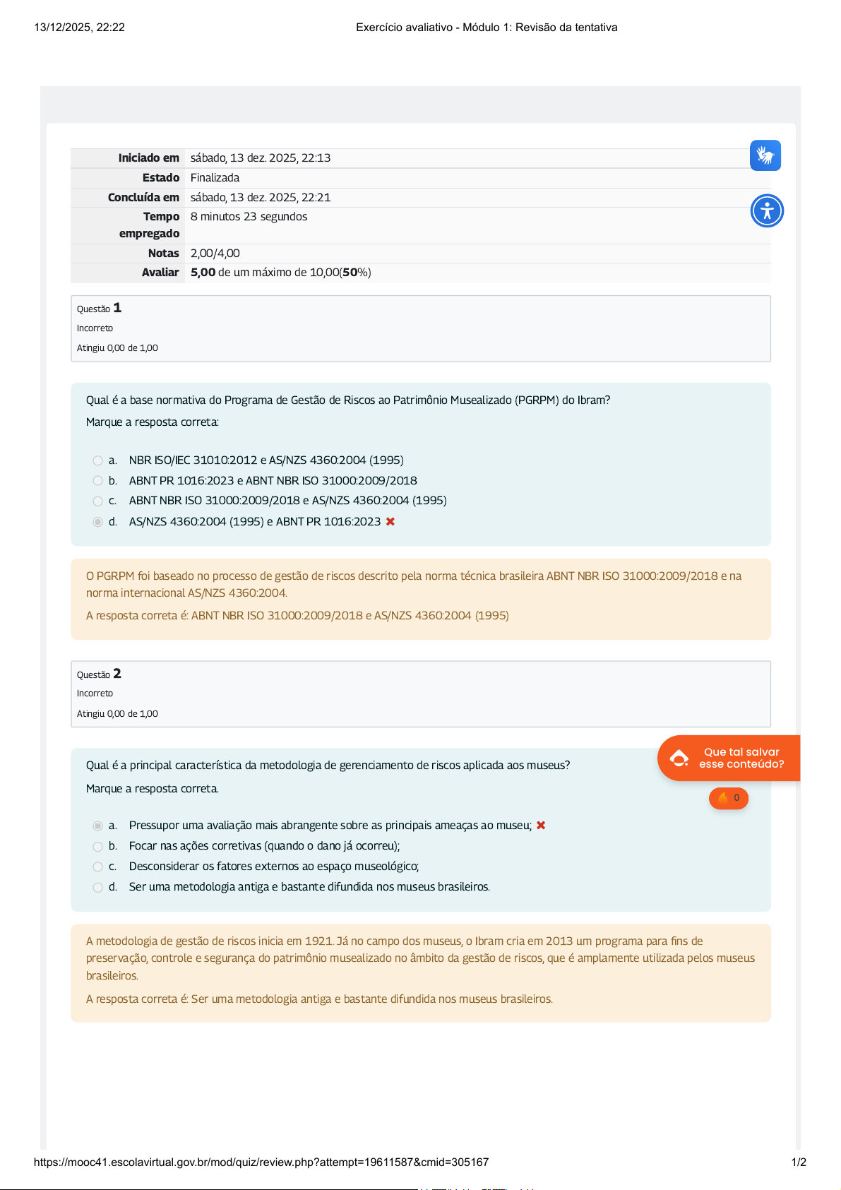 Iniciado em sábado, 13 dez. 2025, 22:13 Estado Finalizada Concluída em sábado, 13 dez. 2025, 22:21 Tempo empregado 8 minutos 23 segundos Notas 2,00/4,00 Avaliar 5,00 de um máximo de 10,00(50%) Questão 1 Incorreto Atingiu 0,00 de 1,00 Questão 2 Incorreto Atingiu 0,00 de 1,00 Qual é a base normativa do Programa de Gestão de Riscos ao Patrimônio Musealizado (PGRPM) do Ibram? Marque a resposta correta: a. NBR ISO/IEC 31010:2012 e AS/NZS 4360:2004 (1995) b. ABNT PR 1016:2023 e ABNT NBR ISO 31000:2009/2018 c. ABNT NBR ISO 31000:2009/2018 e AS/NZS 4360:2004 (1995) d. AS/NZS 4360:2004 (1995) e ABNT PR 1016:2023 O PGRPM foi baseado no processo de gestão de riscos descrito pela norma técnica brasileira ABNT NBR ISO 31000:2009/2018 e na norma internacional AS/NZS 4360:2004. A resposta correta é: ABNT NBR ISO 31000:2009/2018 e AS/NZS 4360:2004 (1995) Qual é a principal característica da metodologia de gerenciamento de riscos aplicada aos museus? Marque a resposta correta. a. Pressupor uma avaliação mais abrangente sobre as principais ameaças ao museu; b. Focar nas ações corretivas (quando o dano já ocorreu); c. Desconsiderar os fatores externos ao espaço museológico; d. Ser uma metodologia antiga e bastante difundida nos museus brasileiros. A metodologia de gestão de riscos inicia em 1921. Já no campo dos museus, o Ibram cria em 2013 um programa para fins de preservação, controle e segurança do patrimônio musealizado no âmbito da gestão de riscos, que é amplamente utilizada pelos museus brasileiros. A resposta correta é: Ser uma metodologia antiga e bastante difundida nos museus brasileiros. Que tal salvar esse conteúdo? 0 13/12/2025, 22:22 Exercício avaliativo - Módulo 1: Revisão da tentativa https://mooc41.escolavirtual.gov.br/mod/quiz/review.php?attempt=19611587&cmid=305167 1/2 Questão 3 Correto Atingiu 1,00 de 1,00 Questão 4 Correto Atingiu 1,00 de 1,00 Qual é o ciclo que constitui o método de gestão de riscos? Marque a resposta correta. a. Interpretar, organizar, avaliar e monitorar os riscos. b. Identificar, analisar, avaliar, tratar e monitorar os riscos. c. Identificar, documentar e gerir os riscos. d. Analisar, tratar e conferir os riscos. Compreender que a gestão de riscos é um processo de natureza permanente de planejamento e organização de estratégias, diretrizes e ações destinadas a aumentar a capacidade institucional de prevenção e de respostas em situações de desastres e emergências. Assim, destaca-se por meio do ciclo, que para o desenvolvimento desse método, precisamos identificar, analisar, avaliar, tratar e monitorar os riscos. A resposta correta é: Identificar, analisar, avaliar, tratar e monitorar os riscos. No âmbito da preservação de acervos, os riscos podem se manifestar de diferentes formas. Em termos de frequência, como eles podem ser classificados? Marque a resposta correta. a. Gradual e cumulativa, comuns e raros. b. Alto, médio e baixo. c. Alta intensidade e baixa intensidade. d. Evolutivo, intermediário e constante. Aqui, busca-se compreender a classificação dos riscos do ponto de vista da frequência dos eventos, a fim de preservar os acervos. A resposta correta é: Gradual e cumulativa, comuns e raros. Que tal salvar esse conteúdo? 13/12/2025, 22:22 Exercício avaliativo - Módulo 1: Revisão da tentativa https://mooc41.escolavirtual.gov.br/mod/quiz/review.php?attempt=19611587&cmid=305167 2/2
