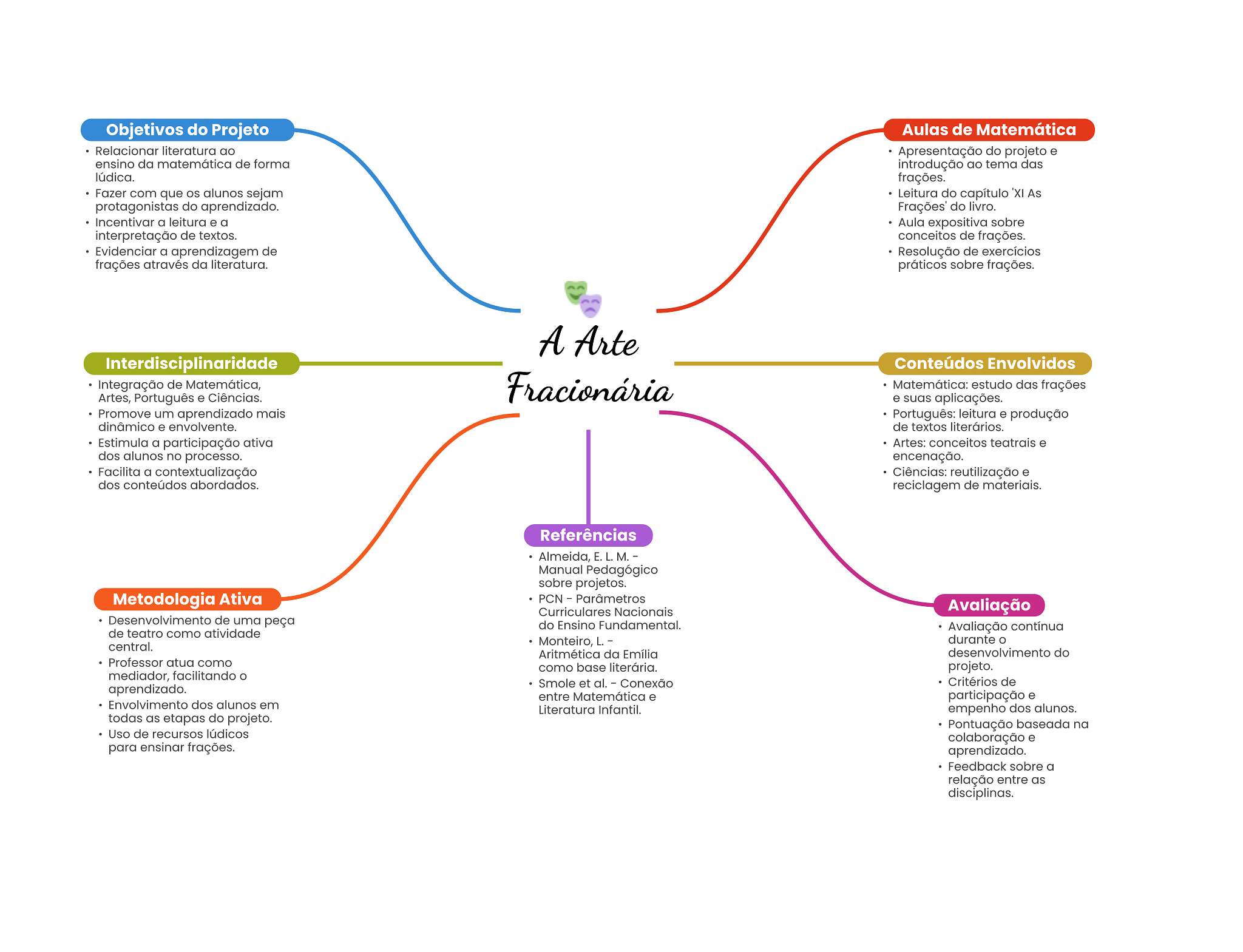 Objetivos do Projeto Aulas de Matemática Relacionar literatura ao Apresentação do projeto e ensino da matemática de forma introdução ao tema das lúdica. frações. Fazer com que alunos sejam Leitura do capítulo 'XI As protagonistas do aprendizado. do livro. Incentivar a leitura e a Aula expositiva sobre interpretação de textos. conceitos de frações. Evidenciar a aprendizagem de Resolução de exercícios frações através da literatura. práticos sobre frações. A Arte Interdisciplinaridade Conteúdos Envolvidos Integração de Matemática, Fracionária Matemática: estudo das frações Artes, Português e Ciências. e suas aplicações. Promove um aprendizado mais Português: leitura e produção dinâmico e envolvente. de textos literários. Estimula a participação ativa Artes: conceitos teatrais e dos alunos no processo. encenação. Facilita a contextualização Ciências: reutilização e dos conteúdos abordados. reciclagem de materiais. Referências Almeida, E. L. M. Manual Pedagógico sobre projetos. Metodologia Ativa PCN Parâmetros Curriculares Nacionais Avaliação Desenvolvimento de uma peça do Ensino Fundamental. de teatro como atividade Avaliação contínua central. Monteiro, L. durante Aritmética da Emília desenvolvimento do Professor atua como como base literária. projeto. mediador, facilitando Smole et al. Conexão Critérios de aprendizado. entre Matemática e participação e Envolvimento dos alunos em Literatura Infantil. empenho dos alunos. todas as etapas do projeto. Pontuação baseada na Uso de recursos lúdicos colaboração e para ensinar frações. aprendizado. Feedback sobre a relação entre as disciplinas.