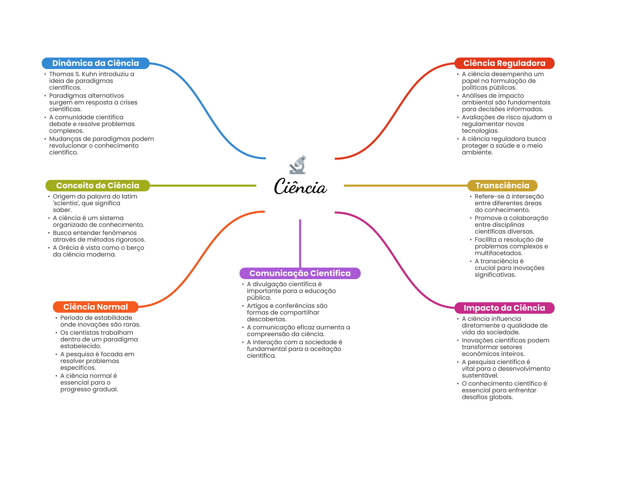 Dinâmica da Ciência Ciência Reguladora Thomas S. Kuhn introduziu a A ciência desempenha um ideia de paradigmas papel na formulação de científicos. políticas públicas. Paradigmas alternativos Análises de impacto surgem em resposta a crises ambiental são fundamentais científicas. para decisões informadas. A comunidade científica Avaliações de risco ajudam a debate e resolve problemas regulamentar novas complexos. tecnologias. Mudanças de paradigmas podem A ciência reguladora busca revolucionar conhecimento proteger a saúde e meio científico. ambiente. Conceito de Ciência Ciência Transciência Origem da palavra do latim Refere-se à interseção que significa entre diferentes áreas saber. do conhecimento. A ciência é um sistema Promove a colaboração organizado de conhecimento. entre disciplinas Busca entender fenômenos científicas diversas. através de métodos rigorosos. Facilita a resolução de A Grécia é vista como O berço problemas complexos e da ciência moderna. multifacetados. A transciência é crucial para inovações Comunicação Científica significativas. A divulgação científica é importante para a educação pública. Ciência Normal Artigos e conferências são Impacto da Ciência formas de compartilhar Período de estabilidade descobertas. A ciência influencia onde inovações são raras. A comunicação eficaz aumenta a diretamente a qualidade de Os cientistas trabalham compreensão da ciência. vida da sociedade. dentro de um paradigma A interação com a sociedade é Inovações científicas podem estabelecido. fundamental para a aceitação transformar setores A pesquisa é focada em científica. econômicos inteiros. resolver problemas A pesquisa científica é específicos. vital para O desenvolvimento A ciência normal é sustentável. essencial para O conhecimento científico é progresso gradual. essencial para enfrentar desafios globais.