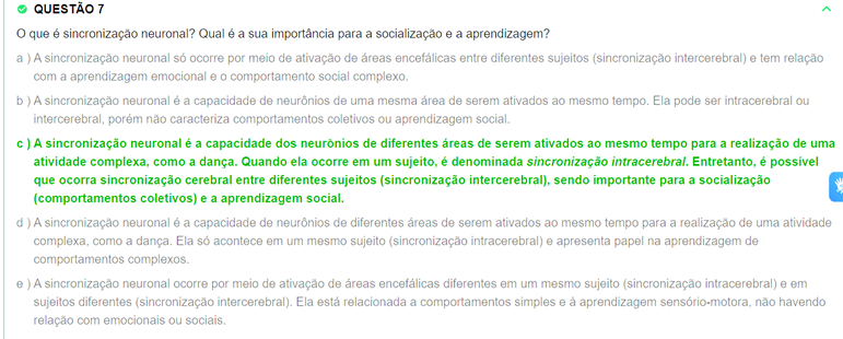 QUESTÃO 7 O que é sincronização neuronal? Qual é a sua importância para a socialização e a aprendizagem? a )A sincronização neuronal ocorre por meio de ativação de entre diferentes sujeitos (sincronização intercerebral) e tem relação com a aprendizagem emocional e 0 comportamento social complexo. b ) A sincronização neuronal é a capacidade de de uma mesma area de serem ativados ao mesmo tempo. Ela pode ser intracerebral ou intercerebral, porem não caracteriza comportamentos coletivos ou aprendizagem social. ) A sincronização neuronal é a capacidade dos neuronios de diferentes áreas de serem ativados ao mesmo tempo para a realização de uma atividade como a dança. Quando ela ocorre em um sujeito, é denominada sincronização intracerebral. Entretanto, é que ocorra sincronização cerebral entre diferentes sujeitos (sincronização sendo importante para a socialização (comportamentos coletivos) e a aprendizagem social. d) A sincronização neuronal é a capacidade de de diferentes de serem ativados ao mesmo tempo para a realização de uma atividade complexa, como a dança. Ela acontece em um mesmo sujeito (sincronização intracerebral) e apresenta papel na aprendizagem de comportamentos complexos. e ) A sincronização neuronal ocorre por meio de ativação de diferentes em um mesmo sujeito (sincronização intracerebral) e em sujeitos diferentes (sincronização intercerebral). Ela está relacionada a comportamentos simples e à aprendizagem não havendo relação com emocionais ou sociais.
