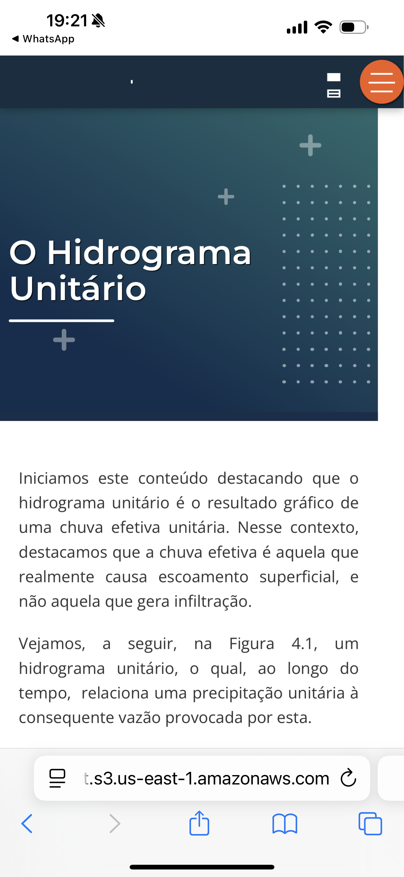 19:21 WhatsApp + + Hidrograma Unitário + Iniciamos este conteúdo destacando que hidrograma unitário é resultado gráfico de uma chuva efetiva unitária. Nesse contexto, destacamos que a chuva efetiva é aquela que realmente causa escoamento superficial, e não aquela que gera infiltração. Vejamos, a seguir, na Figura 4.1, um hidrograma unitário, qual, ao longo do tempo, relaciona uma precipitação unitária à consequente vazão provocada por esta. Oli t.s3.us-east-1.amazonaws.com