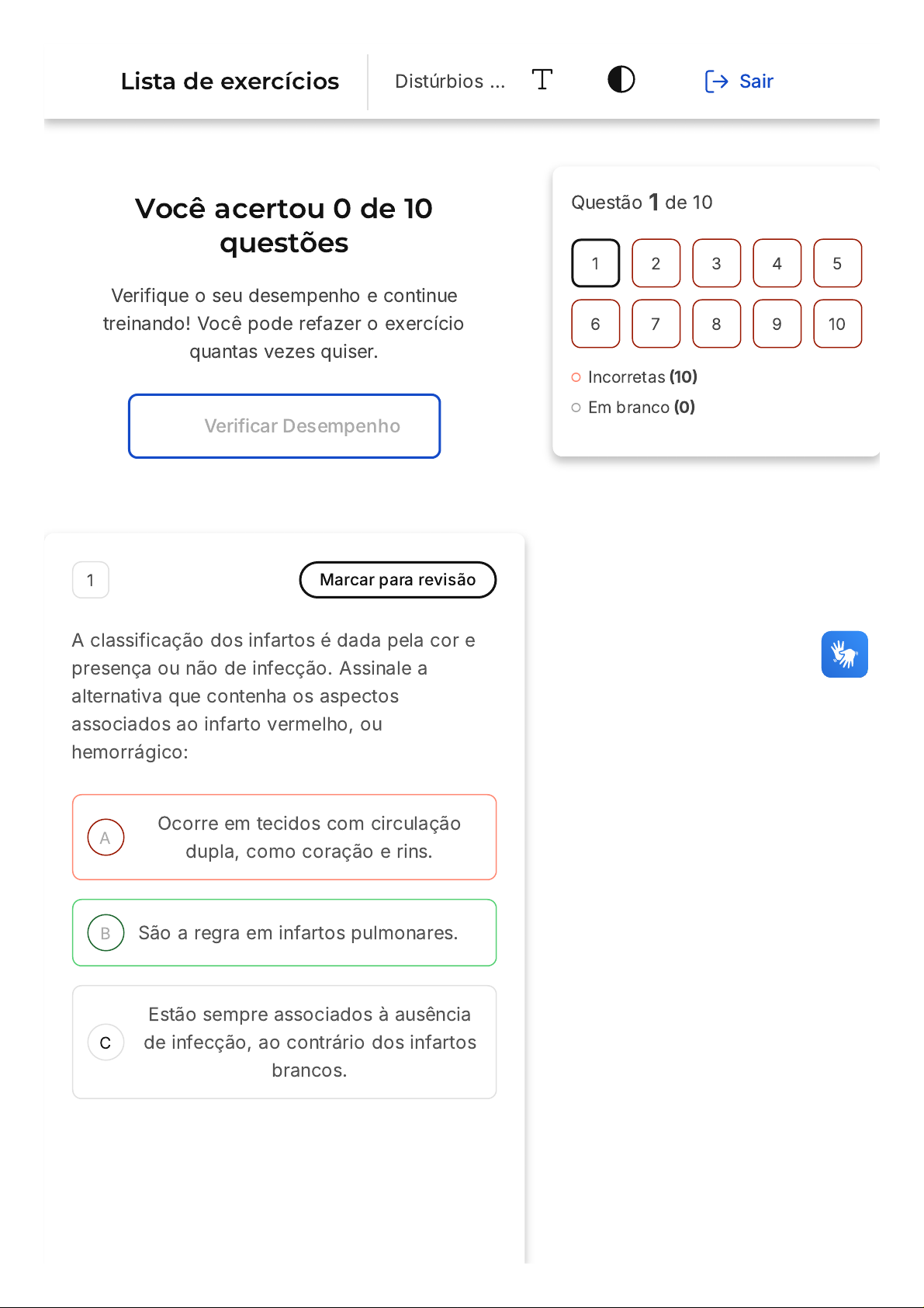 Você acertou 0 de 10 questões Verifique o seu desempenho e continue treinando! Você pode refazer o exercício quantas vezes quiser. Verificar Desempenho A B C 1 Marcar para revisão A classificação dos infartos é dada pela cor e presença ou não de infecção. Assinale a alternativa que contenha os aspectos associados ao infarto vermelho, ou hemorrágico: Ocorre em tecidos com circulação dupla, como coração e rins. São a regra em infartos pulmonares. Estão sempre associados à ausência de infecção, ao contrário dos infartos brancos. Questão 1 de 10 Incorretas (10) Em branco (0) 1 2 3 4 5 6 7 8 9 10 Lista de exercícios Distúrbios … Sair D E Ocorrem com obstruções arteriais em órgãos em que há muito volume sanguíneo circulante, como coração e fígado. Quando recentes, os infartos tendem a apresentar-se levemente anêmicos, ganhando cor com sua progressão. Resposta incorreta Opa! A alternativa correta é a letra B. Confira o gabarito comentado! Gabarito Comentado No pulmão, os infartos hemorrágicos são a regra, mas eles ocorrem nas seguintes circunstâncias: Com obstruções venosas (torção testicular). Em tecidos em que o sangue pode se acumular na zona de infarto (pulmão). Em tecidos com circulação dupla (fígado e pulmão, por exemplo), em que o fluxo sanguíneo de um vaso paralelo, desobstruído, pode preencher a área necrótica. Em tecidos previamente congestos, por conta do fluxo venoso mais lento. Quando há o reestabelecimento do fluxo sanguíneo para um local de obstrução arterial e necrose prévia. 2 Marcar para revisão Além do coração e dos vasos linfáticos, o sistema circulatório é composto por uma extensa rede de transporte, formada pelas artérias, veias e capilares. Assinale a alternativa A B C D E que contenha a correta estrutura e a função dos vasos sanguíneos: As artérias são classificadas em três tipos, na ordem: artérias musculares, artérias elásticas e arteríolas. Comparativamente às veias, as artérias possuem paredes mais resistentes, além de diâmetro e luz maiores. A organização das artérias e veias se dá em três camadas, ao contrário dos capilares, que são formados apenas por uma camada de células endoteliais e pericitos. A camada adventícia é a camada em contato com o sangue circulante, formada por única camada de células endoteliais sobre sua membrana basal. A regulação do fluxo sanguíneo para os tecidos é realizada na microcirculação, em que as arteríolas possuem válvulas que impedem o fluxo retrógrado. Resposta incorreta Opa! A alternativa correta é a letra C. Confira o gabarito comentado! Gabarito Comentado As artérias e veias são formadas por três camadas: a íntima, a média e a adventícia. A íntima é a camada mais interna, A B composta por células endoteliais e uma camada de tecido conjuntivo. A média é a camada intermediária, composta por fibras musculares lisas e tecido conjuntivo. A adventícia é a camada mais externa, composta por tecido conjuntivo. Os capilares são formados apenas por uma camada de células endoteliais e pericitos. 3 Marcar para revisão O endotélio é um fator fundamental na manutenção da hemostasia, desempenhando inúmeras funções na formação do tampão hemostático. Sobre a função das células endoteliais saudáveis, leia as afirmativas: I. Proteger o fator de von Willebrand e colágeno subendotelial do contato com as plaquetas. II. Prevenir a ocorrência de trombose a partir da expressão de fatores fibrinolíticos. III. Inibir a ativação e agregação plaquetária, pela liberação de prostaciclina e óxido nítrico. IV. Proporcionar o contato do fator tecidual com os fatores de coagulação, inibindo a cascata. V. Sintetizar o ativador de plasminogênio tecidual, componente fundamental da fibrinólise. De acordo com o exposto, marque a opção certa. Somente I, II, IV e V estão corretas. Somente I, II, III e V estão corretas. C D E Somente II, III, IV e V estão corretas. Somente III, IV e V estão corretas. Somente I, II e III estão corretas. Resposta incorreta Opa! A alternativa correta é a letra B. Confira o gabarito comentado! Gabarito Comentado Uma das funções do endotélio saudável é servir como barreira, protegendo as plaquetas do fator de von Willebrand e do colágeno subendotelial. Porém, o endotélio normal também libera várias moléculas que inibem a ativação e agregação plaquetária, como o óxido nítrico e a prostaciclina. As células endoteliais também possuem capacidade de se ligar à trombina, um dos principais ativadores de plaquetas, alterando assim sua atividade. Em relação à cascata de coagulação, o endotélio normal impede o contato do fator tecidual na parede vascular com os fatores de coagulação. Além disso, expressa várias moléculas que são antagônicas à coagulação, especialmente trombomodulina, receptores de proteína C endotelial e inibidores da via do fator tecidual. Por fim, as células endoteliais sintetizam o ativador de plasminogênio tecidual que, como já discutimos, é um componente primordial da via fibrinolítica. A B C 4 Marcar para revisão O choque é um distúrbio progressivo que pode levar à morte se não corrigido a tempo. Em relação aos tipos e as fases de desenvolvimento do choque, é correto o que se afirma em: Os choques hipovolêmico e cardiogênico, quando ocorrem, são imediatamente fatais. Já o choque séptico tende a apresentar fases de desenvolvimento bem estabelecidas. O agravamento do desequilíbrio metabólico na fase progressiva é decorrente da substituição da respiração aeróbica pela glicólise anaeróbia, com produção de ácido lático. O prognóstico dos casos de choque depende essencialmente do tipo de choque. Pacientes que desenvolvem choque hipovolêmico, independentemente da idade, tendem a apresentar infarto agudo do miocárdio e vir a óbito. D E A acidose lática, na fase não progressiva, leva ao aumento do pH tecidu