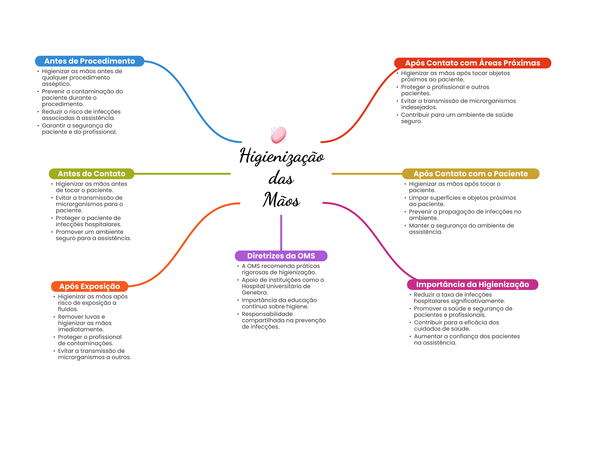 Antes de Procedimento Após Contato com Áreas Próximas Higienizar as mãos antes de Higienizar as mãos após tocar objetos qualquer procedimento próximos ao paciente. asséptico. Proteger profissional e outros Prevenir a contaminação do pacientes. paciente durante procedimento. Evitar a transmissão de microrganismos indesejados. Reduzir risco de infecções associadas à assistência. Contribuir para um ambiente de saúde seguro. Garantir a segurança do paciente e do profissional. Higienização Antes do Contato das Após Contato com Paciente Higienizar as mãos antes Higienizar as mãos após tocar O de tocar paciente. paciente. Evitar a transmissão de microrganismos para Mãos Limpar superfícies e objetos próximos ao paciente. paciente. Prevenir a propagação de infecções no Proteger paciente de ambiente. infecções hospitalares. Manter a segurança do ambiente de Promover um ambiente assistência. seguro para a assistência. Diretrizes da OMS A OMS recomenda práticas rigorosas de higienização. Apoio de instituições como Após Exposição Hospital Universitário de Importância da Higienização Genebra. Higienizar as mãos após Reduzir a taxa de infecções risco de exposição a Importância da educação hospitalares significativamente. fluidos. contínua sobre higiene. Promover a saúde e segurança de Remover luvas e Responsabilidade pacientes e profissionais. higienizar as mãos compartilhada na prevenção Contribuir para a eficácia dos imediatamente. de infecções. cuidados de saúde. Proteger profissional Aumentar a confiança dos pacientes de contaminações. na assistência. Evitar a transmissão de microrganismos a outros.