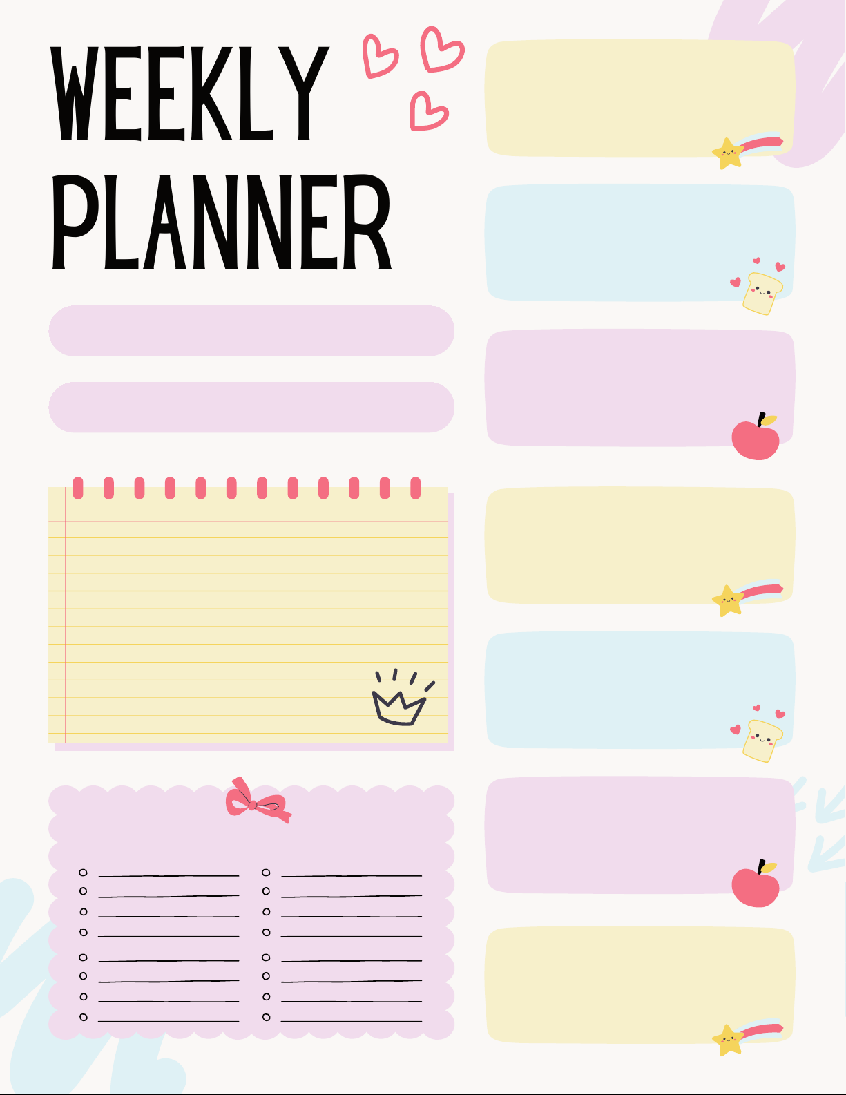 Sunday WEEKLY PLANNER Week of: Month: Monday Tuesday Notes To Do List Wednesday Saturday Thursday Friday WEEKLY SCHEDULE MONDAY WEDNESDAY THURSDAY FRIDAY SATURDAY SUNDAY NOTES TUESDAY