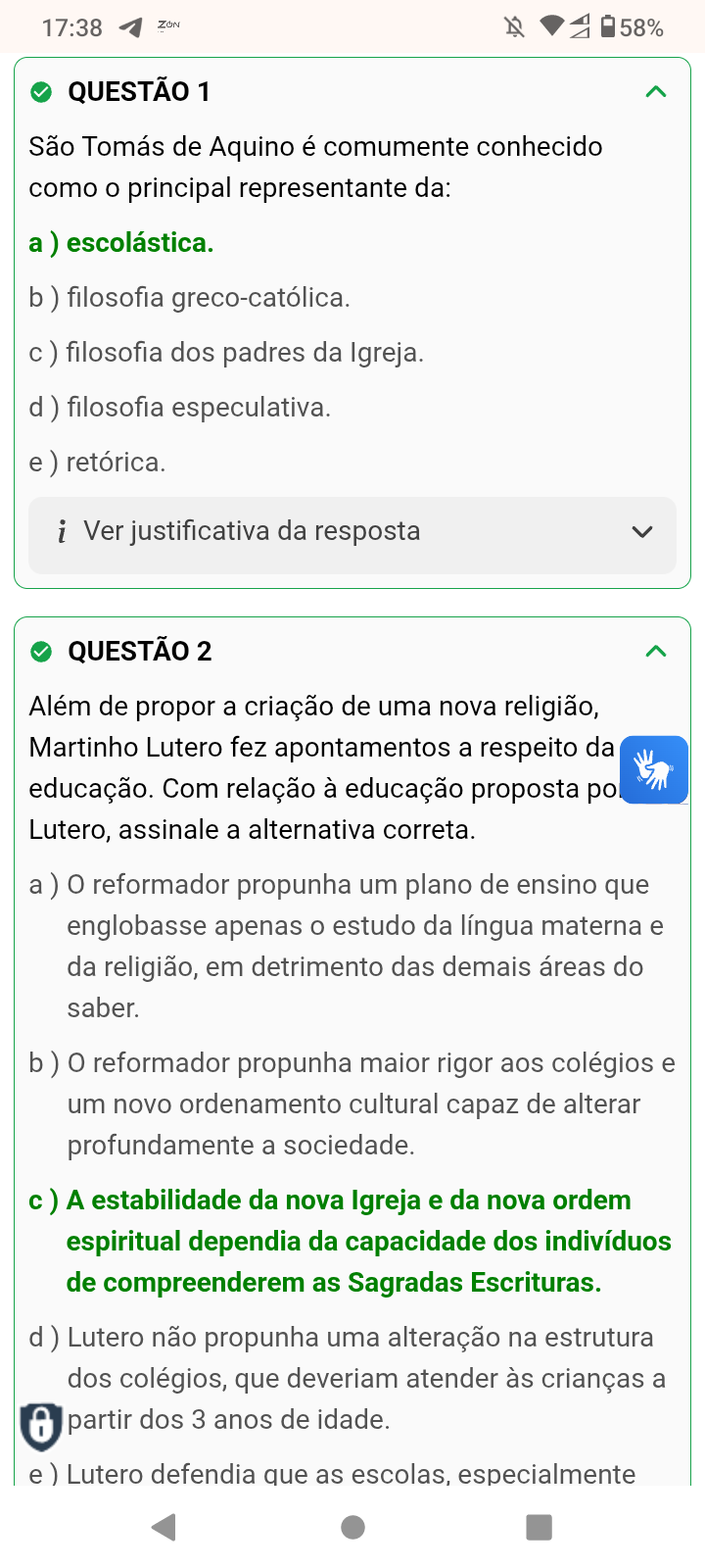17:38 ZON 58% QUESTÃO 1 São Tomás de Aquino é comumente conhecido como o principal representante da: a ) escolástica. b) filosofia greco-católica. c) filosofia dos padres da Igreja. d) filosofia especulativa. retórica. i Ver justificativa da resposta QUESTÃO 2 Além de propor a criação de uma nova religião, Martinho Lutero fez apontamentos a respeito da educação. Com relação à educação proposta po Lutero, assinale a alternativa correta. a) reformador propunha um plano de ensino que englobasse apenas o estudo da língua materna e da religião, em detrimento das demais áreas do saber. b) reformador propunha maior rigor aos colégios e um novo ordenamento cultural capaz de alterar profundamente a sociedade. A estabilidade da nova Igreja e da nova ordem espiritual dependia da capacidade dos indivíduos de compreenderem as Sagradas Escrituras. d) Lutero não propunha uma alteração na estrutura dos colégios, que deveriam atender às crianças a partir dos 3 anos de idade. Lutero defendia que as escolas, especialmente