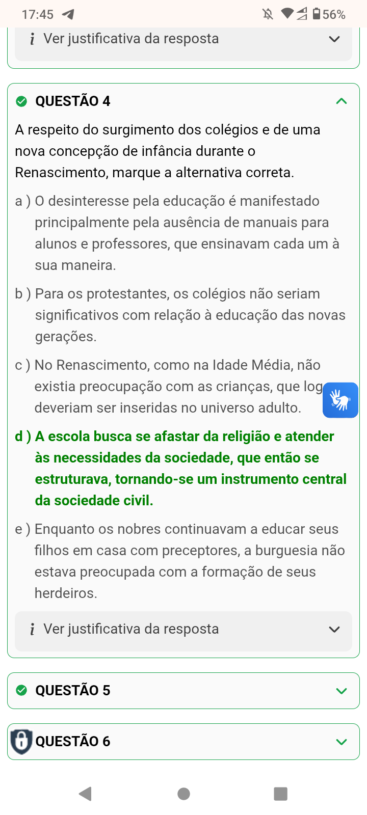 17:45 56% i Ver justificativa da resposta QUESTÃO 4 A respeito do surgimento dos colégios e de uma nova concepção de infância durante o Renascimento, marque a alternativa correta. a) 0 desinteresse pela educação é manifestado principalmente pela ausência de manuais para alunos e professores, que ensinavam cada um à sua maneira. b) Para os protestantes, os colégios não seriam significativos com relação à educação das novas gerações. c) No Renascimento, como na Idade Média, não existia preocupação com as crianças, que log deveriam ser inseridas no universo adulto. d) A escola busca se afastar da religião e atender às necessidades da sociedade, que então se estruturava, tornando-se um instrumento central da sociedade civil. e) Enquanto os nobres continuavam a educar seus filhos em casa com preceptores, a burguesia não estava preocupada com a formação de seus herdeiros. i Ver justificativa da resposta QUESTÃO 5 QUESTÃO 6