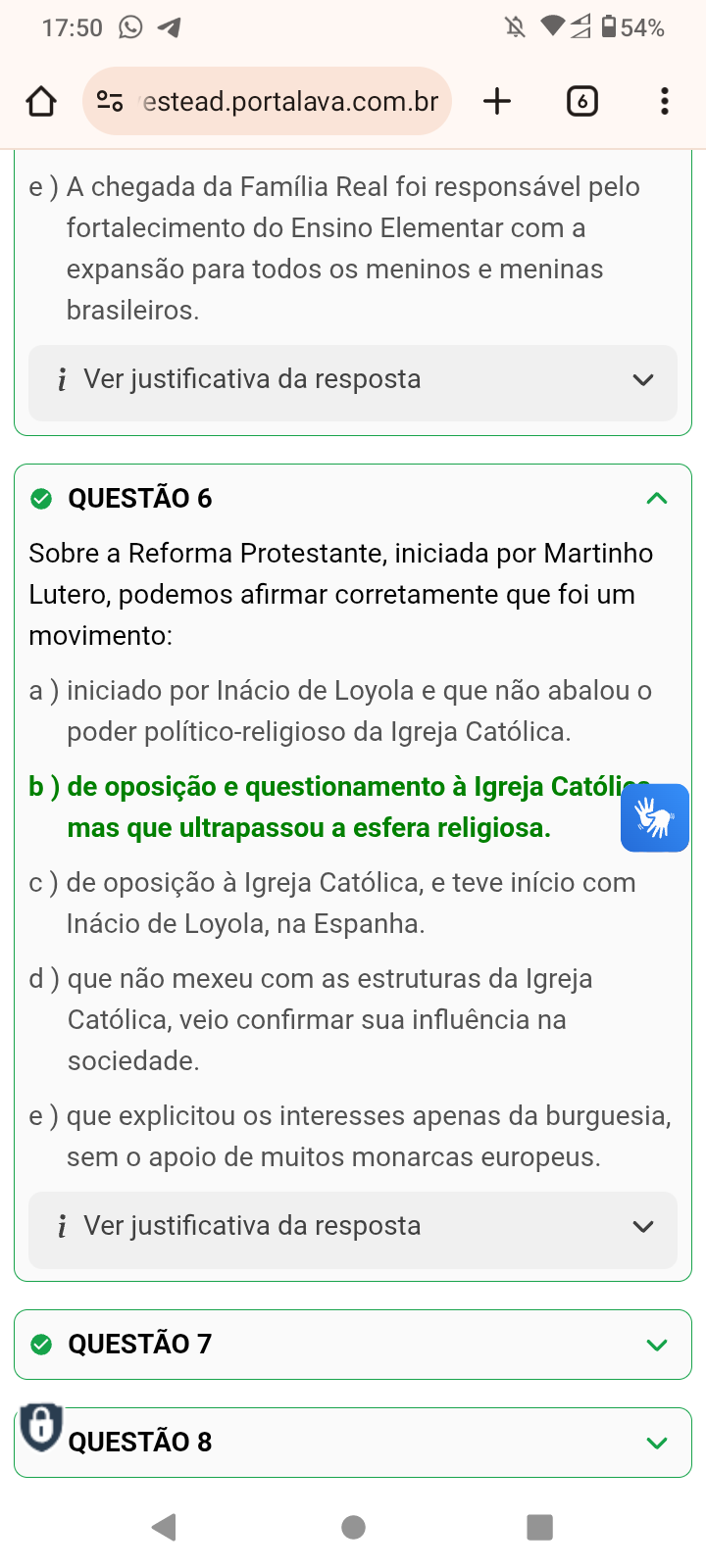17:50 54% estead.portalava.com.br + 6 A chegada da Família Real foi responsável pelo fortalecimento do Ensino Elementar com a expansão para todos os meninos e meninas brasileiros. i Ver justificativa da resposta QUESTÃO 6 Sobre a Reforma Protestante, iniciada por Martinho Lutero, podemos afirmar corretamente que foi um movimento: a) iniciado por Inácio de Loyola e que não abalou o poder político-religioso da Igreja Católica. b) de oposição e questionamento à Igreja Católi mas que ultrapassou a esfera religiosa. c) de oposição à Igreja Católica, e teve início com Inácio de Loyola, na Espanha. d) que não mexeu com as estruturas da Igreja Católica, veio confirmar sua influência na sociedade. e) que explicitou os interesses apenas da burguesia, sem o apoio de muitos monarcas europeus. i Ver justificativa da resposta QUESTÃO 7 QUESTÃO 8