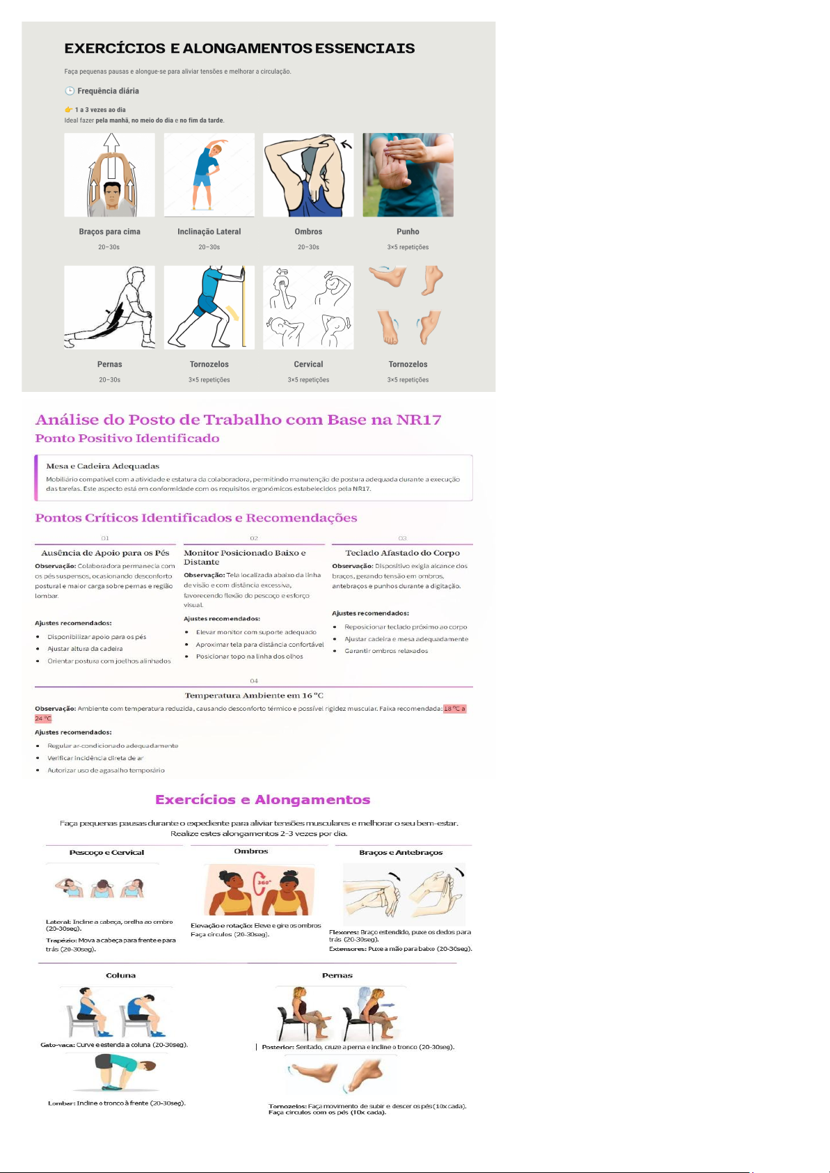 EXERCÍCIOS E ALONGAMENTOS ESSENCIAIS Faça pequenas pausas e alongue-se para aliviar tensões e melhorar a circulação. Frequência diária 1 3 vezes ao dia Ideal fazer pela manhã, no meio do dia e no fim da tarde. Braços para cima Inclinação Lateral Ombros Punho 20-30s 20-30s 20-30s 3x5 repetições Pernas Tornozelos Cervical Tornozelos 20-30s 3x5 repetições 3x5 repetições 3x5 repetições Análise do Posto de Trabalho com Base na NR17 Ponto Positivo Identificado Mesa e Cadeira Adequadas Mobiliário compatível com a atividade e estatura da colaboradora, permitindo manutenção de postura adequada durante a execução das tarefas. Este aspecto está em conformidade com os requisitos ergonómicos estabelecidos pela Pontos Críticos Identificados e Recomendações 01 02 03 Ausência de Apoio para os Pés Monitor Posicionado Baixo e Teclado Afastado do Corpo Distante Observação: Colaboradora permanecia com Observação: Dispositivo exigia alcance dos pés suspensos, ocasionando desconforto Observação: Tela localizada abaixo da linha braços, gerando tensão em ombros, postural maior carga sobre pernas e região de visão e com distância excessiva, antebraços e punhos durante a digitação. lombar. favorecendo flexão do pescoço e esforço visual. Ajustes recomendados: Ajustes recomendados: Ajustes recomendados: Reposicionar teclado próximo ao corpo Elevar monitor com suporte adequado Disponibilizar apoio para os pés Ajustar cadeira e mesa adequadamente Aproximar tela para distância confortável Ajustar altura da cadeira Garantir ombros relaxados Posicionar topo na linha dos olhos Orientar postura com joelhos alinhados 04 Temperatura Ambiente em °C Observação: Ambiente com temperatura reduzida, causando desconforto térmico e possível rigidez muscular. Faixa recomendada: Ajustes recomendados: Regular ar-condicionado adequadamente Verificar incidência direta de ar Autorizar uso de agasalho temporário Exercícios e Alongamentos Faça pequenas pausas durante expediente para aliviar tensões musculares e melhorar seu bem-estar. Realize estes alongamentos 2-3 vezes por dia. Pescoço e Cervical Ombros Braços e Antebraços Lateral: Indine a cabeça, orelha ao ombro (20-30seg). Elevação e rotação: Eleve e gire os ombros Faça círculos (20-30seg). Flexores: Braço estendido, puxe dedos para Trapézio: Mova a cabeça para frente epara trás (20-30seg). trás (20-30seg). Extensores: Puxe a mão para baixo (20-30seg). Coluna Pernas Gato-vaca: Curve e estenda a coluna (20-30seg). Posterior: Sentado, cruze a perna indine tronco (20-30seg). Lombar: tronco à frente (20-30seg). Tornozelos: Faça movimento de subir e descer pés (10x cada). Faça circulos com pés (10x cada).