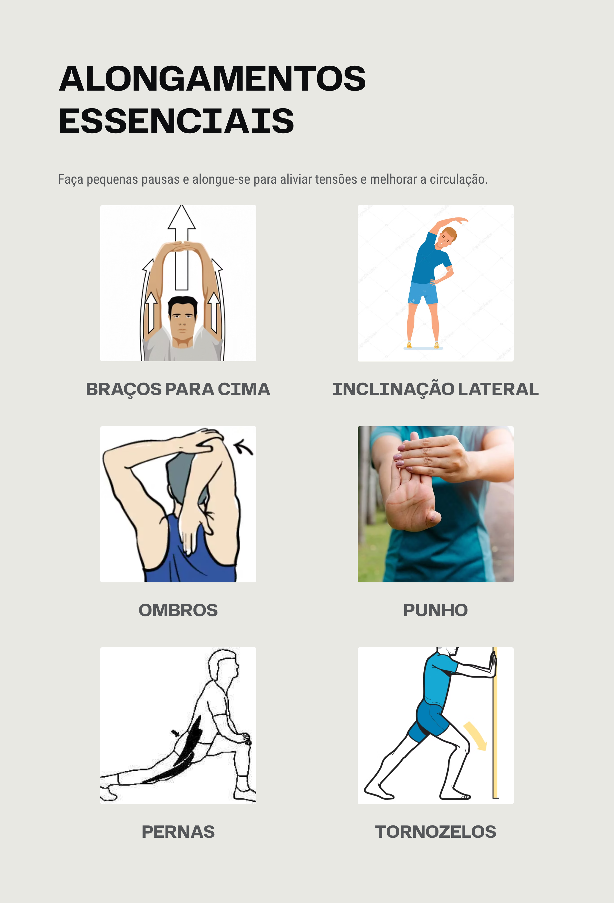 ALONGAMENTOS ESSENCIAIS Faça pequenas pausas e alongue-se para aliviar tensões e melhorar a circulação. BRAÇOS PARA CIMA INCLINAÇÃO LATERAL OMBROS PUNHO PERNAS TORNOZELOS