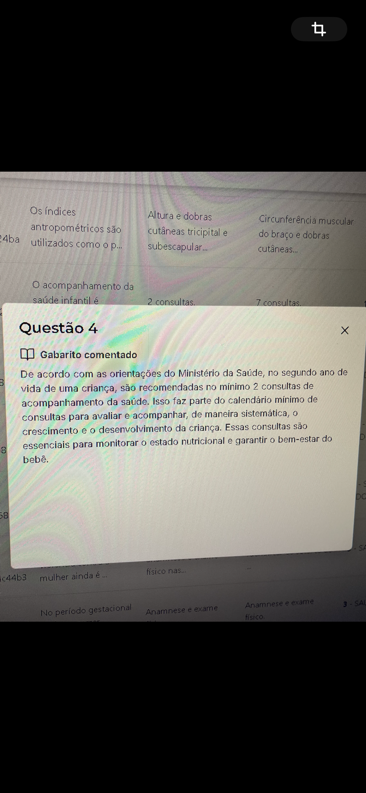 Os índices Altura e dobras Circunferência muscular antropométricos são cutâneas tricipital e do braço e dobras 4ba utilizados como p... subescapular... cutâneas... acompanhamento da saúde infantil é 2 consultas. 7 consultas. Questão 4 X Gabarito comentado 8 De acordo com as orientações do Ministério da Saúde, no segundo ano de vida de uma criança, são recomendadas no mínimo 2 consultas de acompanhamento da saúde. Isso faz parte do calendário mínimo de consultas para avaliar e acompanhar, de maneira sistemática, crescimento e desenvolvimento da criança. Essas consultas são 8 essenciais para monitorar estado nutricional e garantir bem-estar do D bebê. DC mulher ainda é físico nas... No período gestacional Anamnese e exame Anamnese e exame 3 SA físico.