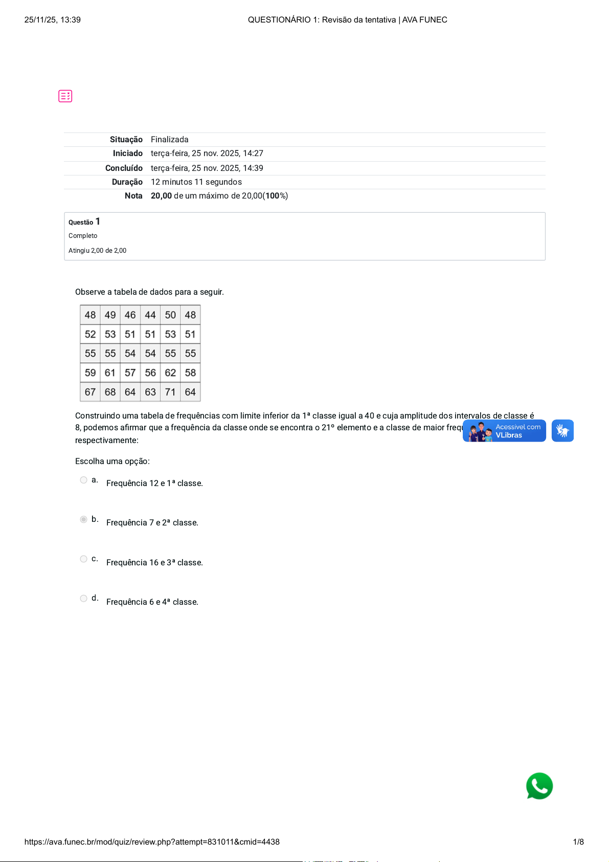 Situação Finalizada Iniciado terça-feira, 25 nov. 2025, 14:27 Concluído terça-feira, 25 nov. 2025, 14:39 Duração 12 minutos 11 segundos Nota 20,00 de um máximo de 20,00(100%) Questão 1 Completo Atingiu 2,00 de 2,00 Observe a tabela de dados para a seguir. Construindo uma tabela de frequências com limite inferior da 1ª classe igual a 40 e cuja amplitude dos intervalos de classe é 8, podemos afirmar que a frequência da classe onde se encontra o 21º elemento e a classe de maior frequência são respectivamente: Escolha uma opção: a. Frequência 12 e 1ª classe. b. Frequência 7 e 2ª classe. c. Frequência 16 e 3ª classe. d. Frequência 6 e 4ª classe. 25/11/25, 13:39 QUESTIONÁRIO 1: Revisão da tentativa | AVA FUNEC https://ava.funec.br/mod/quiz/review.php?attempt=831011&cmid=4438 1/8 Questão 2 Completo Atingiu 2,00 de 2,00 Veja a tabela apresentada a seguir: Fazendo uma distribuição de frequências determinando o número de Classes pela regra da raiz quadrada e tendo o menor dado da tabela como o limite inferior da 1ª classe e cujas classes tem 12 como amplitude do intervalo de classes, podemos afirmar que a diferença entre a amplitude total e a amplitude amostral; a frequência da 3ª classe e o ponto médio da 5ª classes são respectivamente: Escolha uma opção: a. 8; 1 e 46. b. 12; 5 e 67. c. 7; 8 e 55. d. 3; 13 e 61. 25/11/25, 13:39 QUESTIONÁRIO 1: Revisão da tentativa | AVA FUNEC https://ava.funec.br/mod/quiz/review.php?attempt=831011&cmid=4438 2/8 Questão 3 Completo Atingiu 2,00 de 2,00 Observe as informações a seguir: I. Diariamente pelos mais diversos meios de comunicação a estatística apresenta dados interessantes sobre algum evento que afeta direta ou indiretamente sua vida. II. Tendo conhecimento e sabendo aplicar os métodos estatísticos você pode ter melhor organização e consolidação dos dados bem como maior agilidade no processamento dos dados. III. A estatística tem como objetivo principal fornecer ferramentas que ao serem utilizadas permite lidarmos com situações sujeitas a incertezas. IV. A estatística indutiva parte de uma amostra, estabelece hipóteses sobre a população de origem, formula previsões com fundamentos na teoria das probabilidades e seu maior objetivo é informar, prevenir e esclarecer. Após boa leitura, pode-se afirmar que: Escolha uma opção: a. São falsas as afirmativas II e IV. b. Somente a afirmativa IV é verdadeira. c. São verdadeiras as afirmativas I, II e III. d. A Afirmativa III é a única falsa. 25/11/25, 13:39 QUESTIONÁRIO 1: Revisão da tentativa | AVA FUNEC https://ava.funec.br/mod/quiz/review.php?attempt=831011&cmid=4438 3/8 Questão 4 Completo Atingiu 2,00 de 2,00 Observe a seguir os dados tabelados. Construa uma tabela de frequências com 7 classes, onde o limite inferior da 1ª classe é o menor valor tabelado e o limite superior da 7ª classe é o maior valor tabelado. Para esta tabela, podemos afirmar que a frequência relativa da 3ª classe, a frequência relativa acumulada da 5ª classe e a frequência relativa percentual da 7 classe são respectivamente: Escolha uma opção: a. 0,12 – 0,14 – 14%. b. 0,34 – 0,28 – 6% c. 0,25 – 0,54 – 21%. d. 0,17 – 0,79 – 7%. 25/11/25, 13:39 QUESTIONÁRIO 1: Revisão da tentativa | AVA FUNEC https://ava.funec.br/mod/quiz/review.php?attempt=831011&cmid=4438 4/8 Questão 5 Completo Atingiu 2,00 de 2,00 Questão 6 Completo Atingiu 2,00 de 2,00 Ao se analisar um conjunto de dados, começa-se por considerar as diferentes categorias ou classes, e para cada uma delas calcula-se a sua frequência absoluta obtendo-se a distribuição de frequências do conjunto de dados. Esta distribuição de frequências é representada na forma de uma tabela, a que se dá o nome de tabela de frequências. Analise a tabela de frequências a seguir: Podemos dizer que o 27°(vigésimo sétimo) elemento da amostra está na classe de número: Escolha uma opção: a. 4. b. 5. c. 3. d. 2. Em uma pesquisa de opinião sobre o ensino semipresencial do UNEC, foram escolhidos alunos de alguns cursos: Curso de Engenharia, 63 alunos, Farmácia, 37 alunos, Psicologia, 54 alunos, Nutrição, 28 alunos e Educação Física com 68 alunos. Destes alunos deseja-se uma amostra de 25 alunos. Na ordem em que aparecem os cursos acima, podemos afirmar que o número de alunos por curso para esta amostra será de: Escolha uma opção: a. 5, 3, 4, 5, 8. b. 5, 4, 6, 7, 1. c. 7, 6, 4, 5, 3. d. 6, 4, 5, 3, 7. 25/11/25, 13:39 QUESTIONÁRIO 1: Revisão da tentativa | AVA FUNEC https://ava.funec.br/mod/quiz/review.php?attempt=831011&cmid=4438 5/8 Questão 7 Completo Atingiu 2,00 de 2,00 Questão 8 Completo Atingiu 2,00 de 2,00 Para receber um prêmio, o NEAD com 3.400 alunos matriculados na disciplina de Estatística, selecionou uma amostra de 200 alunos. Supondo que o primeiro aluno selecionado por sorteio seja o número 8, os números dos seis primeiros alunos selecionados são respectivamente: Escolha uma opção: a. 8, 13, 17, 24, 33, 42. b. 8, 31, 45, 56, 72, 93. c. 8, 18, 28, 38, 48, 58. d. 8, 25, 42, 59, 76, 93. Observe e complete a tabela apresentada a seguir. Após completar a tabela, os valores definidos por A, B, c e D, são respectivamente: Escolha uma opção: a. 12 – 0,136 – 0,324 – 28. b. 06 – 0,225 – 0,475 – 36. c. 07 – 0,104 – 0,125 – 56. d. 09 – 0,275 – 0,800 – 68. 25/11/25, 13:39 QUESTIONÁRIO 1: Revisão da tentativa | AVA FUNEC https://ava.funec.br/mod/quiz/review.php?attempt=831011&cmid=4438 6/8 Questão 9 Completo Atingiu 2,00 de 2,00 Leia atentamente as afirmativas a seguir: I. Toda distribuição de frequência é uma forma de apresentar aleatoriamente os dados de uma pesquisa. II. Na distribuição de frequências em classes, todas as amplitudes das classes necessariamente devem ser iguais. III. Frequência são Intervalos nos quais os valores da variável analisada são agrupados. IV. Em uma tabela Primitiva onde os dados estão organizados, 