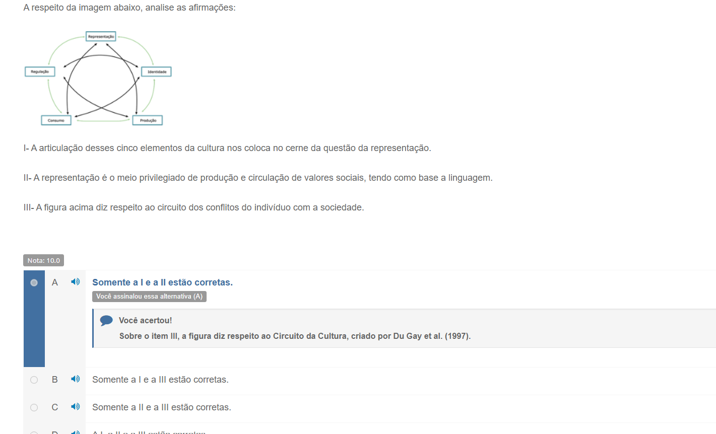 A respeito da imagem abaixo, analise as afirmações: Representação Regulação Identidade Consumo Produção A articulação desses cinco elementos da cultura nos coloca no cerne da questão da representação. II- A representação é O meio privilegiado de produção e circulação de valores sociais, tendo como base a linguagem. III- A figura acima diz respeito ao circuito dos conflitos do indivíduo com a sociedade. Nota: 10.0 A Somente a I e a estão corretas. Você assinalou essa alternativa (A) Você acertou! Sobre O item III, a figura diz respeito ao Circuito da Cultura, criado por Du Gay et al. (1997). Somente a e a III estão corretas. C Somente a e a 11 estão corretas.