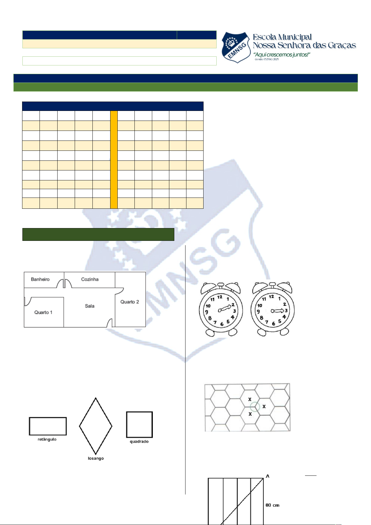 ESCOLA MUNICIPAL NOSSA SENHORA DAS GRAÇAS ESTUDANTE: TURMA: 9º ANO III AVALIAÇÃO TRIMESTRAL 2025 MATEMÁTICA MATEMÁTICA REGRAS PARA AVALIAÇÃO · Use apenas caneta azul ou preta. · Não rasure nem marque mais de uma alternativa por questão. · Preencha o gabarito com atenção. · É proibido o uso de celular ou qualquer aparelho eletrônico. · Mantenha silêncio durante a prova. · Em caso de dúvida, chame o professor. · Respeite o tempo estipulado. BOA PROVA! EMNSG 2025 😊♡ 1º A B C D 2º A B C D 3º A B C D 4º A B C D 5º A B C D 6º A B C D 7º A B C D 8º A B C D 9º A B C D 10º A B C D Professor Marcos Lourenço 1º) Identificar a localização e movimentação de objeto em mapas, croquis e outras representações gráficas. Ao entrar em sua casa pela porta da sala e virar à direita, Juca está indo em direção: A) à cozinha. B) ao banheiro. C) ao quarto 1. D) ao quarto 2. 2º) O professor Marcos desenhou no quadro os quadriláteros abaixo.. Uma das propriedades comuns desses quadriláteros é: A) Os quatro ângulos são retos. B) Os quatro lados têm mesma medida. C) As diagonais são perpendiculares. D) Os lados opostos são paralelos. 6º) Pelo ponteiro de minutos do relógio indica que passou 5 minutos. Esse intervalo de tempo indica (A) 10° (B) 15° (C) 30° (D) 90° 7º) Na figura, os três ângulos indicados tem a mesma medida. O valor de x é: . A) 60° B) 90° C) 120° D) 135° 8º) A trave AB torna rígido o portão retangular da figura. Seu comprimento, em centímetros, é: (A) (B) 70 (C) 100 (D) 140 3º) Marta está a brincar com um papagaio. Sabendo que o papagaio se encontra a 7 metros de altura e que a Marta está a 24 metros de distância da sombra do papagaio, indica quanto mede o fio que o segura. (A) O fio mede 23 metros (B) O fio mede 25 metros (C) O fio mede 31 metros (D) O fio mede 35 metros 4º) O perímetro de um polígono é obtido através da soma de todas as medidas de seus lados. O perímetro do polígono da figura a seguir é 5º) Observe a expressão no quadro abaixo. O número escrito no último quadro é (A) -20. (B) -18. (C) 18. (D) 34. 9º) O número 0,47 corresponde à fração: A) B) C) D) 10º) As raízes da equação 3x² + 15x = 0 são: (A) -3 e -5. (B) 0 e -5. (C) 0 e 5. (D) 3 e 5. image3.emf image4.emf image5.emf image6.emf image7.emf image8.emf image9.emf image10.emf image11.emf image1.png image2.png