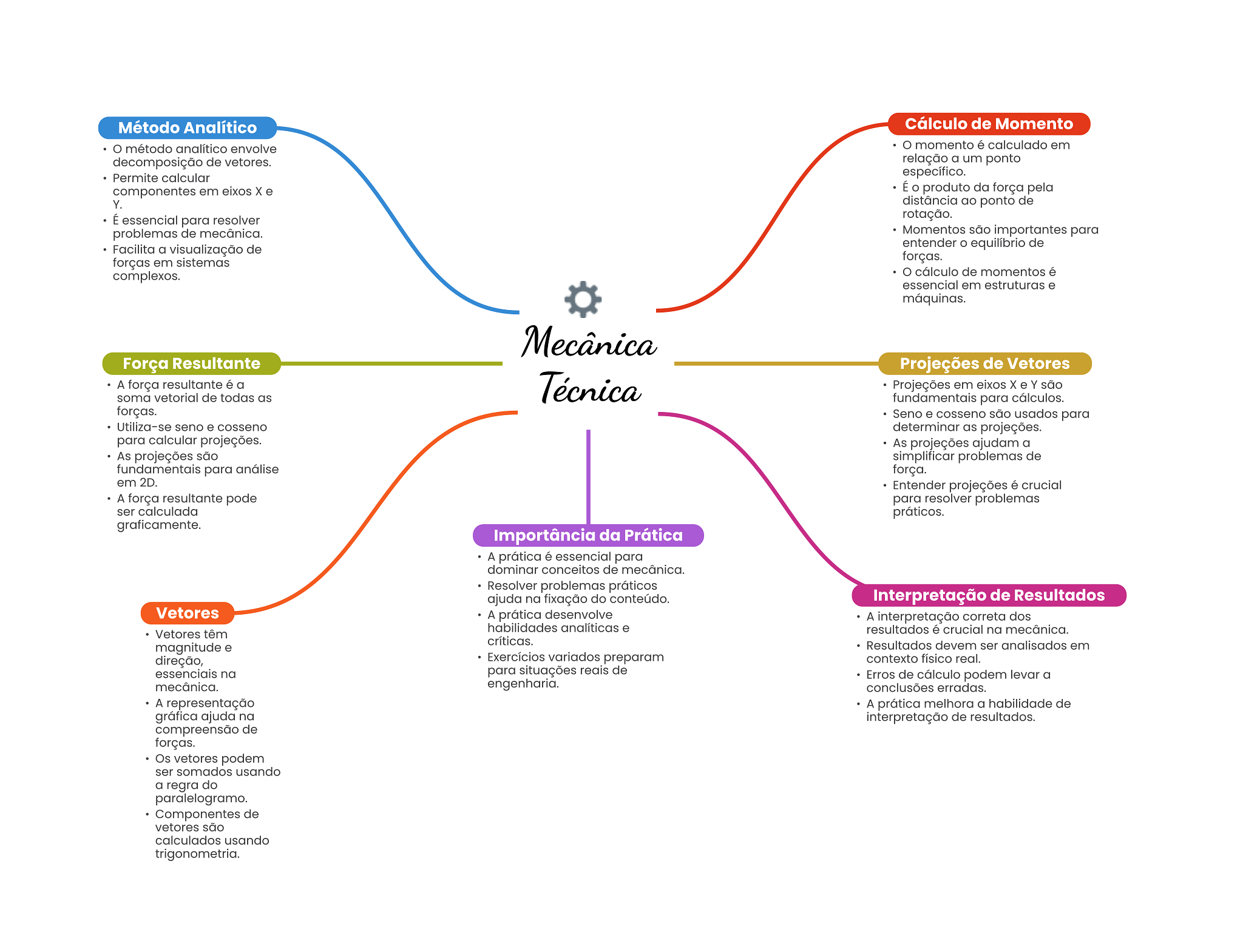 Método Analítico Cálculo de Momento método analítico envolve momento é calculado em decomposição de vetores. relação a um ponto Permite calcular específico. componentes em eixos X e É produto da força pela Y. distância ao ponto de É essencial para resolver rotação. problemas de mecânica. Momentos são importantes para Facilita a visualização de entender equilíbrio de forças em sistemas forças. complexos. cálculo de momentos é essencial em estruturas e máquinas. Mecânica Força Resultante Projeções de Vetores A força resultante é a Técnica Projeções em eixos X e Y são soma vetorial de todas as fundamentais para cálculos. forças. Seno e cosseno são usados para Utiliza-se seno e cosseno determinar as projeções. para calcular projeções. As projeções ajudam a As projeções são simplificar problemas de fundamentais para análise força. em 2D. Entender projeções é crucial A força resultante pode para resolver problemas ser calculada práticos. graficamente. Importância da Prática A prática é essencial para dominar conceitos de mecânica. Resolver problemas práticos ajuda na fixação do conteúdo. Interpretação de Resultados Vetores A prática desenvolve A interpretação correta dos habilidades analíticas e Vetores têm resultados é crucial na mecânica. críticas. magnitude e Resultados devem ser analisados em direção, Exercícios variados preparam contexto físico real. essenciais na para situações reais de Erros de cálculo podem levar a mecânica. engenharia. conclusões erradas. A representação A prática melhora a habilidade de gráfica ajuda na interpretação de resultados. compreensão de forças. Os vetores podem ser somados usando a regra do paralelogramo. Componentes de vetores são calculados usando trigonometria.