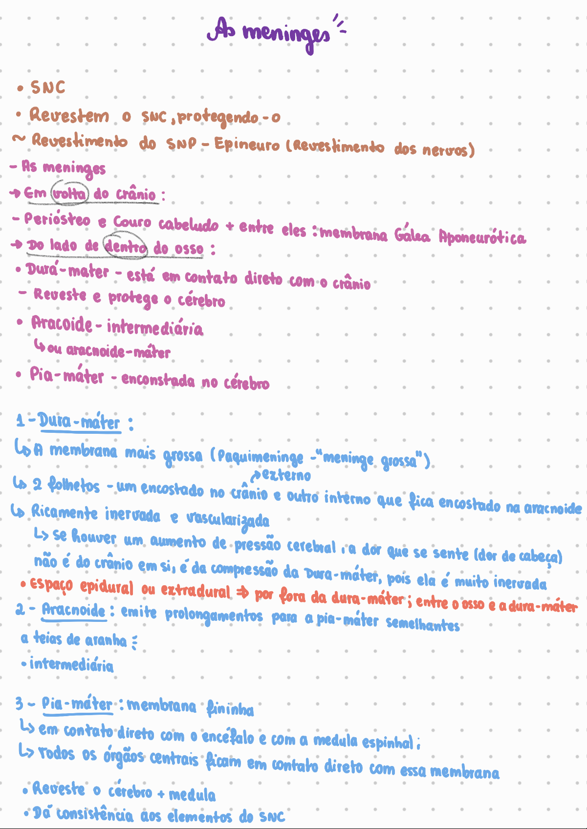 As SNC Revestem SNC protegendo 2 Revestimento do SNP - Epineuro (Revestimento dos nervos) - As meninges Em volta do crânio : - Periósteo e Couro cabeludo + entre eles :membrana Gálea Aponeurótica DO lado de dentro do osso : - está em contato direto crânio - Reveste e protege cérebro Aracoide - intermediária ou aracnoide-mater Pia-máter - enconstada no cérebro 1 : A membrana mais grossa (Paquimeninge -"meninge grossa") externo 2 folhetos um encostado no crânio e outro interno que fica encostado na aracnoide Ricamente inervada e vascularizada se houver um aumento de pressão cerebral dor que se sente (dor de cabeca) não é do crânio em si, é da compressão da Dura-máter, pois ela é muito inervada Espaço epidural ou extradural por fora da entre osso e a 2 Aracnoide : emite prolongamentos para a pia-máter semelhantes a teias de aranha intermediária 3 - Pia-máter : membrana fininha em contato direto com encéfalo e com a medula espinhal rodos os órgãos centrais ficam em contato direto com essa membrana Reveste cerebro + medula consistência elementos do SNCEntre essas meninges existem espacos vértebras D epidural ou extradural : entre osso do crânio e a dura-máter só existirá se tiver um coágulo - formando um hematoma extradural /epidural ; em condições normais esse espaço não existe Na medula espinhal tem uma gordura entre osso canal medular e a dura máter existe uma camada de chamada Gordura epidural' entre as vértebras e a dura-máter espaco epidural das vértebras D Subdural : entre a dura-máter e a aracnoide pessoa bate a cabeca e um traumatismo e tem um hematoma subdural ou extradural ; - extradural : hematoma entre e a dura-máter ; - subdural : hematoma entre dura-máter e a aracnoide D Subaracnóideo ou Subaracnoideu entre a aracnoide e a pia-máter espaço + importante entre as meninges, pois e onde circula líquor/ líquido céfalo raquidiano ou líquido cérebro espinhal mecanicamente SNC lubrifica e protege Meningite Outros nomes: Meningite viral meningite Visão geral Sintomas Tratamentos Notícias Especialistas Dor de cabeça grave e pescoço rígido Meninges Cérebro inflamadas causam dor Crânio Medula espinhal Cérebro Fonte Inflamação das membranas que revestem o cérebro e a medula espinhal, geralmente causada por uma infecção. A meningite geralmente é causada por uma infecção viral, mas também pode ser de origem bacteriana ou fúngica. As vacinas podem prevenir algumas formas de meningite.