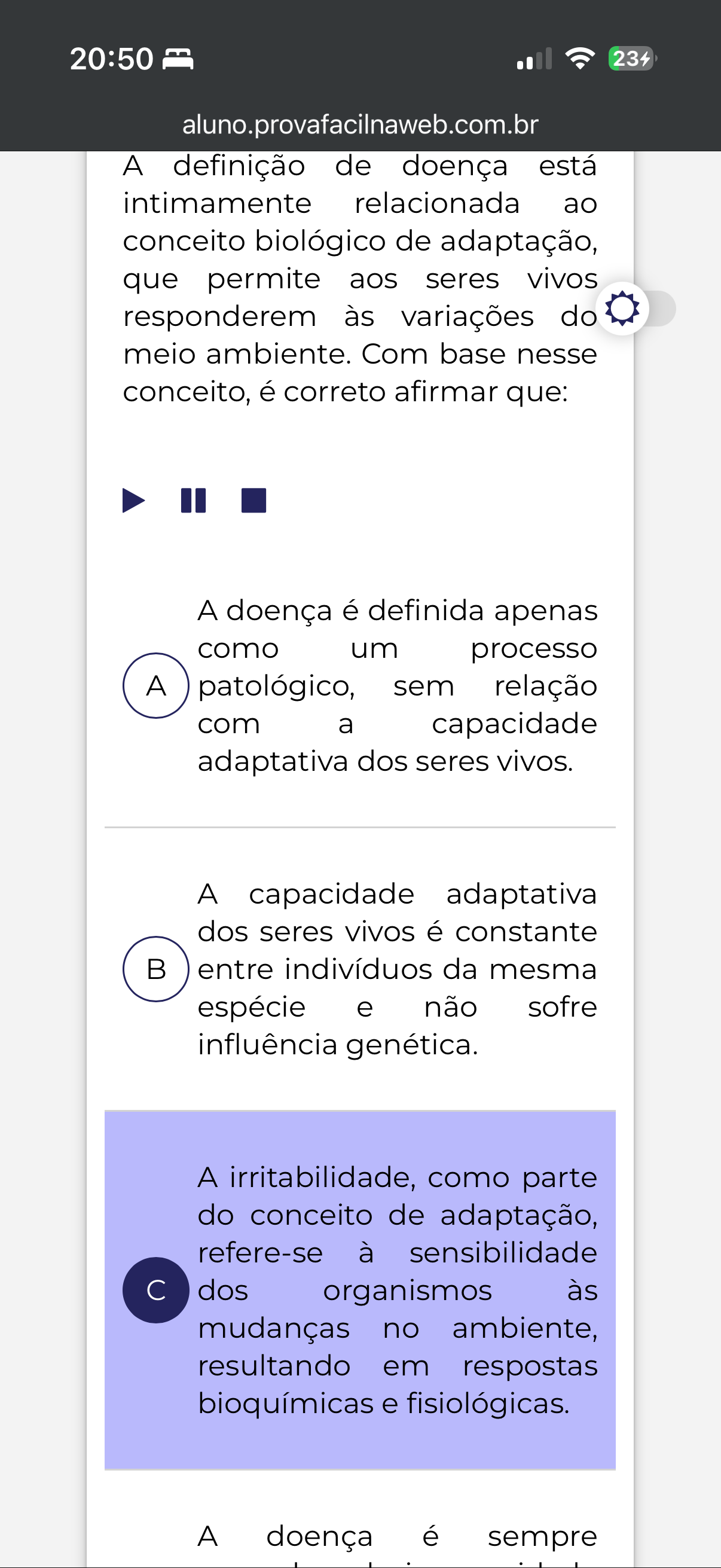 20:50 234 aluno.provafacilnaweb.com.br A definição de doença está intimamente relacionada ao conceito biológico de adaptação, que permite aos seres vivos responderem às variações do meio ambiente. Com base nesse conceito, é correto afirmar que: A doença é definida apenas como um processo A patológico, sem relação com a capacidade adaptativa dos seres vivos. A capacidade adaptativa dos seres vivos é constante B entre indivíduos da mesma espécie e não sofre influência genética. A irritabilidade, como parte do conceito de adaptação, refere-se à sensibilidade dos organismos às mudanças no ambiente, resultando em respostas bioquímicas e fisiológicas. A doença é sempre