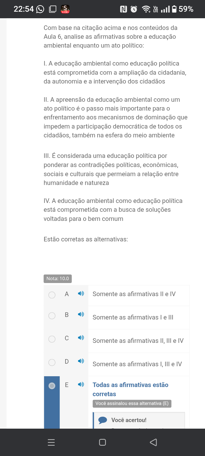 22:54 S N 59% Com base na citação acima e nos conteúdos da Aula 6, analise as afirmativas sobre a educação ambiental enquanto um ato político: I. A educação ambiental como educação política está comprometida com a ampliação da cidadania, da autonomia e a intervenção dos cidadãos II. A apreensão da educação ambiental como um ato político é passo mais importante para enfrentamento aos mecanismos de dominação que impedem a participação democrática de todos cidadãos, também na esfera do meio ambiente III. É considerada uma educação política por ponderar as contradições políticas, econômicas, sociais e culturais que permeiam a relação entre humanidade e natureza IV. A educação ambiental como educação política está comprometida com a busca de soluções voltadas para bem comum Estão corretas as alternativas: Nota: 10.0 A Somente as afirmativas e IV Somente as afirmativas e III Somente as afirmativas II, III e IV D Somente as afirmativas I, III e IV E Todas as afirmativas estão corretas Você assinalou essa alternativa (E) Você acertou!