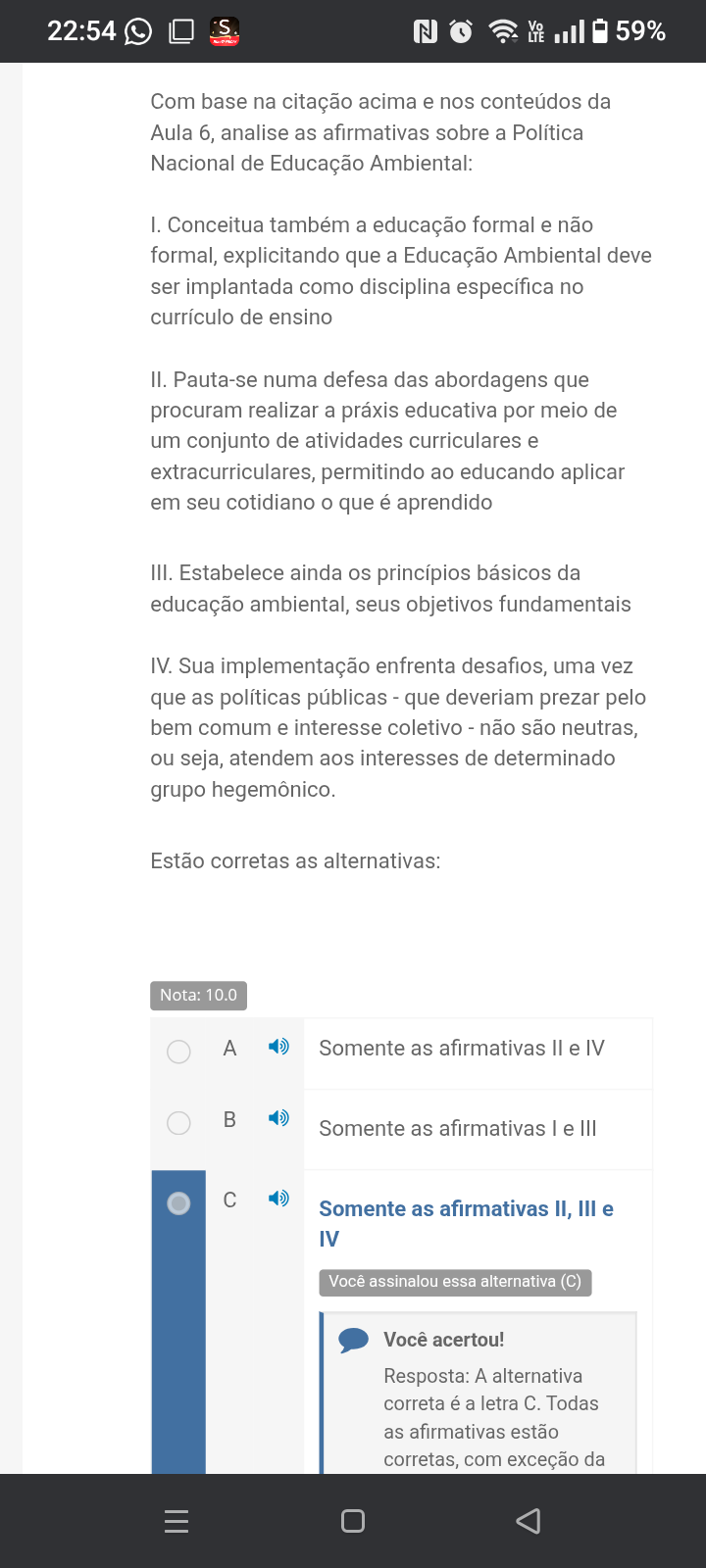 22:54 S N 59% Com base na citação acima e nos conteúdos da Aula 6, analise as afirmativas sobre a Política Nacional de Educação Ambiental: I. Conceitua também a educação formal e não formal, explicitando que a Educação Ambiental deve ser implantada como disciplina específica no currículo de ensino II. Pauta-se numa defesa das abordagens que procuram realizar a práxis educativa por meio de um conjunto de atividades curriculares e extracurriculares, permitindo ao educando aplicar em seu cotidiano que é aprendido III. Estabelece ainda princípios básicos da educação ambiental, seus objetivos fundamentais IV. Sua implementação enfrenta desafios, uma vez que as políticas públicas que deveriam prezar pelo bem comum e interesse coletivo não são neutras, ou seja, atendem aos interesses de determinado grupo hegemônico. Estão corretas as alternativas: Nota: 10.0 A Somente as afirmativas e IV Somente as afirmativas e III c Somente as afirmativas II, III e IV Você assinalou essa alternativa (C) Você acertou! Resposta: A alternativa correta é a letra C. Todas as afirmativas estão corretas, com exceção da
