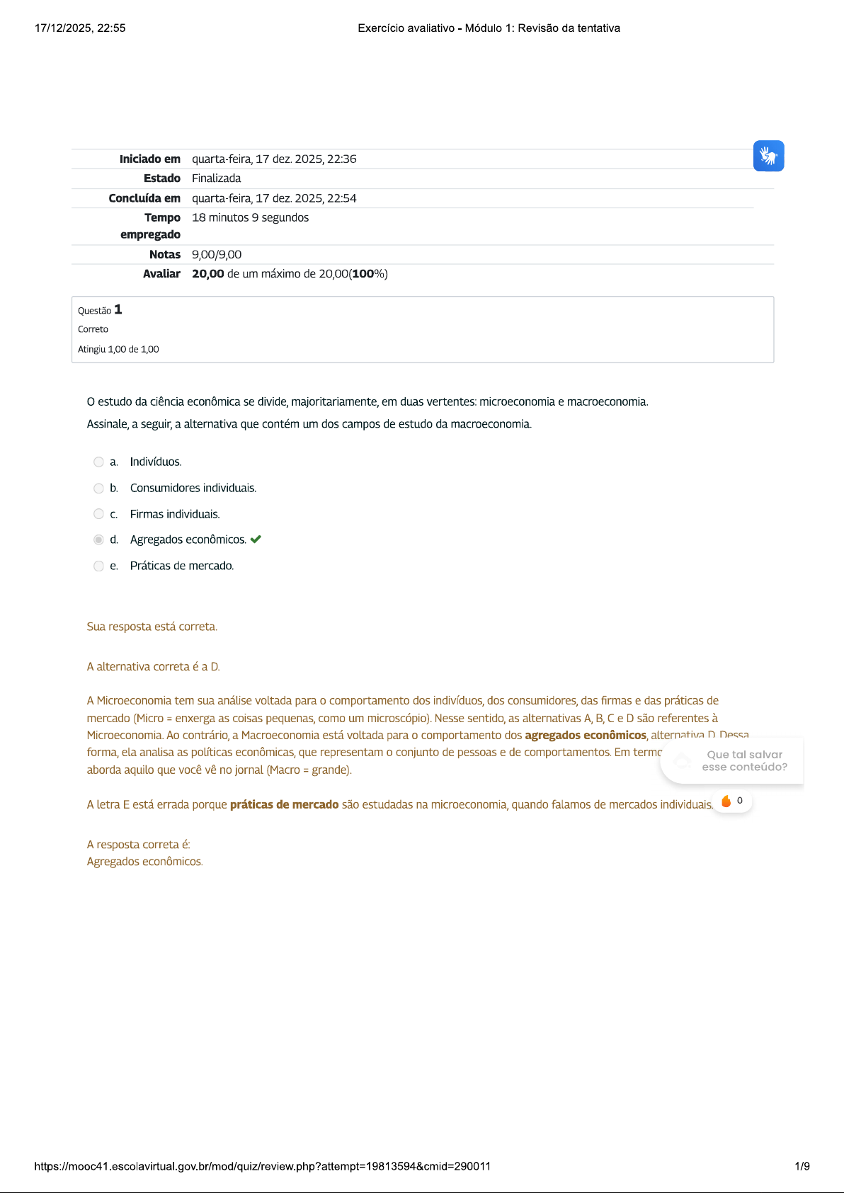 17/12/2025, 22:55 Exercício avaliativo Módulo 1: Revisão da tentativa Iniciado em quarta-feira, 17 dez. 2025, 22:36 Estado Finalizada Concluída em quarta-feira, 17 dez. 2025, 22:54 Tempo 18 minutos 9 segundos empregado Notas 9,00/9,00 Avaliar 20,00 de um máximo de 20,00(100%) Questão 1 Correto Atingiu 1,00 de 1,00 estudo da ciência econômica se divide, majoritariamente, em duas vertentes: microeconomia e macroeconomia. Assinale, a seguir, a alternativa que contém um dos campos de estudo da macroeconomia. a. Indivíduos. b. Consumidores individuais. C. Firmas individuais. d. Agregados econômicos. e. Práticas de mercado. Sua resposta está correta. A alternativa correta é a D. A Microeconomia tem sua análise voltada para 0 comportamento dos indivíduos, dos consumidores, das firmas e das práticas de mercado (Micro = enxerga as coisas pequenas, como um microscópio). Nesse sentido, as alternativas A, e D são referentes à Microeconomia. Ao contrário, a Macroeconomia está voltada para comportamento dos agregados econômicos, alternativa D Dessa forma, ela analisa as políticas econômicas, que representam 0 conjunto de pessoas e de comportamentos. Em termo Que tal salvar aborda aquilo que você vê no jornal (Macro = grande). esse conteúdo? A letra E está errada porque práticas de mercado são estudadas na microeconomia, quando falamos de mercados individuais. A resposta correta é: Agregados econômicos. 1/917/12/2025, 22:55 Exercício avaliativo Módulo 1: Revisão da tentativa Questão 2 Correto Atingiu 1,00 de 1,00 Produto Interno Bruto (PIB) é a soma do valor dos bens e serviços finais produzidos em uma dada economia, em um período de tempo. Assinale, a seguir, a alternativa que NÃO corresponde a uma das características desse agregado econômico. a. Mede a produção de fatores de produção nacionais. b. É uma variável fluxo. C. É medido pelo IBGE em um período de 1 ano. d. Pode ser medido de forma trimestral. e. Não contabiliza bens intermediários. Sua resposta está correta. A única alternativa que não descreve uma característica do PIB é a a qual se refere ao PNB Produto Nacional Bruto. A saber, PIB é diferente do PNB, que mede a produção de fatores de produção nacionais, ou seja, a produção de mão de obra, capital ou terra de origem nacional. As demais alternativas (B,C,D e E) correspondem a características do agregado econômico PIB. 0 PIB é uma variável fluxo, é medido para um ano, mas possui apurações trimestrais e mede a produção apenas dos bens finais, excluindo os bens intermediários da contagem. A resposta correta é: Mede a produção de fatores de produção nacionais. Que tal salvar esse conteúdo? 2/917/12/2025, 22:55 Exercício avaliativo Módulo 1: Revisão da tentativa Questão 3 Correto Atingiu 1,00 de 1,00 Os mercados se equilibram em seu ponto de maior eficiência. Porém, há situações específicas em que livre mercado, ou seja, a livre interação entre oferta e demanda, resulta em um equilíbrio ineficiente do ponto de vista econômico. São as chamadas falhas de mercado. Qual das alternativas a seguir se refere à falha de mercado que aborda risco moral e de seleção adversa? a. Externalidade. b. Assimetria de informação. C. Bens públicos. d. Mercados incompletos. e. Monopólio natural. Sua resposta está correta. A alternativa correta é a B. Há dois tipos principais de riscos na existência de assimetria de informações: 0 risco de seleção adversa e risco moral, 0 que torna a alternativa A correta. A seleção adversa é 0 risco de selecionar um produto ruim por não saber das suas reais características, como no caso do carro usado. Ele ocorre antes da transação. 0 risco moral, por outro lado, é 0 de uma das partes mudar de conduta depois da transação. As demais alternativas são incorretas, pois correspondem a outros tipos de falhas de mercado estudados que não estão relacionados ao conceito do comando. Externalidades são efeitos externos ao mercado provocados por algum dos agentes. Bens públicos são aqueles que dependem do Estado para sua provisão (parcial ou totalmente) Mercado Incompletos são mercados rentáveis que necessitam do Estado para ao menos iniciar a atividade, devido aos altos custos e riscos. Monopólio Natural é a situação em que 0 mercado se organiza livremente com apenas uma empresa operando, sem concorrência. A resposta correta é: Que tal salvar esse conteúdo? Assimetria de informação. 3/917/12/2025, 22:55 Exercício avaliativo Módulo 1: Revisão da tentativa Questão 4 Correto Atingiu 1,00 de 1,00 As funções do Estado representam a discussão de qual é 0 seu papel em uma economia e como ele pode organizar seus fluxos econômicos. Quais das funções do Estado a seguir abarca 0 fornecimento de serviços públicos de saúde e educação para a população em geral? a. Estabilizadora. b. Distributiva. C. Reguladora. d. Redistributiva. e. Alocativa. Sua resposta está correta. A alternativa correta é a A função alocativa, como diz nome, está relacionada à alocação de recursos para as necessidades sociais (saúde e educação, por exemplo) Ou seja, mediante a gestão de seu orçamento, 0 governo obtém receitas de alguns setores da sociedade e direciona para outros, sempre com objetivos citados anteriormente. A resposta correta é: Alocativa. Que tal salvar esse conteúdo? 4/917/12/2025, 22:55 Exercício avaliativo Módulo 1: Revisão da tentativa Questão 5 Correto Atingiu 1,00 de 1,00 As funções do Estado representam a discussão de qual é 0 seu papel em uma economia e como ele pode organizar seus fluxos econômicos. Qual função do Estado presente nas alternativas seguintes analisa os comportamentos cíclicos e anticíclicos da economia? a. Distributiva. b. Reguladora. Alocativa. d. Redistributiva. e. Estabilizadora. Sua resposta está correta. A alternativa correta é a E. A função estabilizadora também entende que as economias dos países 