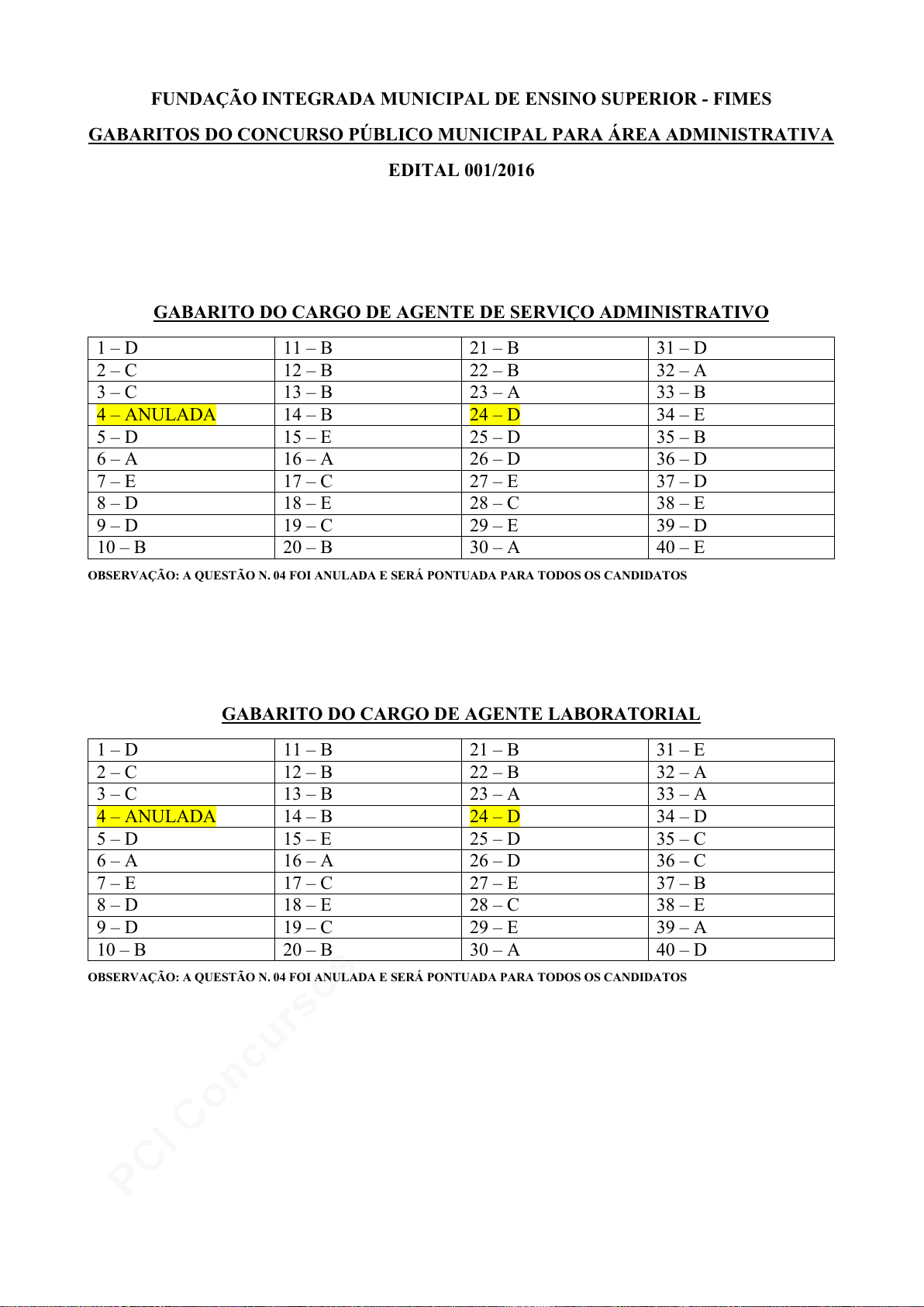 pcimarkpci MjgwNDo2ZmU4OjAxMzI6YzkwMDo3NDFlOjYyZWE6YzQwODpiMTFk:VGh1LCAxOCBEZWMgMjAyNSAwODo1ODowNSAtMDMwMA== www.pciconcursos.com.br FUNDAÇÃO INTEGRADA MUNICIPAL DE ENSINO SUPERIOR - FIMES GABARITOS DO CONCURSO PÚBLICO MUNICIPAL PARA ÁREA ADMINISTRATIVA EDITAL 001/2016 GABARITO DO CARGO DE AGENTE DE SERVIÇO ADMINISTRATIVO 1 – D 11 – B 21 – B 31 – D 2 – C 12 – B 22 – B 32 – A 3 – C 13 – B 23 – A 33 – B 4 – ANULADA 14 – B 24 – D 34 – E 5 – D 15 – E 25 – D 35 – B 6 – A 16 – A 26 – D 36 – D 7 – E 17 – C 27 – E 37 – D 8 – D 18 – E 28 – C 38 – E 9 – D 19 – C 29 – E 39 – D 10 – B 20 – B 30 – A 40 – E OBSERVAÇÃO: A QUESTÃO N. 04 FOI ANULADA E SERÁ PONTUADA PARA TODOS OS CANDIDATOS GABARITO DO CARGO DE AGENTE LABORATORIAL 1 – D 11 – B 21 – B 31 – E 2 – C 12 – B 22 – B 32 – A 3 – C 13 – B 23 – A 33 – A 4 – ANULADA 14 – B 24 – D 34 – D 5 – D 15 – E 25 – D 35 – C 6 – A 16 – A 26 – D 36 – C 7 – E 17 – C 27 – E 37 – B 8 – D 18 – E 28 – C 38 – E 9 – D 19 – C 29 – E 39 – A 10 – B 20 – B 30 – A 40 – D OBSERVAÇÃO: A QUESTÃO N. 04 FOI ANULADA E SERÁ PONTUADA PARA TODOS OS CANDIDATOS pcimarkpci MjgwNDo2ZmU4OjAxMzI6YzkwMDo3NDFlOjYyZWE6YzQwODpiMTFk:VGh1LCAxOCBEZWMgMjAyNSAwODo1ODowNSAtMDMwMA== www.pciconcursos.com.br GABARITO DO CARGO DE AGENTE DE MANEJO RURAL: 1 – C 11 – C 21 – D 31 – D 2 – B 12 – B 22 – E 32 – B 3 – C 13 – C 23 – B 33 – A 4 – B 14 – A 24 – B 34 – E 5 – C 15 – B 25 – D 35 – B 6 – A 16 – C 26 – C 36 – D 7 – D 17 – C 27 – A 37 – B 8 – A 18 – A 28 – B 38 – D 9 – C 19 – C 29 – C 39 – A 10 – E 20 – C 30 – B 40 – B GABARITO DO CARGO DE AGENTE TÉCNICO ADMINISTRATIVO – ASSESSOR JURÍDICO DO NPJ 1 – D 11 – B 21 – A 31 – A 2 – C 12 – B 22 – A 32 – B 3 – A 13 – B 23 – A 33 – A 4 – E 14 – D 24 – B 34 – B 5 – ANULADA 15 – D 25 – D 35 – C 6 – D 16 – B 26 – A 36 – C 7 – A 17 – E 27 – D 37 – D 8 – E 18 – A 28 – D 38 – E 9 – A 19 – C 29 – E 39 – D 10 – B 20 – B 30 – C 40 – B OBSERVAÇÃO: A QUESTÃO N. 05 FOI ANULADA E SERÁ PONTUADA PARA TODOS OS CANDIDATOS GABARITO DO CARGO DE AGENTE TÉCNICO ADMINISTRATIVO - BIBLIOTECÁRIO 1 – D 11 – B 21 – A 31 – B 2 – C 12 – B 22 – A 32 – A 3 – A 13 – B 23 – A 33 – A 4 – E 14 – D 24 – B 34 – D 5 – ANULADA 15 – D 25 – D 35 – D 6 – D 16 – B 26 – A 36 – D 7 – A 17 – E 27 – D 37 – B 8 – E 18 – A 28 – D 38 – A 9 – A 19 – C 29 – E 39 – B 10 – B 20 – B 30 – C 40 – D OBSERVAÇÃO: A QUESTÃO N. 05 FOI ANULADA E SERÁ PONTUADA PARA TODOS OS CANDIDATOS pcimarkpci MjgwNDo2ZmU4OjAxMzI6YzkwMDo3NDFlOjYyZWE6YzQwODpiMTFk:VGh1LCAxOCBEZWMgMjAyNSAwODo1ODowNSAtMDMwMA== www.pciconcursos.com.br GABARITO DO CARGO DE AGENTE TÉCNICO ADMINISTRATIVO – MÉDICO VETERINÁRIO 1 – D 11 – B 21 – A 31 – D 2 – C 12 – B 22 – A 32 – D 3 – A 13 – B 23 – A 33 – C 4 – E 14 – D 24 – B 34 – E 5 – ANULADA 15 – D 25 – D 35 – D 6 – D 16 – B 26 – A 36 – E 7 – A 17 – E 27 – D 37 – A 8 – E 18 – A 28 – D 38 – C 9 – A 19 – C 29 – E 39 – D 10 – B 20 – B 30 – C 40 – E OBSERVAÇÃO: A QUESTÃO N. 05 FOI ANULADA E SERÁ PONTUADA PARA TODOS OS CANDIDATOS GABARITO DO CARGO DE AGENTE TÉCNICO ADMINISTRATIVO – PSICÓLOGO 1 – D 11 – B 21 – A 31 – E 2 – C 12 – B 22 – A 32 – C 3 – A 13 – B 23 – A 33 – E 4 – E 14 – D 24 – B 34 – A 5 – ANULADA 15 – D 25 – D 35 – E 6 – D 16 – B 26 – A 36 – B 7 – A 17 – E 27 – D 37 – C 8 – E 18 – A 28 – D 38 – E 9 – A 19 – C 29 – E 39 – ANULADA 10 – B 20 – B 30 – C 40 – C OBSERVAÇÃO: AS QUESTÕES N. 05 E N. 39 FORAM ANULADAS E SERÃO PONTUADAS PARA TODOS OS CANDIDATOS GABARITO DO CARGO DE AGENTE TÉCNICO ADMINISTRATIVO – ANALISTA DE SISTEMAS 1 – D 11 – B 21 – A 31 – C 2 – C 12 – B 22 – A 32 – E 3 – A 13 – B 23 – A 33 – B 4 – E 14 – D 24 – B 34 – C 5 – ANULADA 15 – D 25 – D 35 – B 6 – D 16 – B 26 – A 36 – B 7 – A 17 – E 27 – D 37 – D 8 – E 18 – A 28 – D 38 – A 9 – A 19 – C 29 – E 39 – D 10 – B 20 – B 30 – C 40 – E OBSERVAÇÃO: A QUESTÃO N. 05 FOI ANULADA E SERÁ PONTUADA PARA TODOS OS CANDIDATOS pcimarkpci MjgwNDo2ZmU4OjAxMzI6YzkwMDo3NDFlOjYyZWE6YzQwODpiMTFk:VGh1LCAxOCBEZWMgMjAyNSAwODo1ODowNSAtMDMwMA== www.pciconcursos.com.br GABARITO DO CARGO DE AGENTE TÉCNICO ADMINISTRATIVO – CONTADOR 1 – D 11 – B 21 – A 31 – C 2 – C 12 – B 22 – A 32 – B 3 – A 13 – B 23 – A 33 – B 4 – E 14 – D 24 – B 34 – E 5 – ANULADA 15 – D 25 – D 35 – B 6 – D 16 – B 26 – A 36 – D 7 – A 17 – E 27 – D 37 – A 8 – E 18 – A 28 – D 38 – C 9 – A 19 – C 29 – E 39 – B 10 – B 20 – B 30 – C 40 – C OBSERVAÇÃO: A QUESTÃO N. 05 FOI ANULADA E SERÁ PONTUADA PARA TODOS OS CANDIDATOS GABARITO DO CARGO DE TÉCNICO E INTÉRPRETE DE LINGUAGEM DE SINAIS 1 – D 11 – B 21 – B 31 – C 2 – C 12 – B 22 – B 32 – B 3 – C 13 – B 23 – A 33 – D 4 – ANULADA 14 – B 24 – D 34 – A 5 – D 15 – E 25 – D 35 – ANULADA 6 – A 16 – A 26 – D 36 – B 7 – E 17 – C 27 – E 37 – B 8 – D 18 – E 28 – C 38 – D 9 – D 19 – C 29 – E 39 – A 10 – B 20 – B 30 – A 40 – B OBSERVAÇÃO: AS QUESTÕES N. 04 E N.35 FORAM ANULADAS E SERÃO PONTUADAS PARA TODOS OS CANDIDATOS GABARITO DO CARGO DE MOTORISTA 1 – D 11 – A 21 – E 31 – A 2 – C 12 – D 22 – C 32 – A 3 – C 13 – E 23 – B 33 – C 4 - ANULADA 14 – B 24 – E 34 – A 5 – D 15 – B 25 – B 35 – D 6 – A 16 – B 26 – A 36 – B 7 – E 17 – B 27 – B 37 – B 8 – D 18 – E 28 – B 38 –