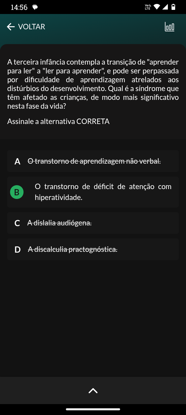 14:56 LTE VOLTAR A terceira infância contempla a transição de "aprender para ler" a "ler para aprender", e pode ser perpassada por dificuldade de aprendizagem atrelados aos distúrbios do desenvolvimento. Qual é a síndrome que têm afetado as crianças, de modo mais significativo nesta fase da vida? Assinale a alternativa CORRETA A transtorno de aprendizagem não verbal. transtorno de déficit de atenção com hiperatividade. c A dislalia audiógena. D A discalculia practognóstica.