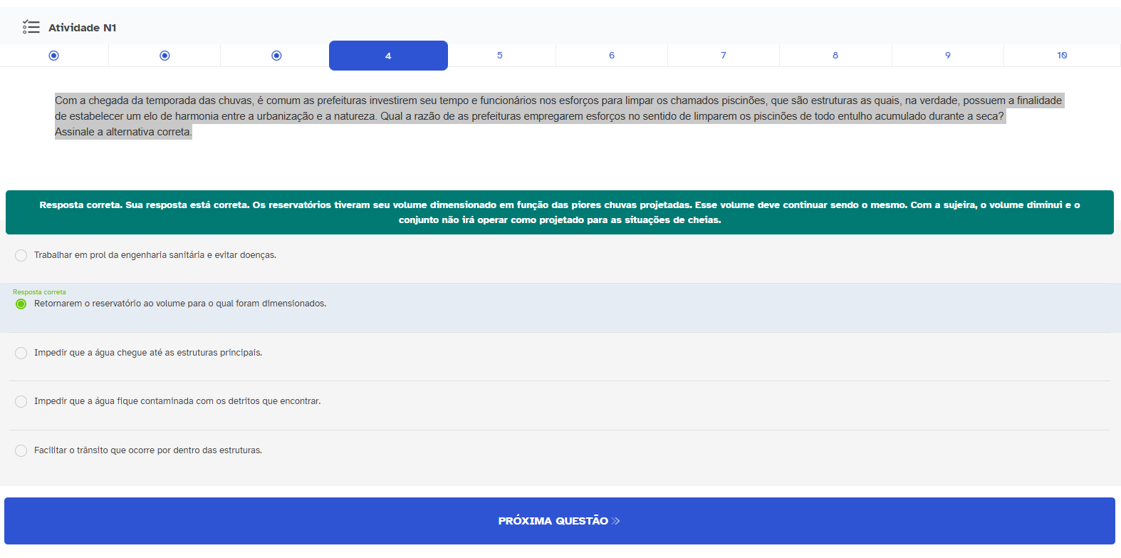Atividade N1 4 5 6 7 8 9 10 Com a chegada da temporada das chuvas, é comum as prefeituras investirem seu tempo e funcionários nos esforços para limpar chamados piscinões, que são estruturas as quais, na verdade, possuem a finalidade de estabelecer um elo de harmonia entre a urbanização e a natureza. Qual a razão de as prefeituras empregarem esforços no sentido de limparem os piscinões de todo entulho acumulado durante a seca? Assinale a alternativa correta. Resposta correta. Sua resposta está correta. Os reservatórios tiveram seu volume dimensionado em função das piores chuvas projetadas. Esse volume deve continuar sendo mesmo. Com a sujeira, volume diminui e conjunto não irá operar como projetado para as situações de cheias. Trabalhar em prol da engenharia sanitária e evitar doenças. Resposta correta Retornarem reservatório ao volume para 0 qual foram dimensionados. Impedir que a água chegue até as estruturas principais. Impedir que a água fique contaminada com detritos que encontrar. Facilitar O transito que ocorre por dentro das estruturas. PRÓXIMA QUESTÃO
