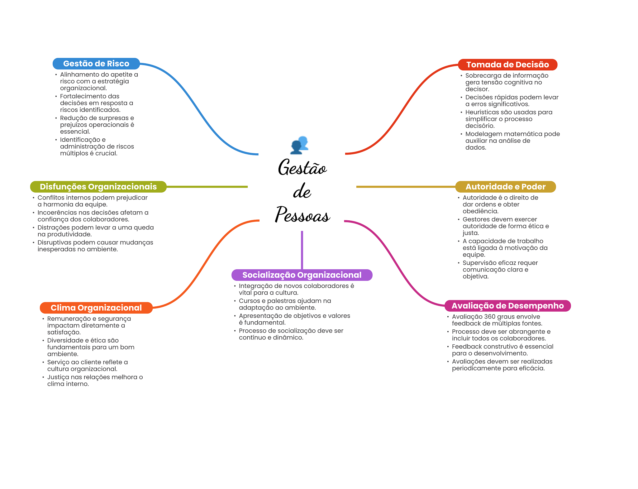 Gestão de Risco Tomada de Decisão Alinhamento do apetite a Sobrecarga de informação risco com a estratégia gera tensão cognitiva no organizacional. decisor. Fortalecimento das Decisões rápidas podem levar decisões em resposta a a erros significativos. riscos identificados. são usadas para Redução de surpresas e simplificar processo prejuízos operacionais é decisório. essencial. Modelagem matemática pode Identificação e auxiliar na análise de administração de riscos dados. múltiplos é crucial. Gestão Disfunções Organizacionais de Autoridade e Poder Conflitos internos podem prejudicar Autoridade é direito de a harmonia da equipe. dar ordens e obter Incoerências nas decisões afetam a confiança dos colaboradores. Pessoas obediência. Gestores devem exercer Distrações podem levar a uma queda autoridade de forma ética e na produtividade. justa. Disruptivas podem causar mudanças A capacidade de trabalho inesperadas no ambiente. está ligada à motivação da equipe. Supervisão eficaz requer comunicação clara e Socialização Organizacional objetiva. Integração de novos colaboradores é vital para a cultura. Cursos e palestras ajudam na Clima Organizacional adaptação ao ambiente. Avaliação de Desempenho Remuneração e segurança Apresentação de objetivos e valores Avaliação 360 graus envolve é fundamental. impactam diretamente a feedback de múltiplas fontes. satisfação. Processo de socialização deve ser Processo deve ser abrangente e Diversidade e ética são contínuo e dinâmico. incluir todos colaboradores. fundamentais para um bom Feedback construtivo é essencial ambiente. para desenvolvimento. Serviço ao cliente reflete a Avaliações devem ser realizadas cultura organizacional. periodicamente para eficácia. Justiça nas relações melhora clima interno.